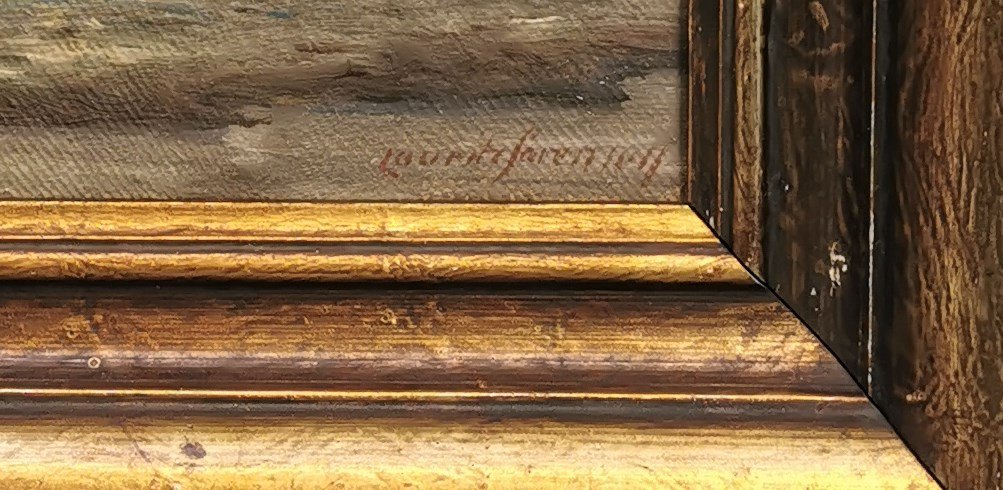 Marine painting with motif from the coast with sailing ship in sight. Painted by Lauritz Sørensen (1882-1952) Frame dimensions: 30 x 33 cm