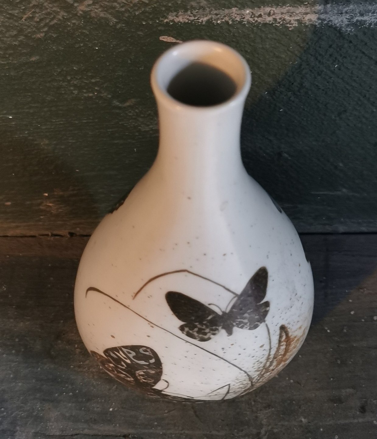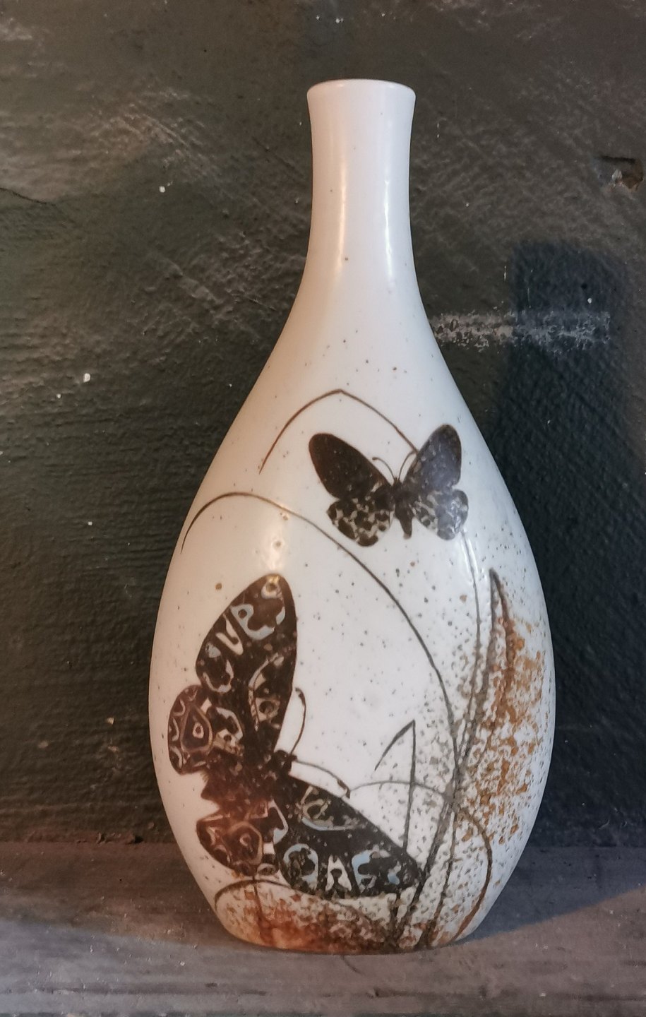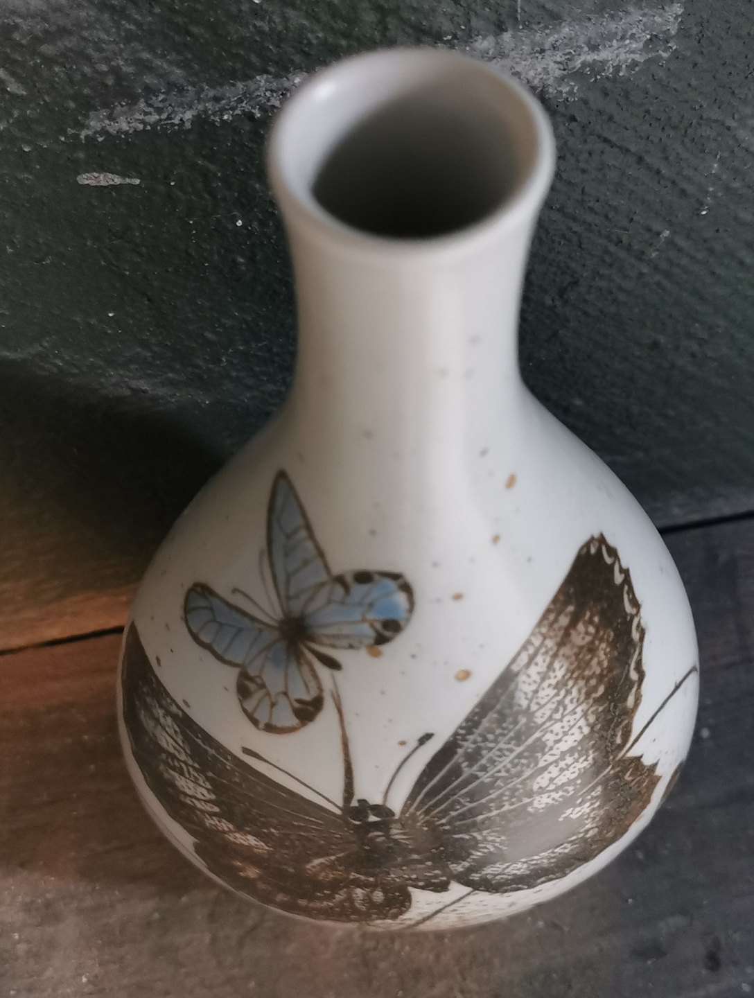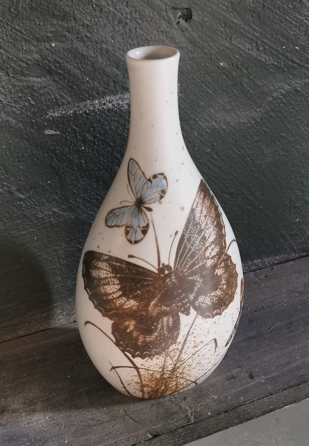 Dråbeformet vase i fajance fra Royal Copenhagen. Dekoreret med sommerfugle. Designet af Nils Thorsson. Fremstår i perfekt stand uden skader eller reparationer. 1. sortering. Mål: H. 23½ cm