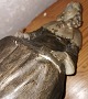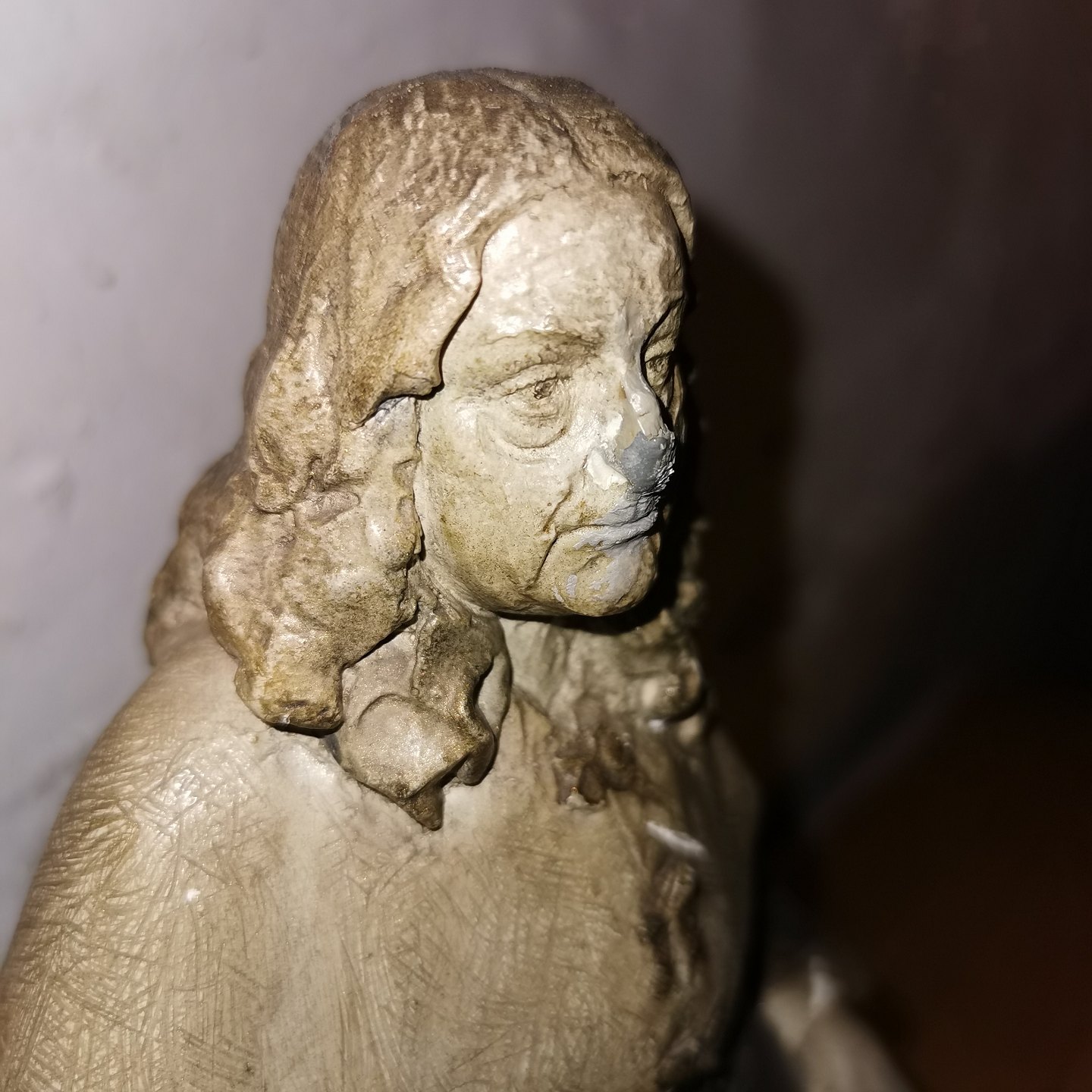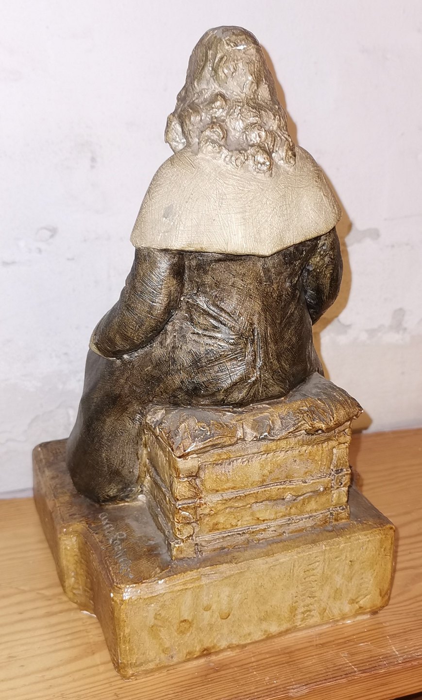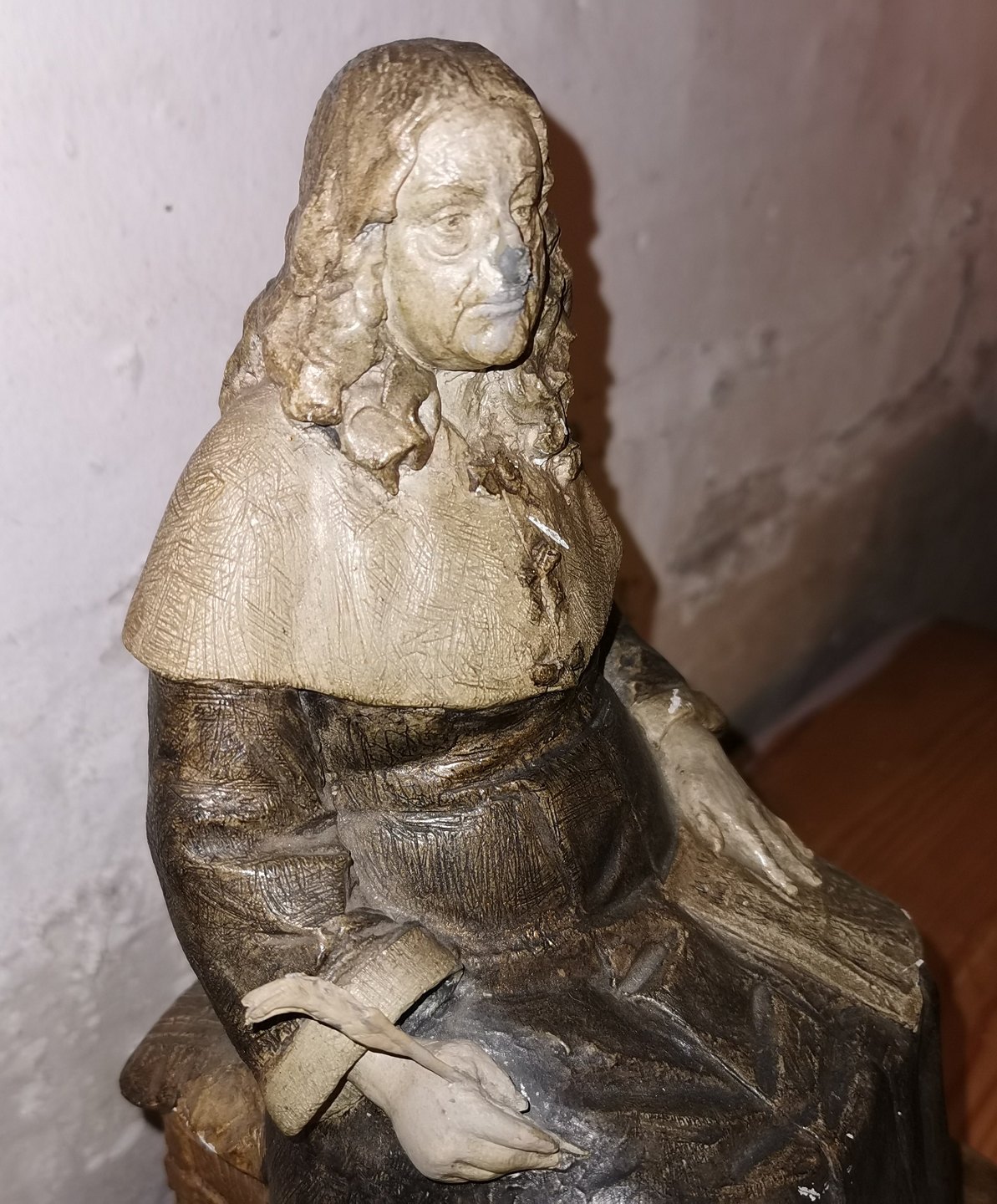 Figure in painted plaster depicting Leonora Christina in Blåtårn (Blue Tower, with the quill in her right hand, where she writes Jammersminde. Attributed to Axel Locher (1879-1941), who i.a. known for having created a series of similar characters from Holberg's comedies. The figure has a defect on the nose and on the edge of the papers she is sitting with in her left hand. Not signed! The figure is 30 cm high and the base measures 18 x 18 cm.