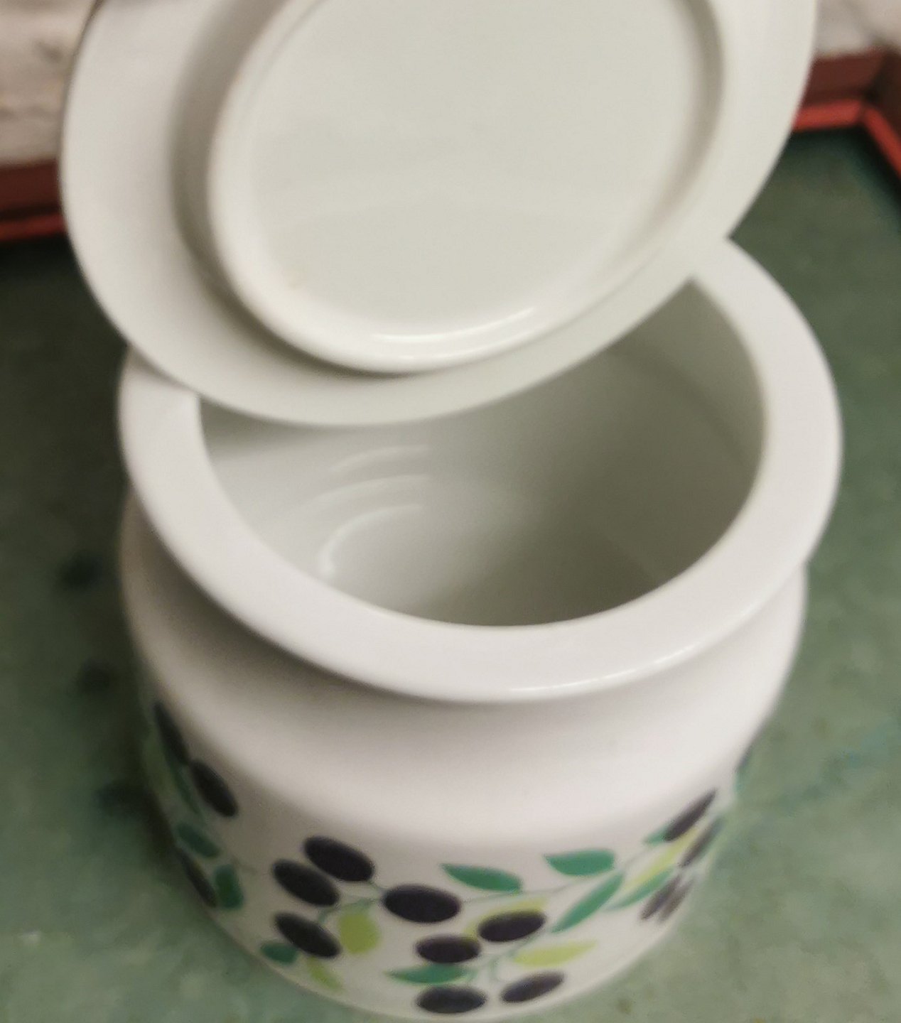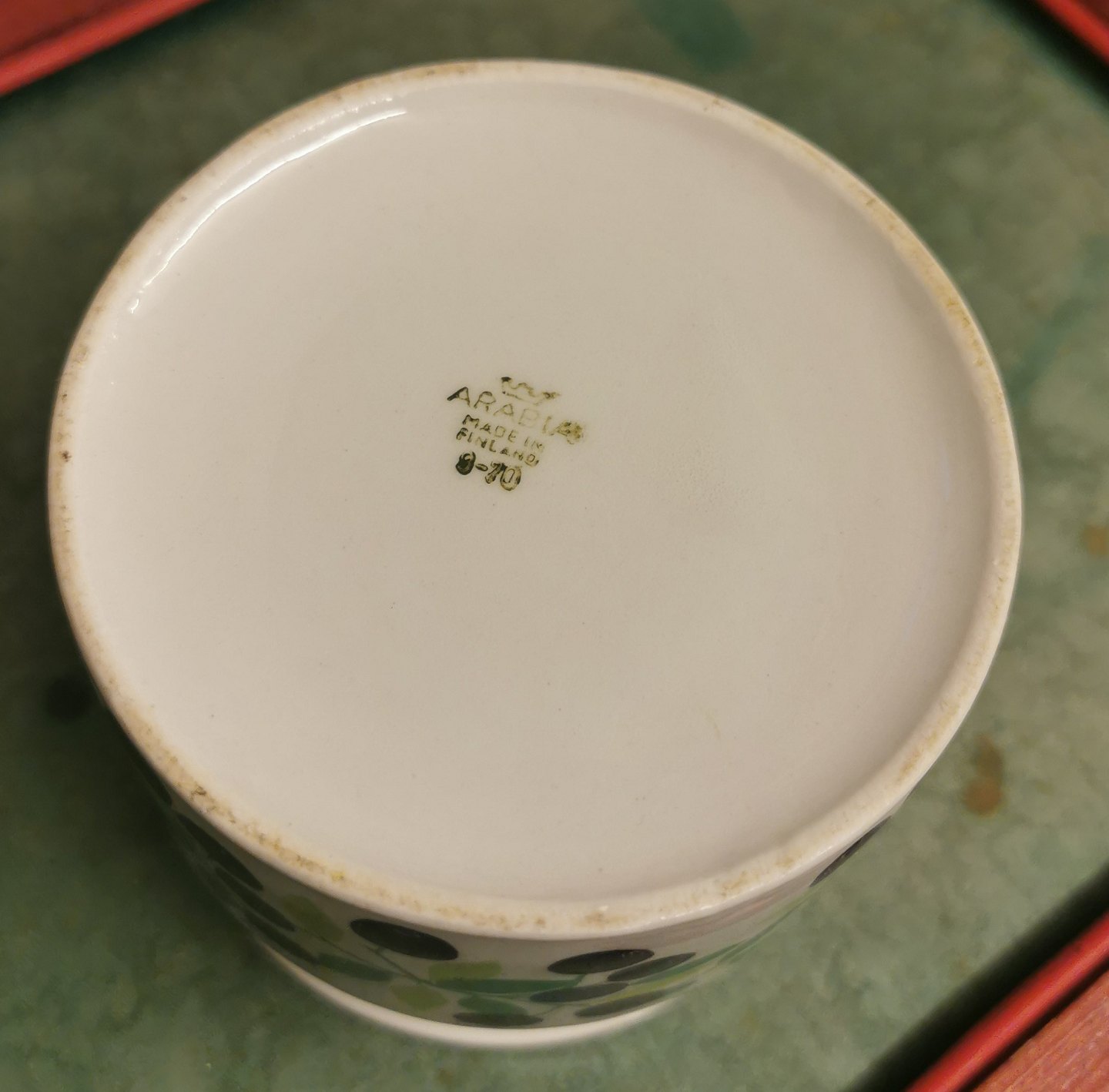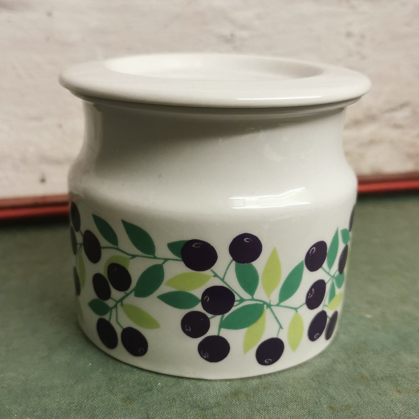 Krukke med låg til solbær marmelade fra den finske porcelænsfabrik Arabia. Fremstår i god stand uden skader eller reparationer. Fabriksmærket på bunden. H. 9 cm