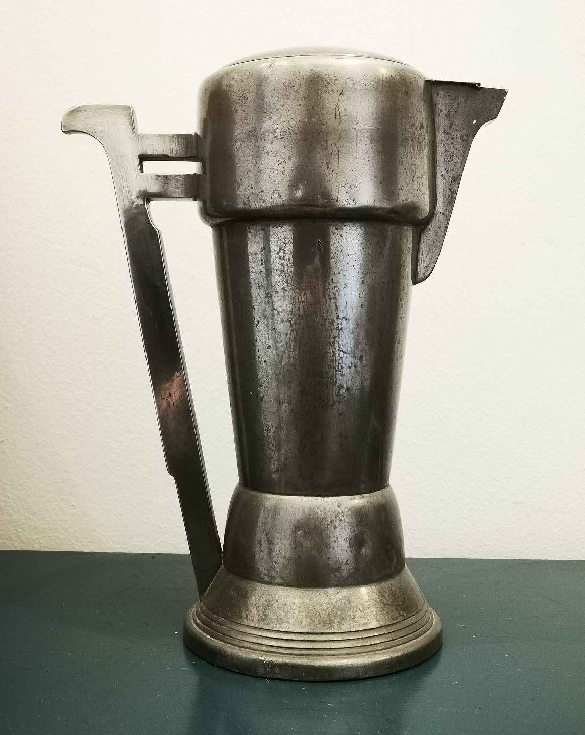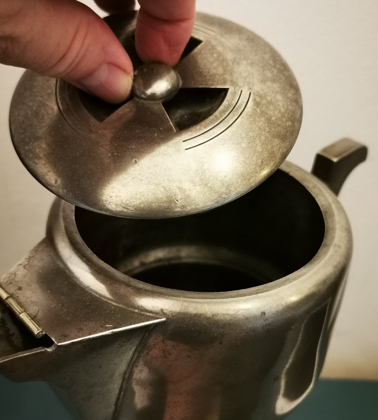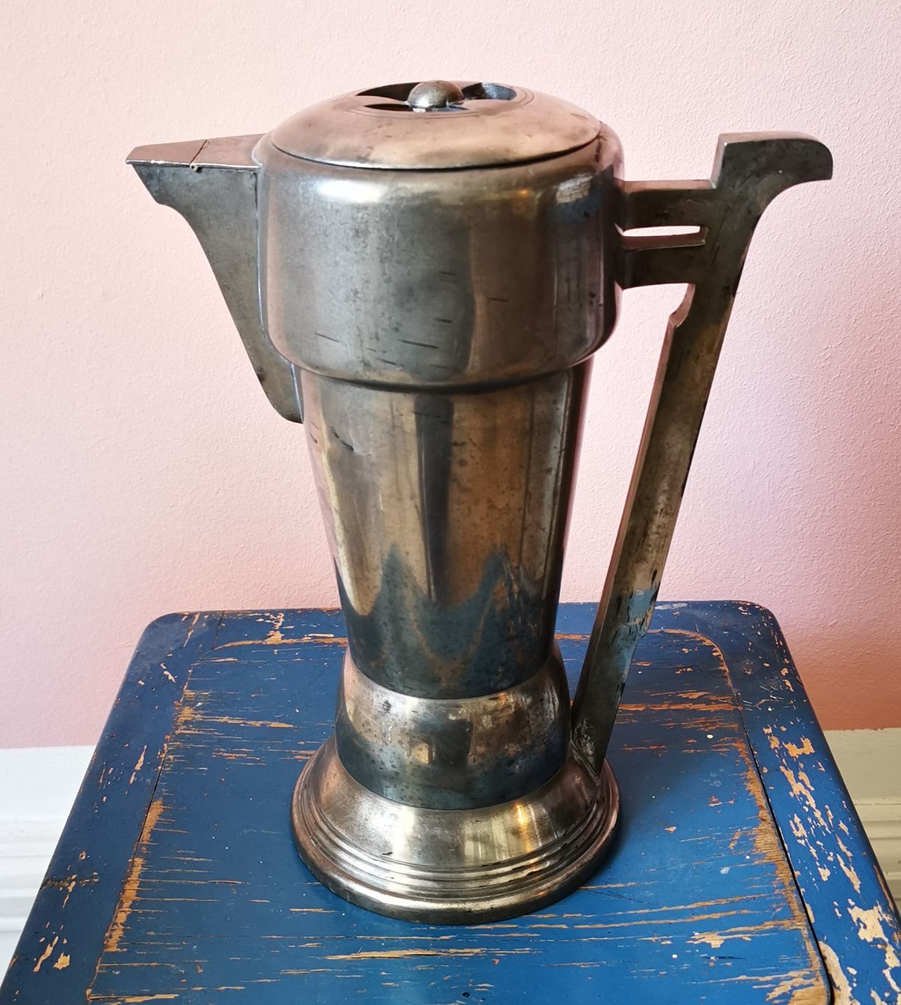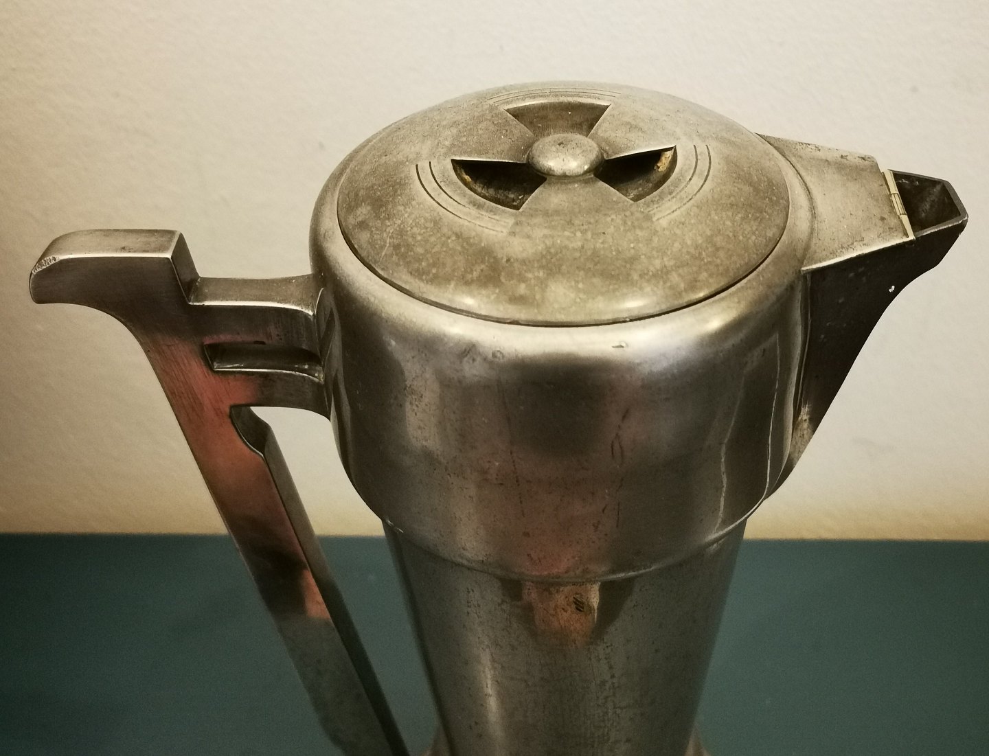 Fremstår i god stand med almindeligt aldersrelateret brugsslid. Ingen skader eller reparationer. Fabriksmærket på bunden med MB 4. Kanden er 30 cm høj.