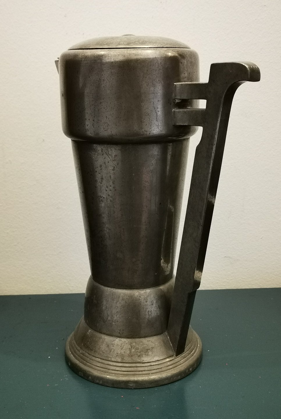 Øl- eller dåbskande i tin fra Mogens Balling´s værksted i København. Designet af billedhuggeren Siegfried Wagner omkring 1900. Var med på Kunstindustrimuseets udstilling af moderne dansk kunsthåndværk i efteråret 1901 sammen med mange andre genstande fra Ballins værksted.