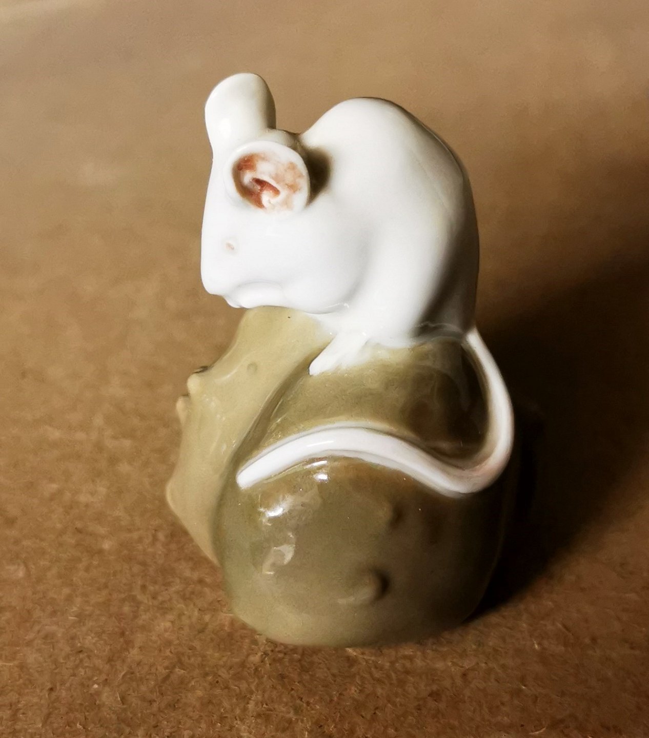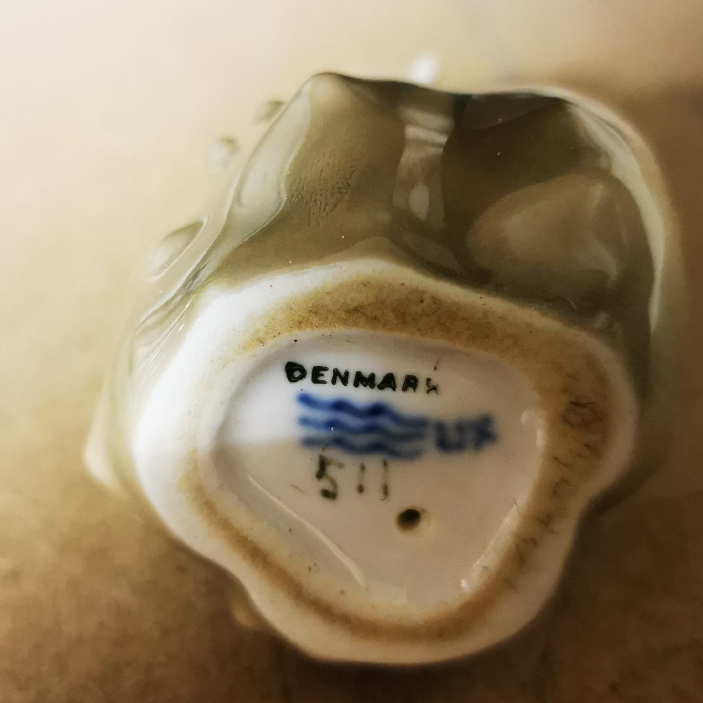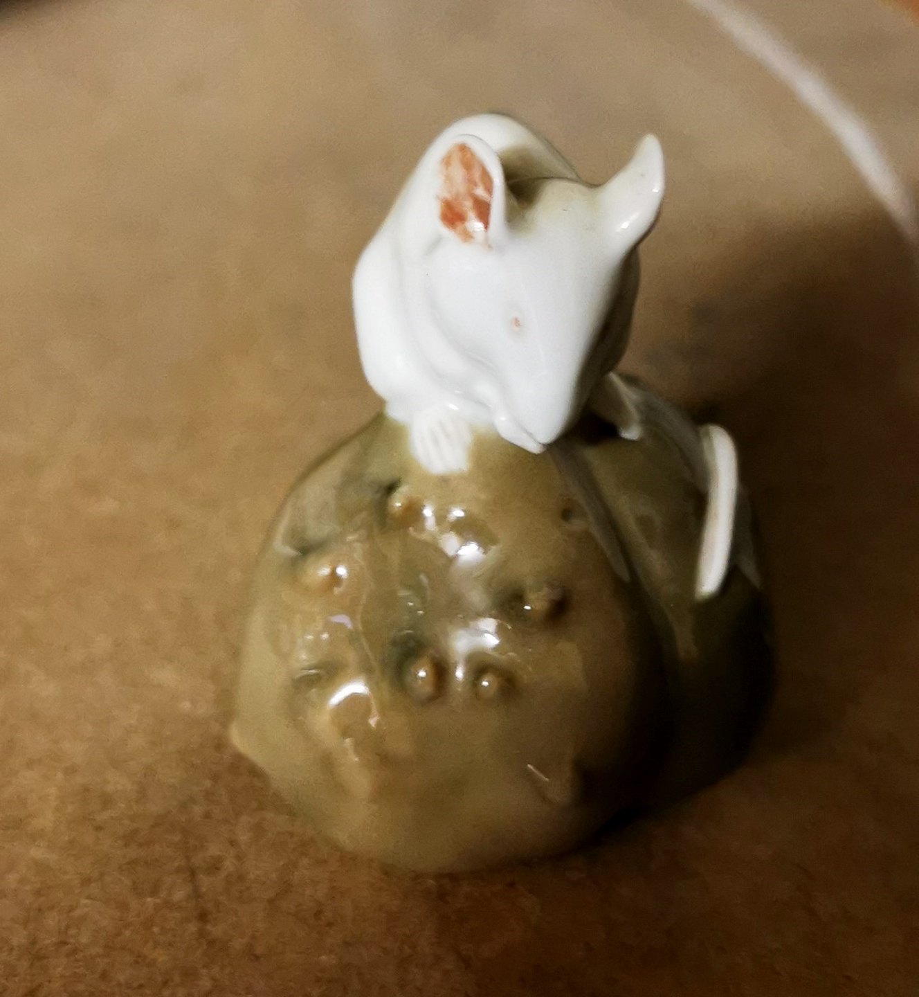 Figur af mus siddende på kastanje fra Royal Copenhagen. Fremstår i god stand uden skader eller reparationer. Modelnummer 511. H. 7 cm.