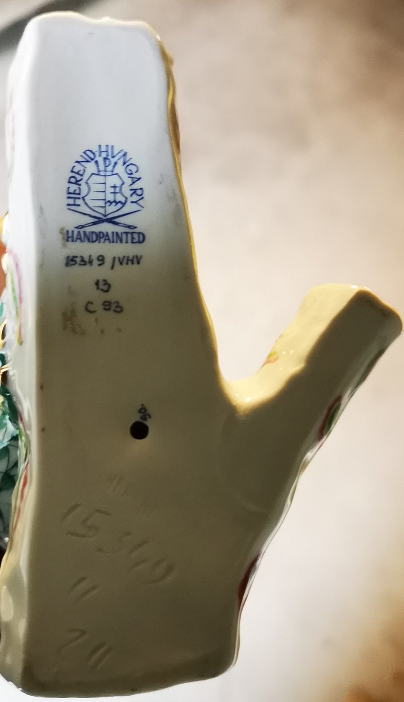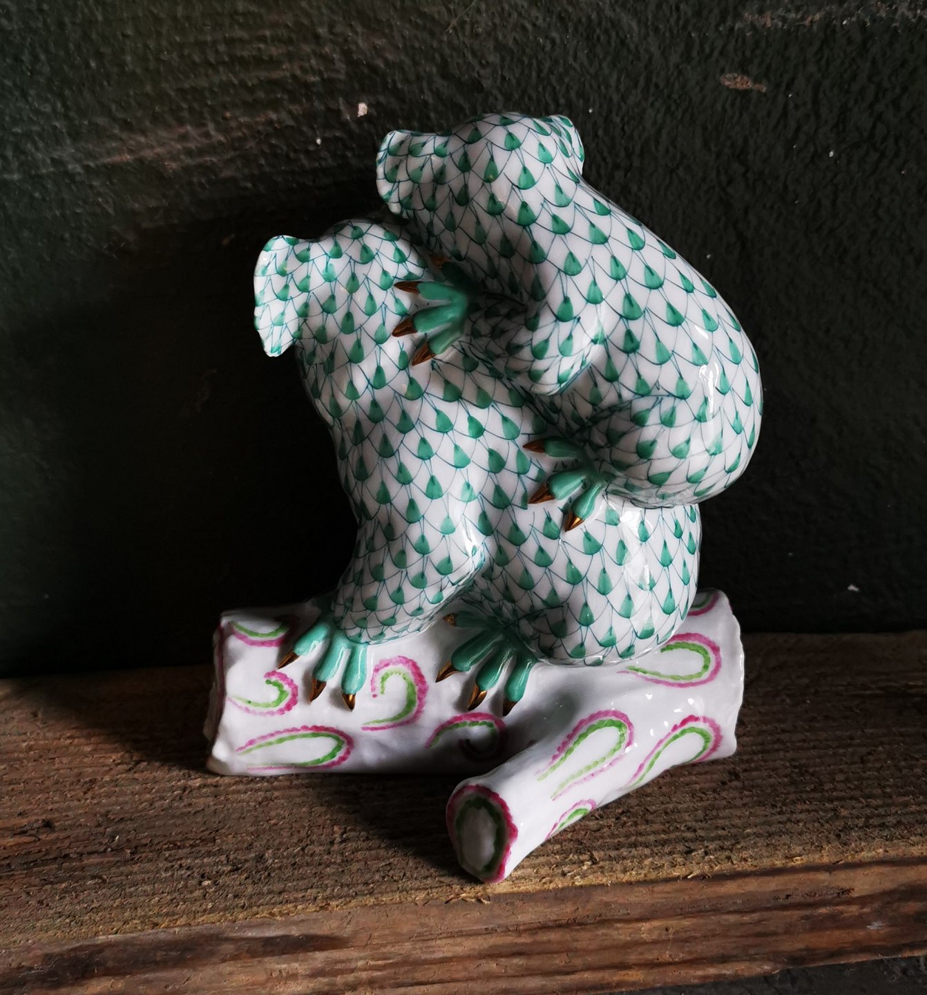 Pair of koala bears - mother and young - in porcelain from the Herend factory in Hungary. "Fishing net" decoration. The couple is sitting on a branch. Appears in perfect condition. The factory mark on the bottom. Model number 15349 / VHV 13 C93. H. 13½ cm and 11½ cm long.