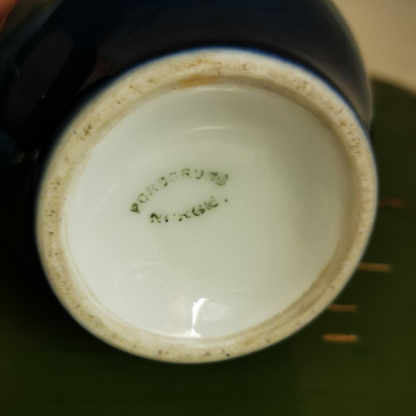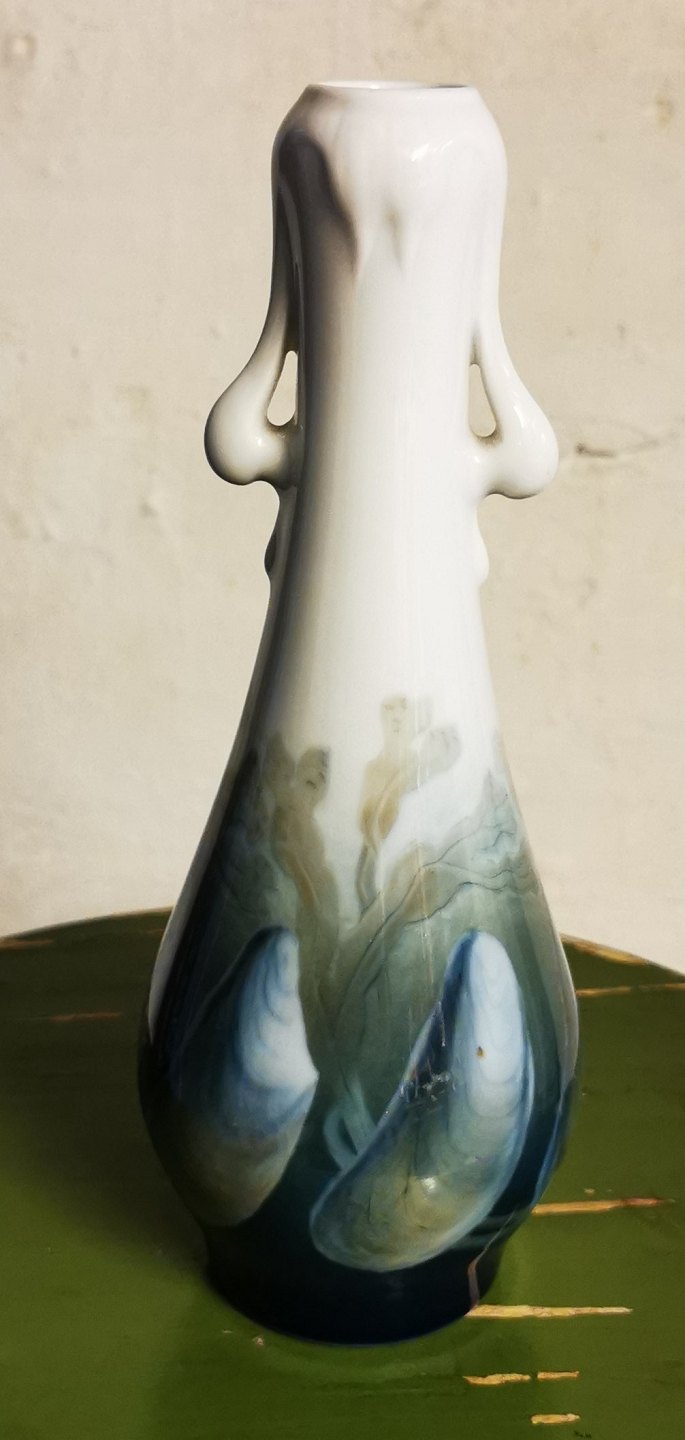 Høj Slank dråbeformet vase i porcelæn med par hanke. Dekoreret med muslingeskaller rundt om vasen. Fremstillet omkring 1910. Fremstår i perfekt stand. Fabriksmærket på bunden med PORSGRUND NORGE. H. 22 cm.
