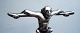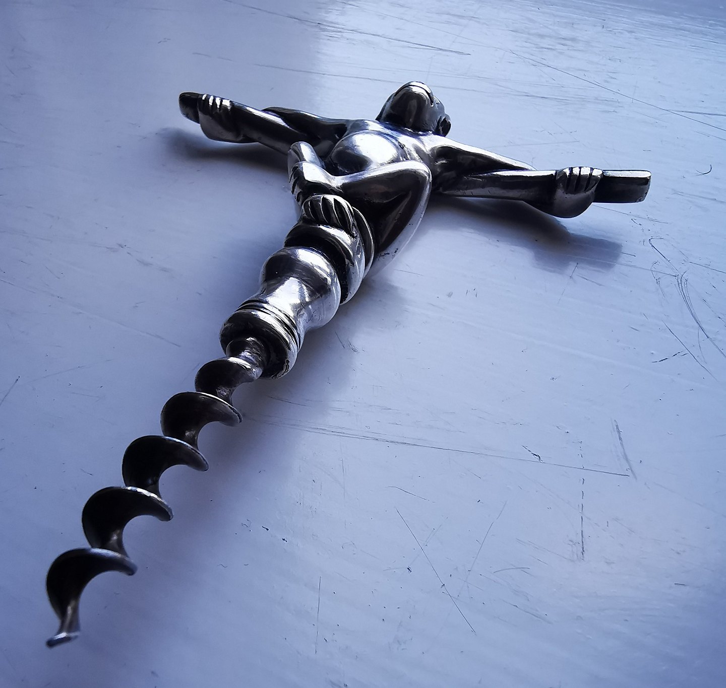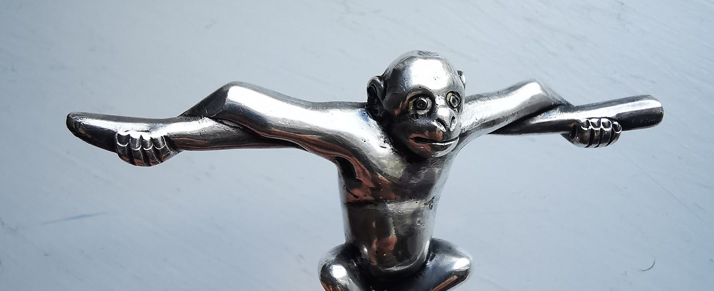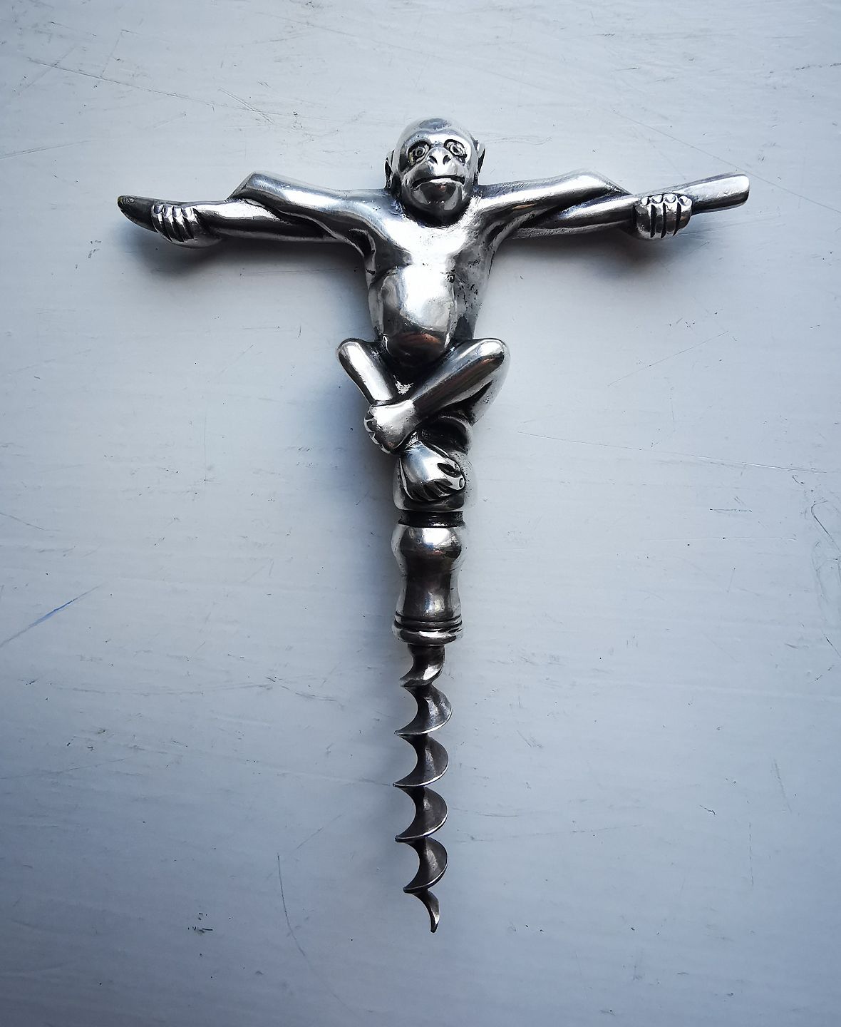 Figurativ proptrækker med abe, der sidder afslappende på en kugle. Flot kvalitet. Kraftig sølv-belægning. Ingen steder slidt igennem. I virkelig flot stand. Ikke fabriksmærket, men forventes at være fremstillet i Danmark i 1930´erne. Lignende proptrækker findes i bronze. Mål: H. 12½ cm, 9½ cm bred.