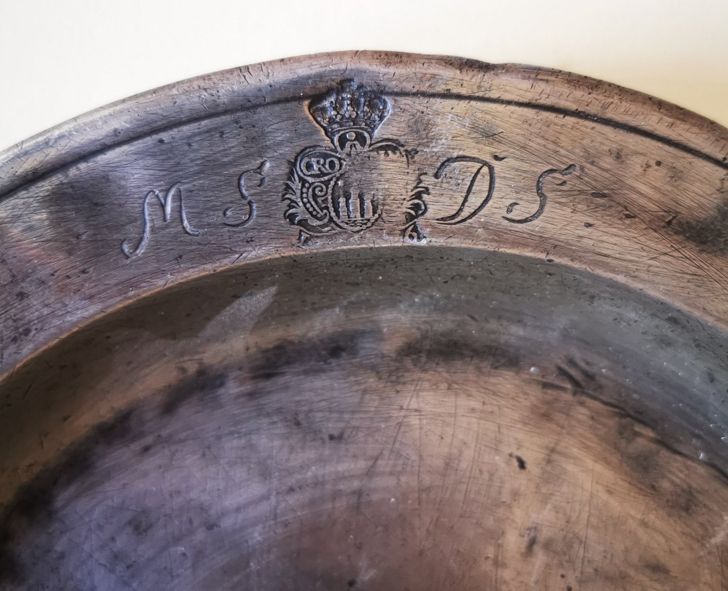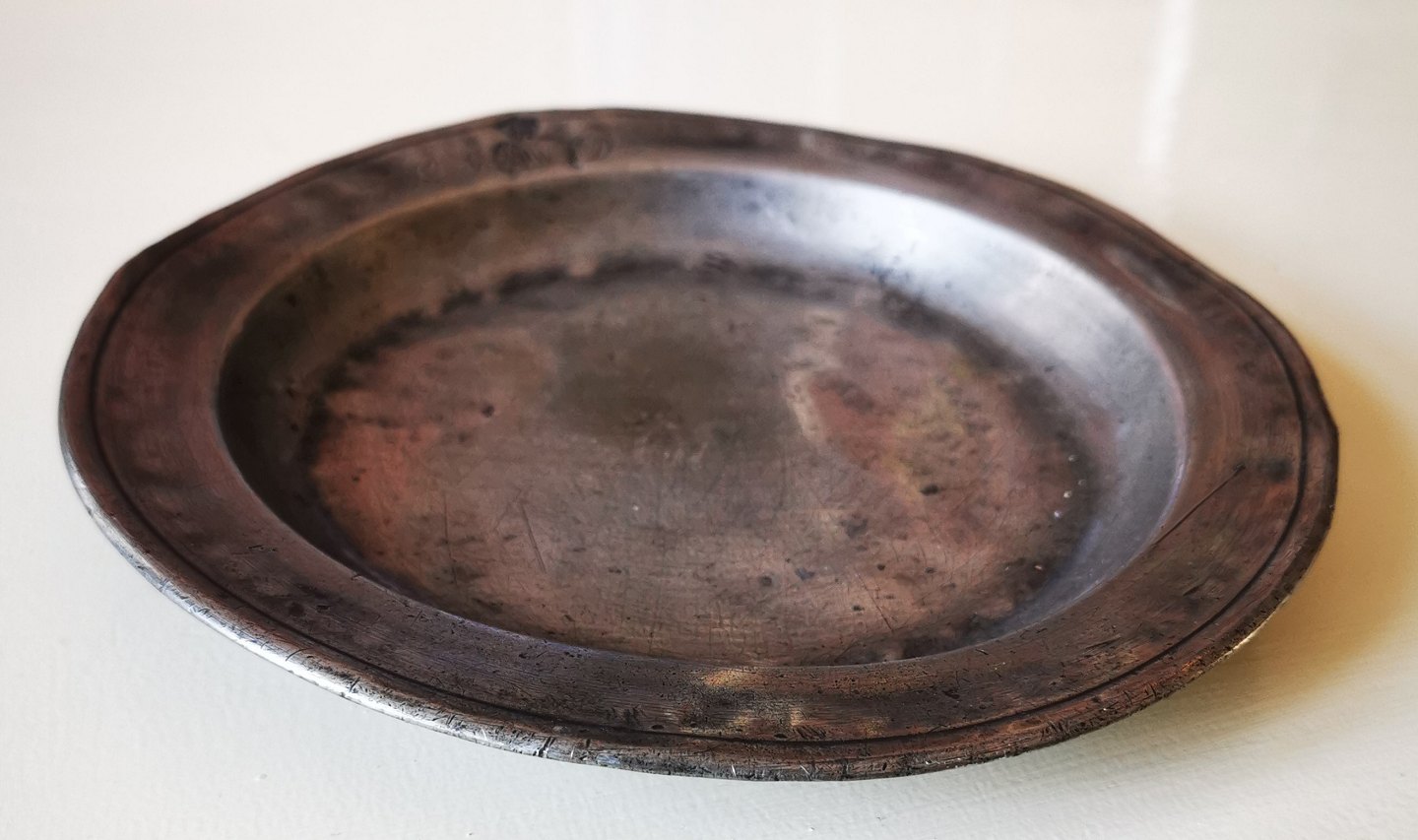 Dansk tallerken i tin med "københavnerstempel" Tre tårne samt utydeligt årstal 1746. Tillige monogram M.S samt D.S. Mulig bryllupsgave. I god stand. Ingen skader eller reparationer. Mål: H. 3 cm Ø. 23½ cm.