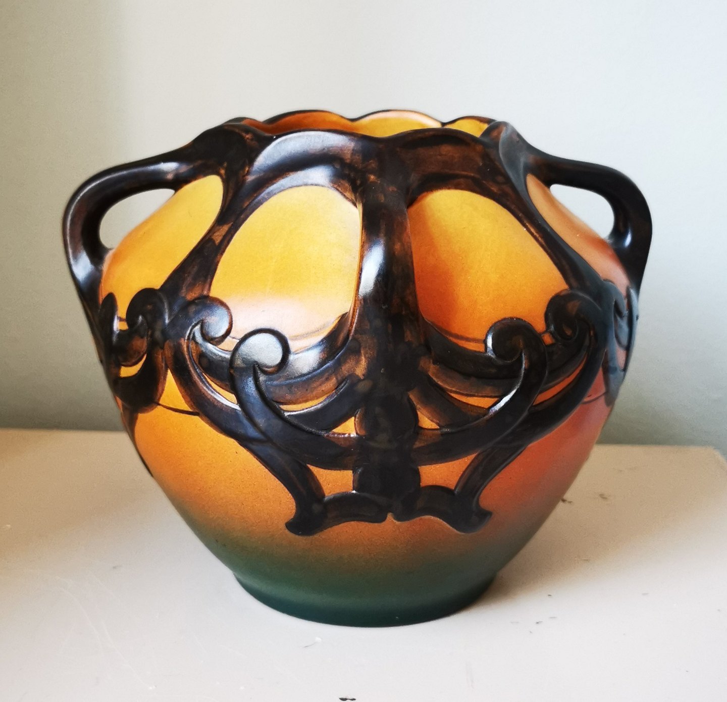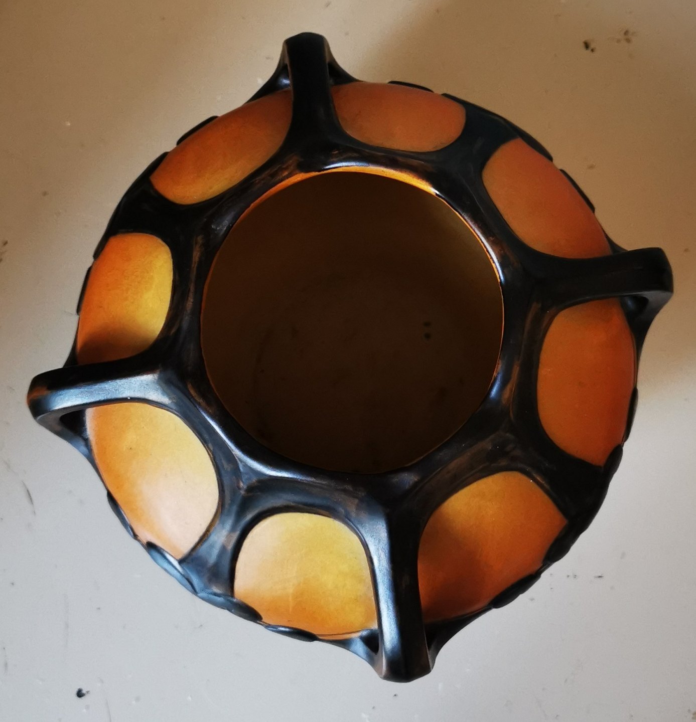 SKØNVIRKESTIL: Krukke i keramik fra den københavnske lervarefabrik Peter Ipsens Enke. Formgivet af Karen Hagen i 1909. Orange med sort ornamentik i relief samt dekorative hanke. Fremstår i absolut perfekt stand. Fabriksmærket på bunden med bl.a modelnummer 710. Mål: H. 16½ cm.