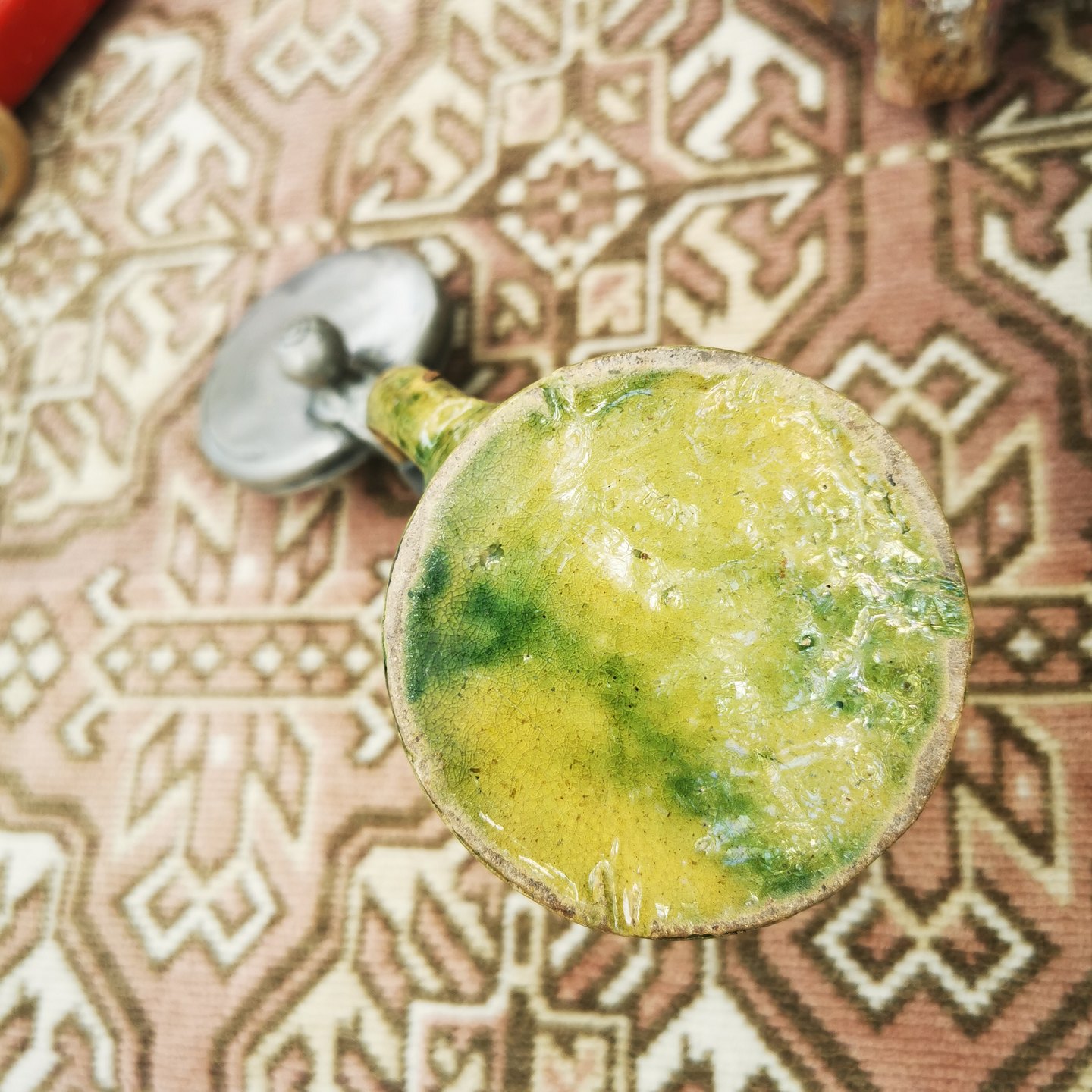 Keramik krus i Grøn glasur med låg i tin. I god stand. Fremstillet omkring 1850