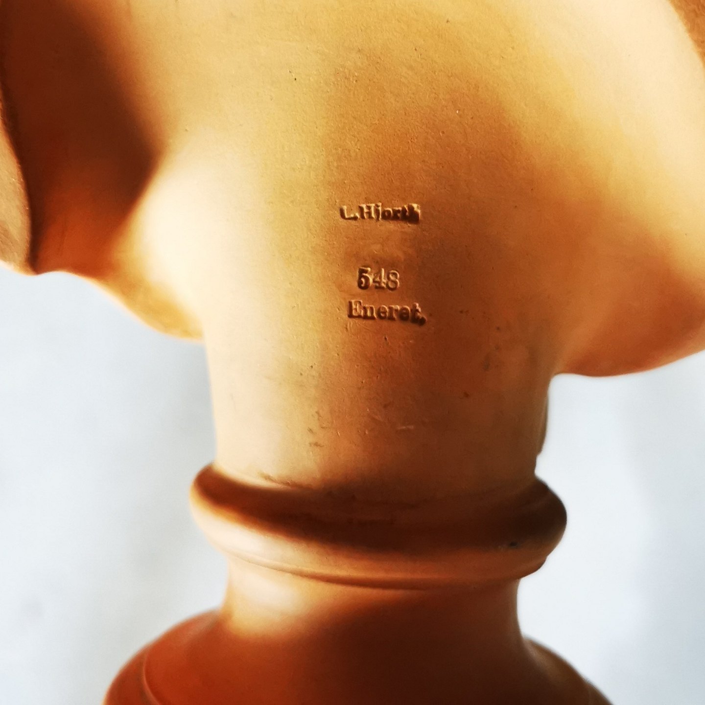 Bust of man in teracotta from Lauritz Hjorth. Made around 1900. In good condition without damage or repairs. The factory mark on the back. H. 22½ cm.
