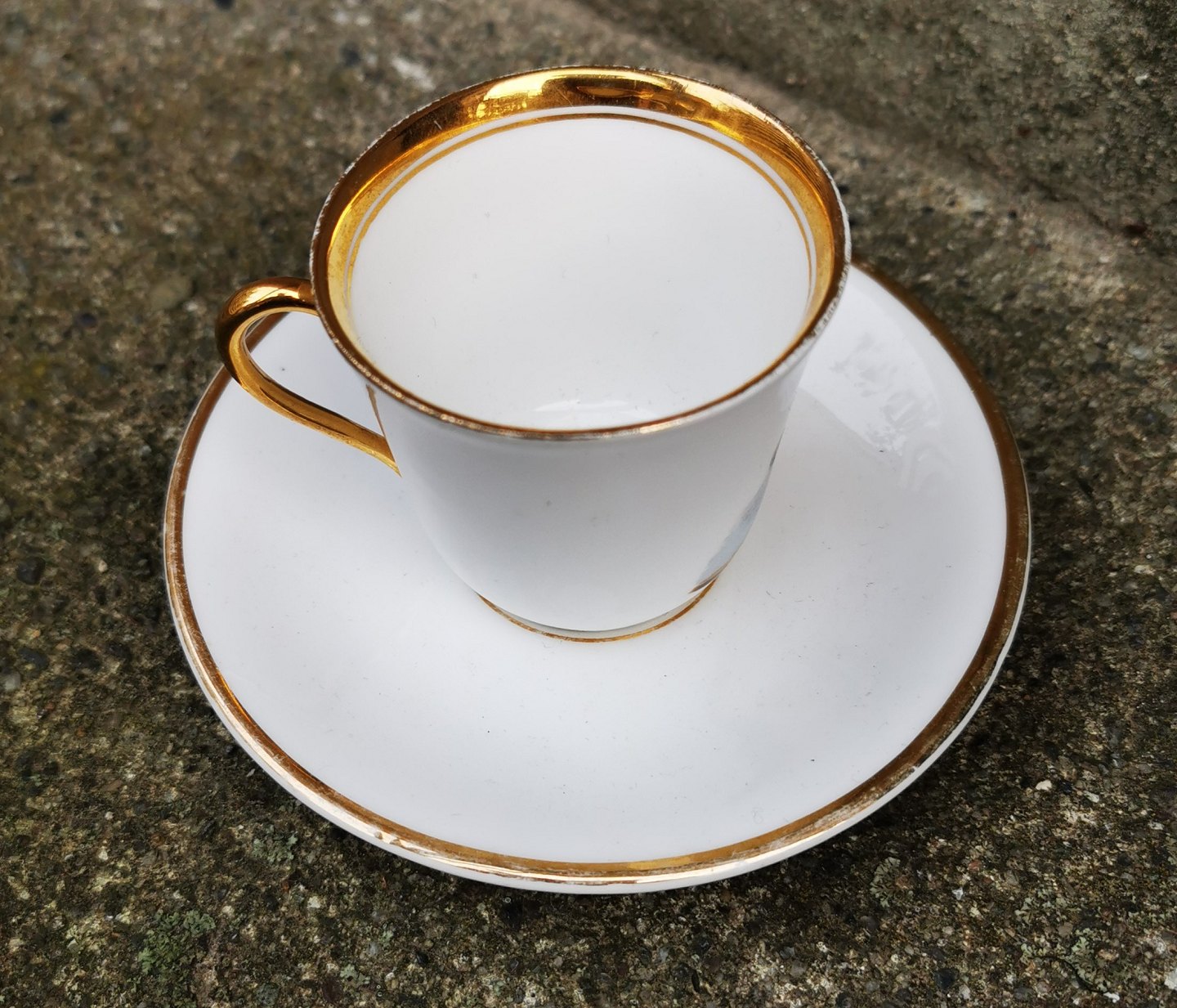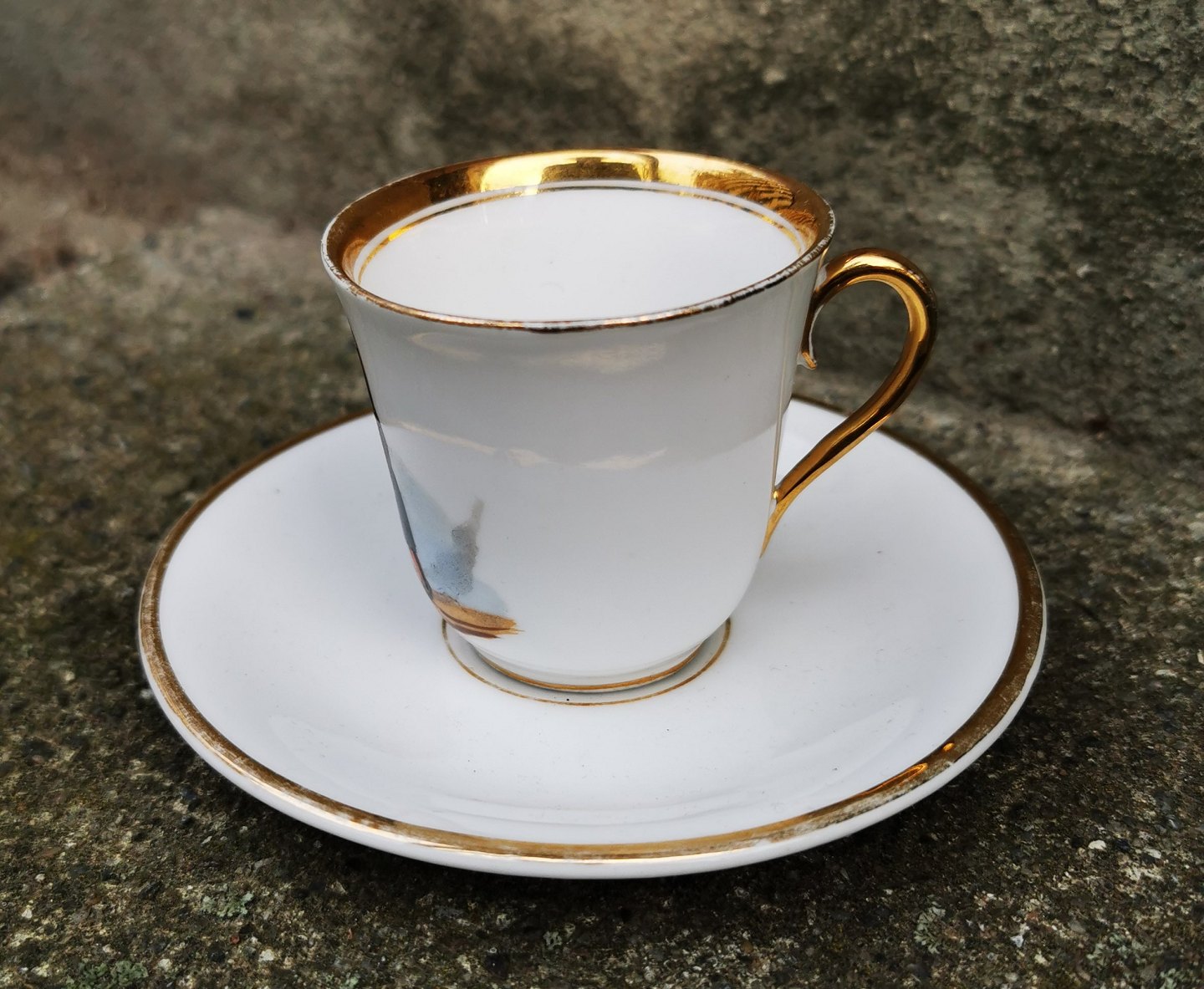 Lille moccakop i porcelæn fra C.T. Dekoreret med nisse gående med sin rissengrød ! I god stand. Ingen skader eller reparationer. Fremstillet omkring 1900. Koppen er 5½-6 cm høj og underkoppen 11½ cm i diameter.