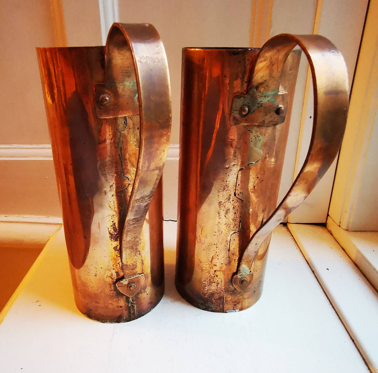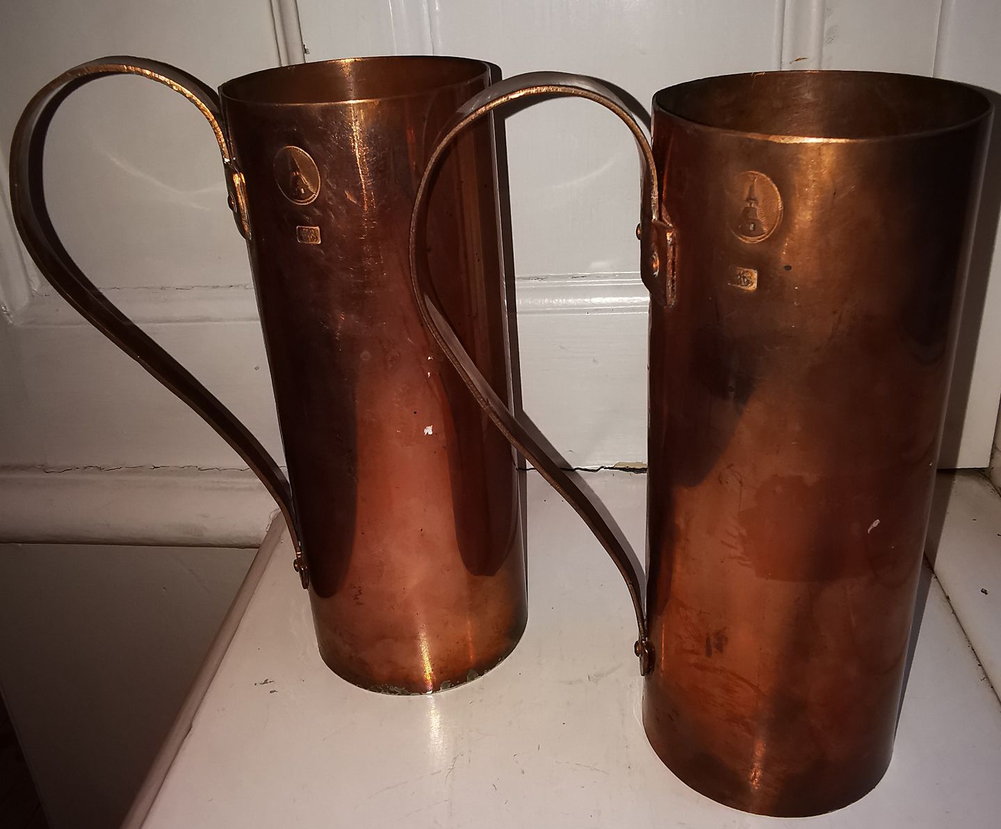 Par høje slanke cylinderiske målebægere med hanke. Fremstillet i 19. århundrede. Begge i god stand. Fine stempler. H. 20-20½ cm.