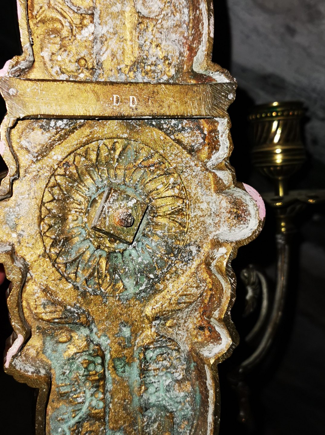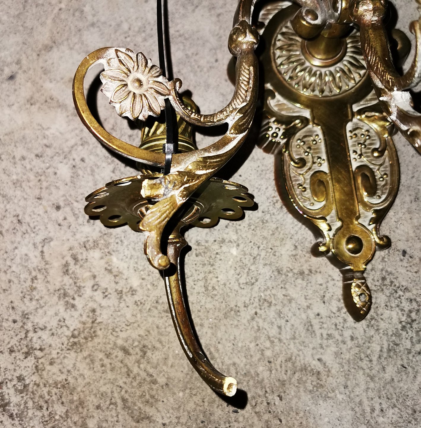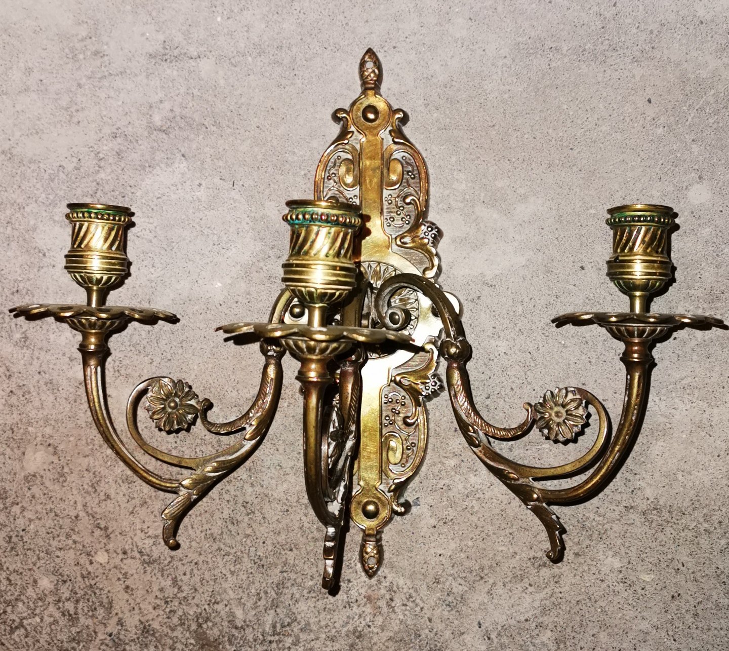 Pair of wall bronze candelabra for three candles. Made in France in the second half of the 19th Century. One light arm broken off, as can be seen from the photos. Otherwise in good condition. Measurements: The back piece is 31� cm. From the wall and out to the front candleholder there are 25 cm.
