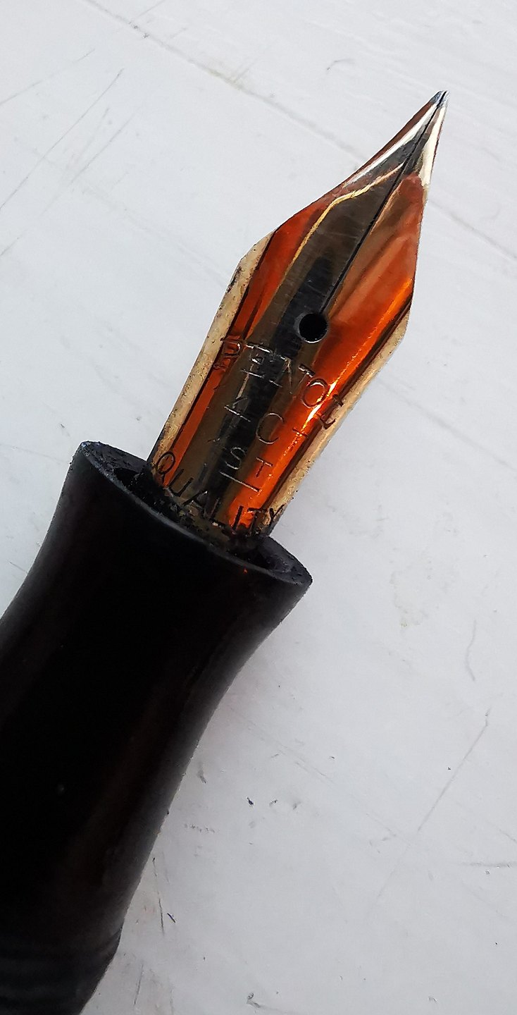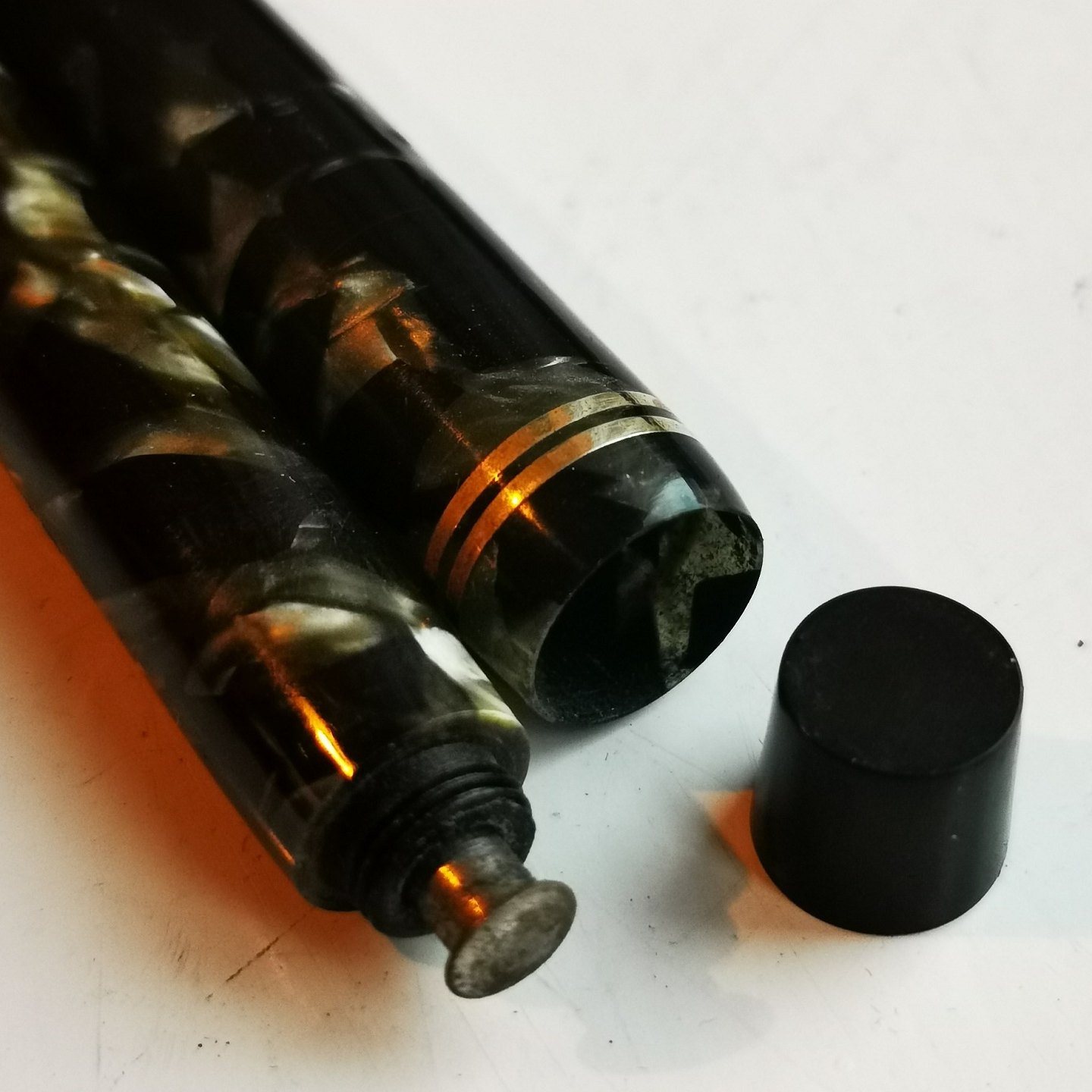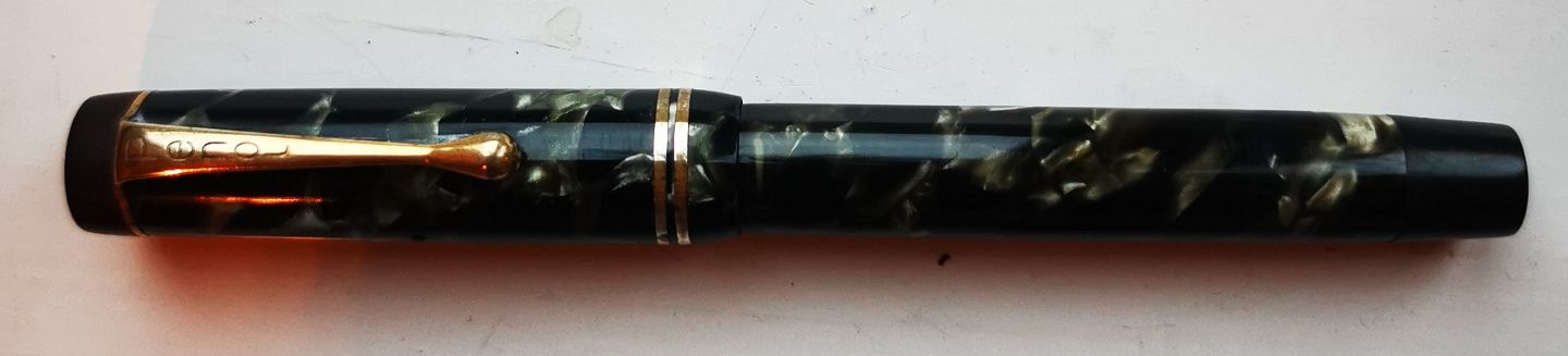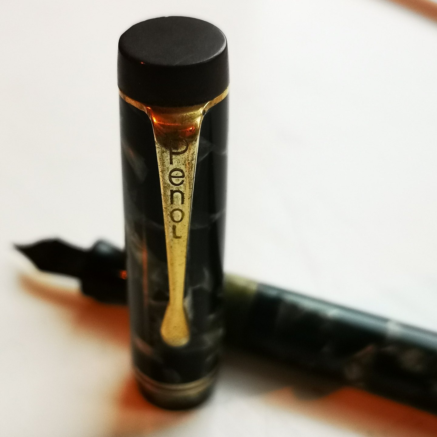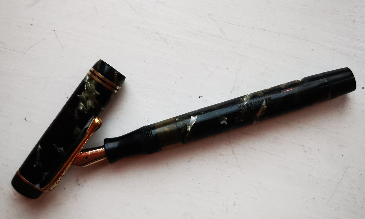 Green marbled Penol no. 3 fountain pens. Text on the fountain pen: PENOL NO. 3. CHR. OLSENS FACTORIES. COPENHAGEN. PAT. APPLIED. Made in the 1940s. Appears in good condition without damage or repairs. New rubber bag must be inserted before use. For an additional DKK 325.00, the fountain pen can be delivered with a new rubber bag. All parts original Writer including 14 carat gold tip. 13.5 cm long.