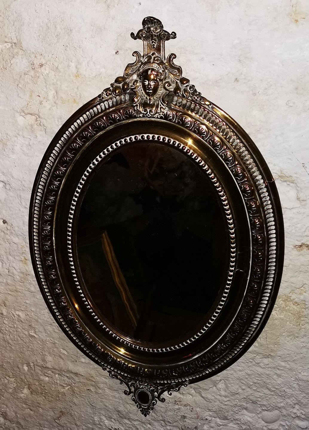 Ovalt spejl i kobber. Fremstillet omkring 1900 (1890-1910). Fremstår i god stand. Mål: H. 54½ cm B: 43 cm.