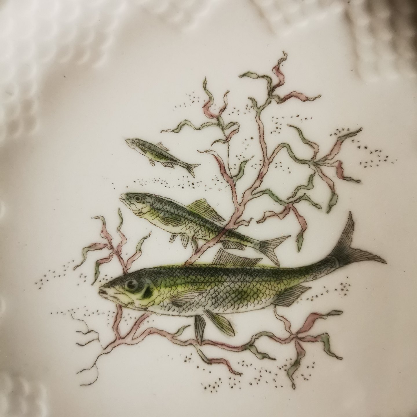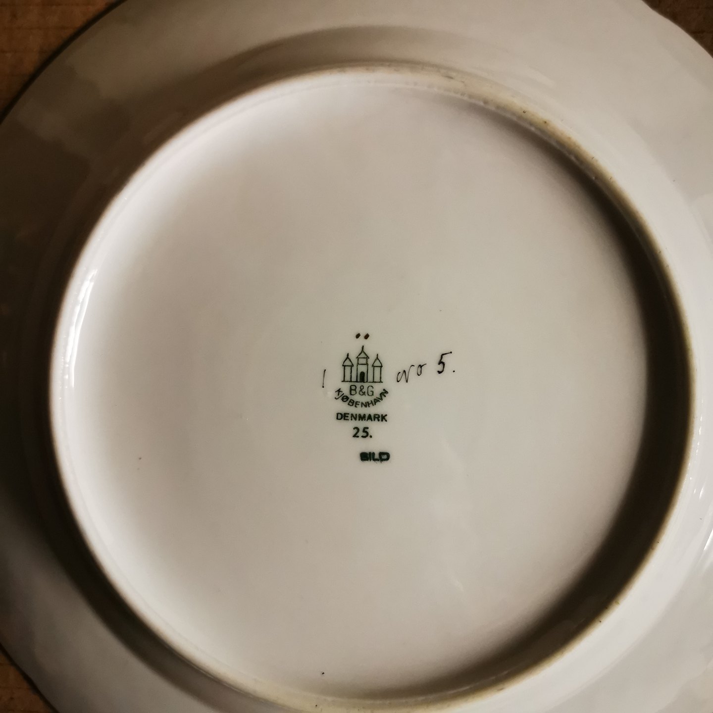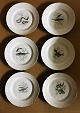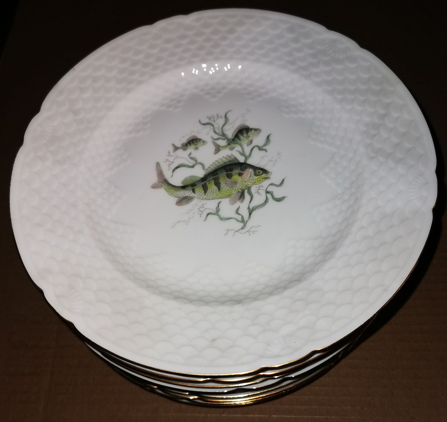 12 porcelain plates in white from Bing & Grondahl with motifs of fish. Right from eel to herring. The back with model number 25 B&G factory logo and the name of the fish on the front. All in good condition without special traces of use. No damage or repairs. All factory first production. Dimensions: 24½ cm in diameter.