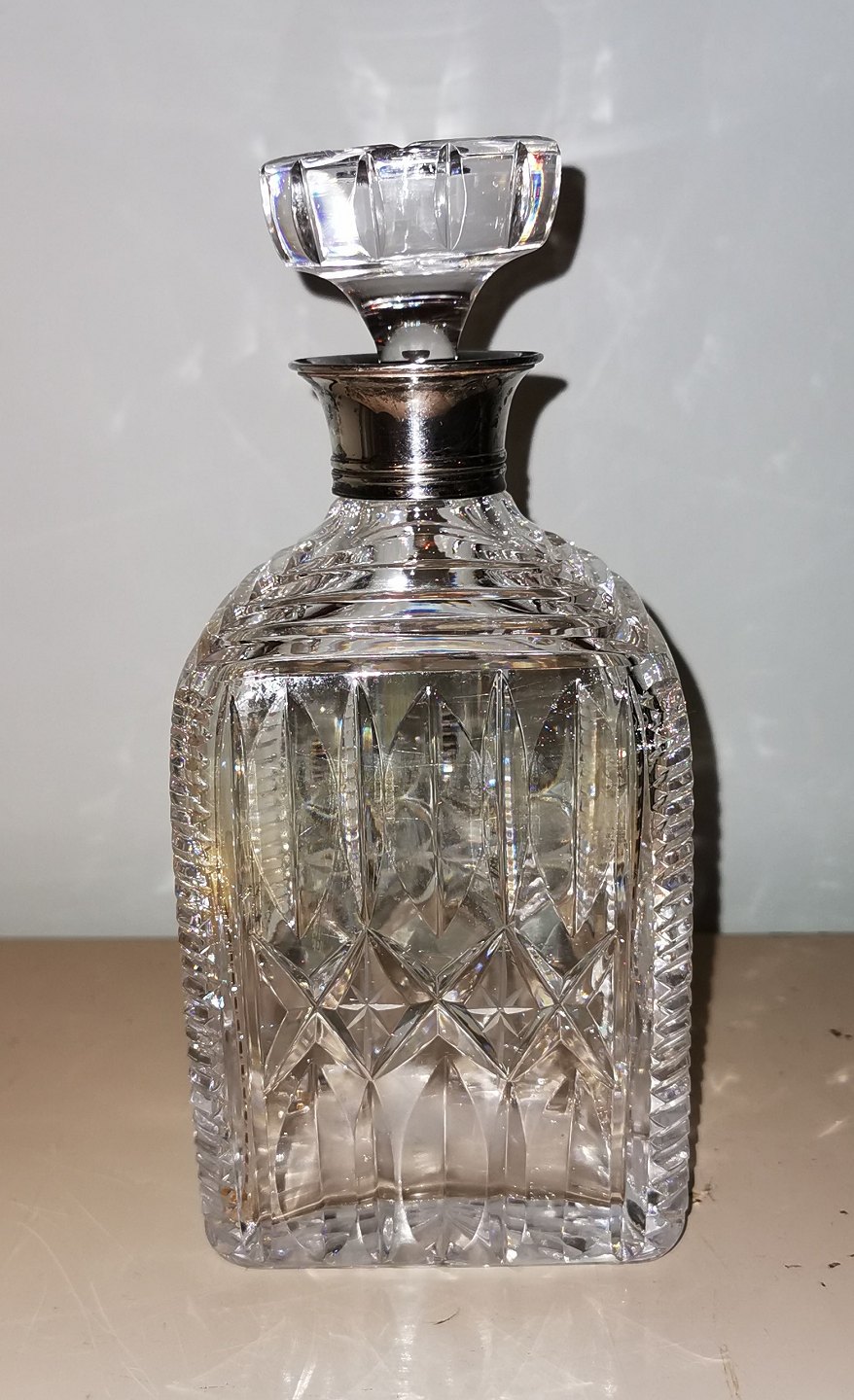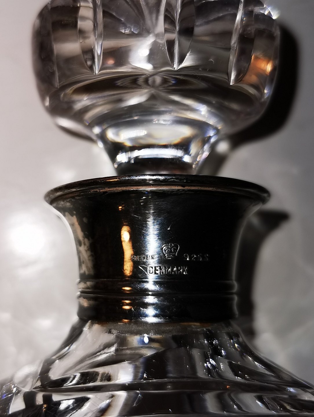 Firkantet Whisky karaffel i krystal glas med sølvmontering i form af 925S Sterling sølvkrave om halsen. Sølvet produceret og monteret i Danmark. Fremstår i god stand bortset fra et lille skår på bunden af proppen (se foto). Ellers i perfekt stand uden reparationer. Mål: 21 cm høj. Bunden måler 7½ x 9 cm.
