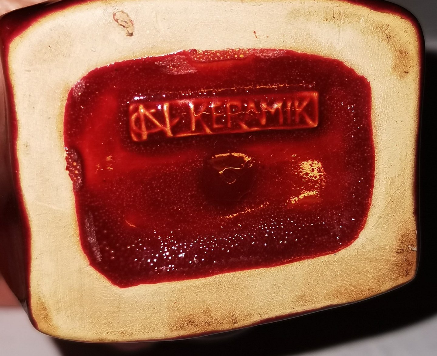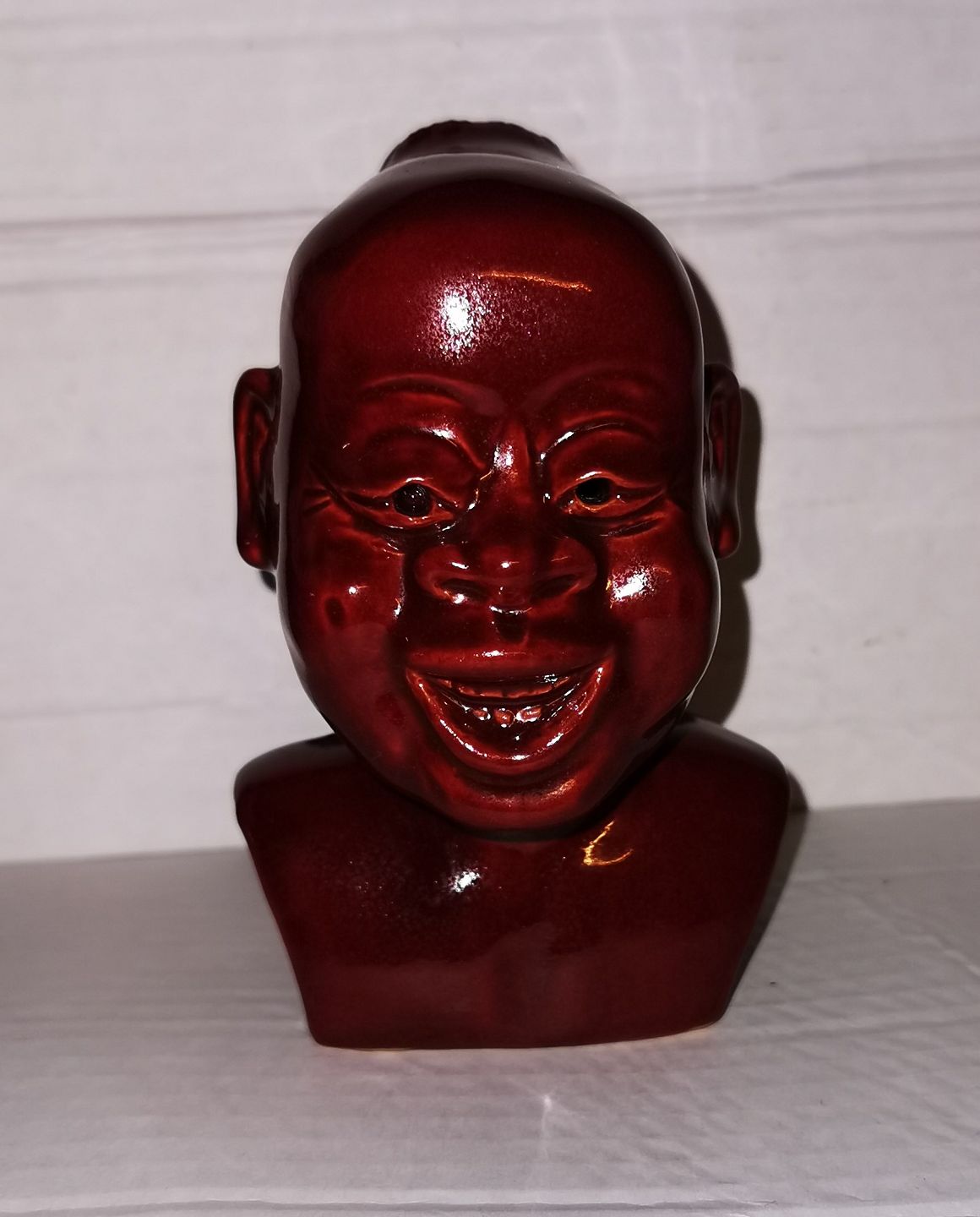 Buste i keramik af smilende afrikansk mand. Dækket af rød glasur. Signeret af ubekendt kunstner på bagsiden. Fabriksmærket på bunden. H. 14 cm