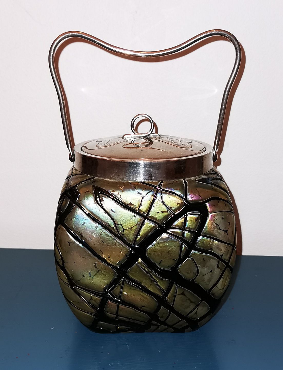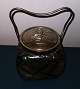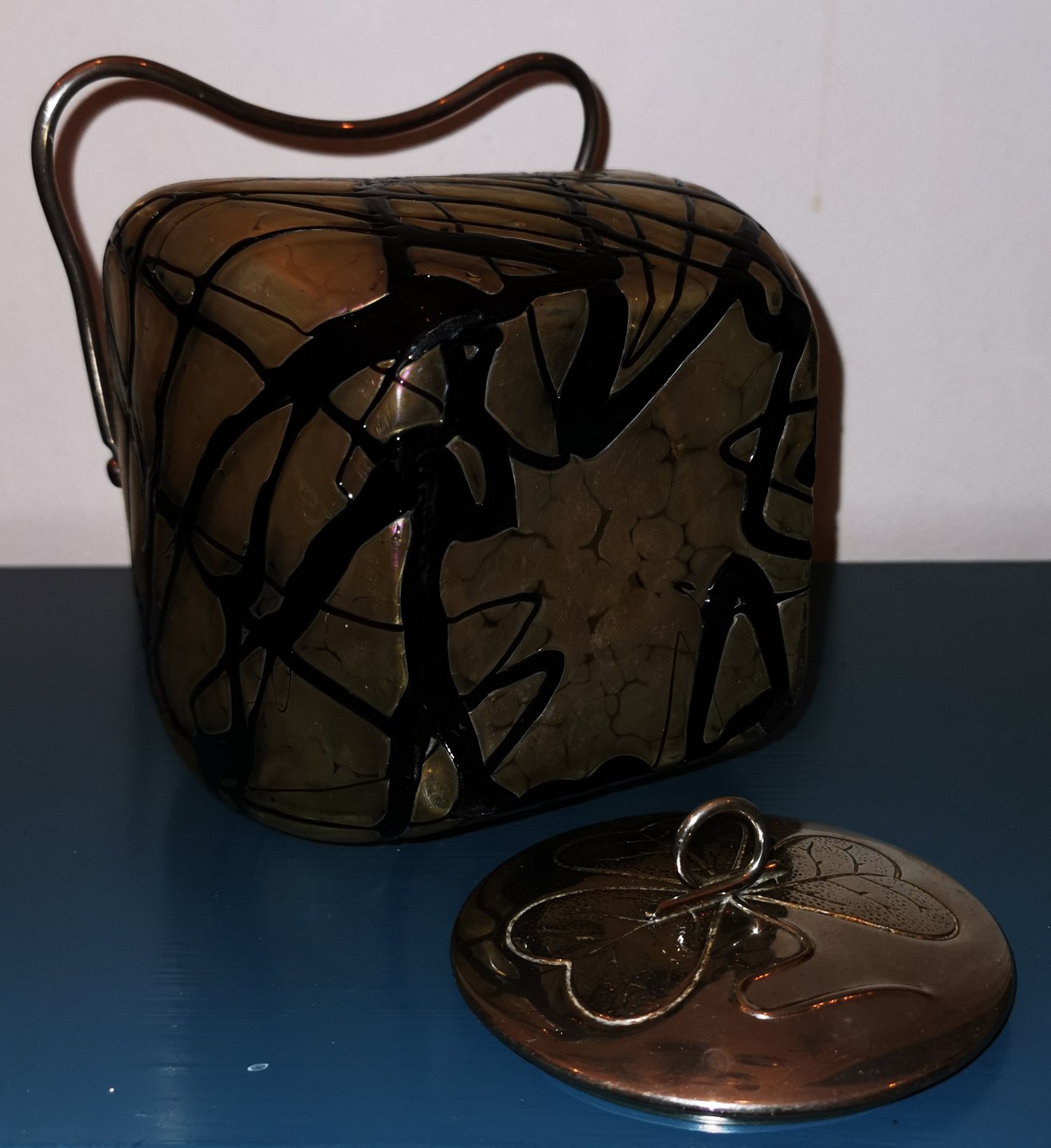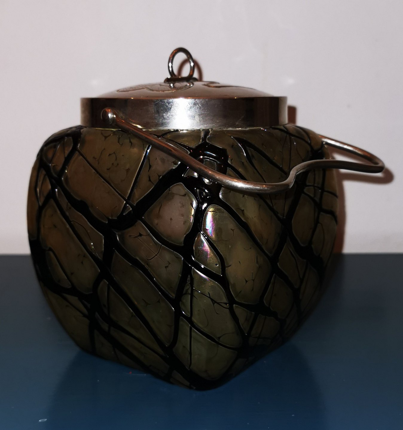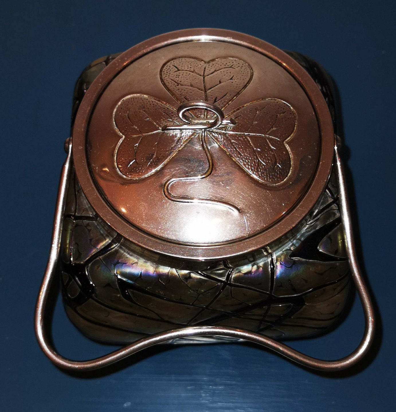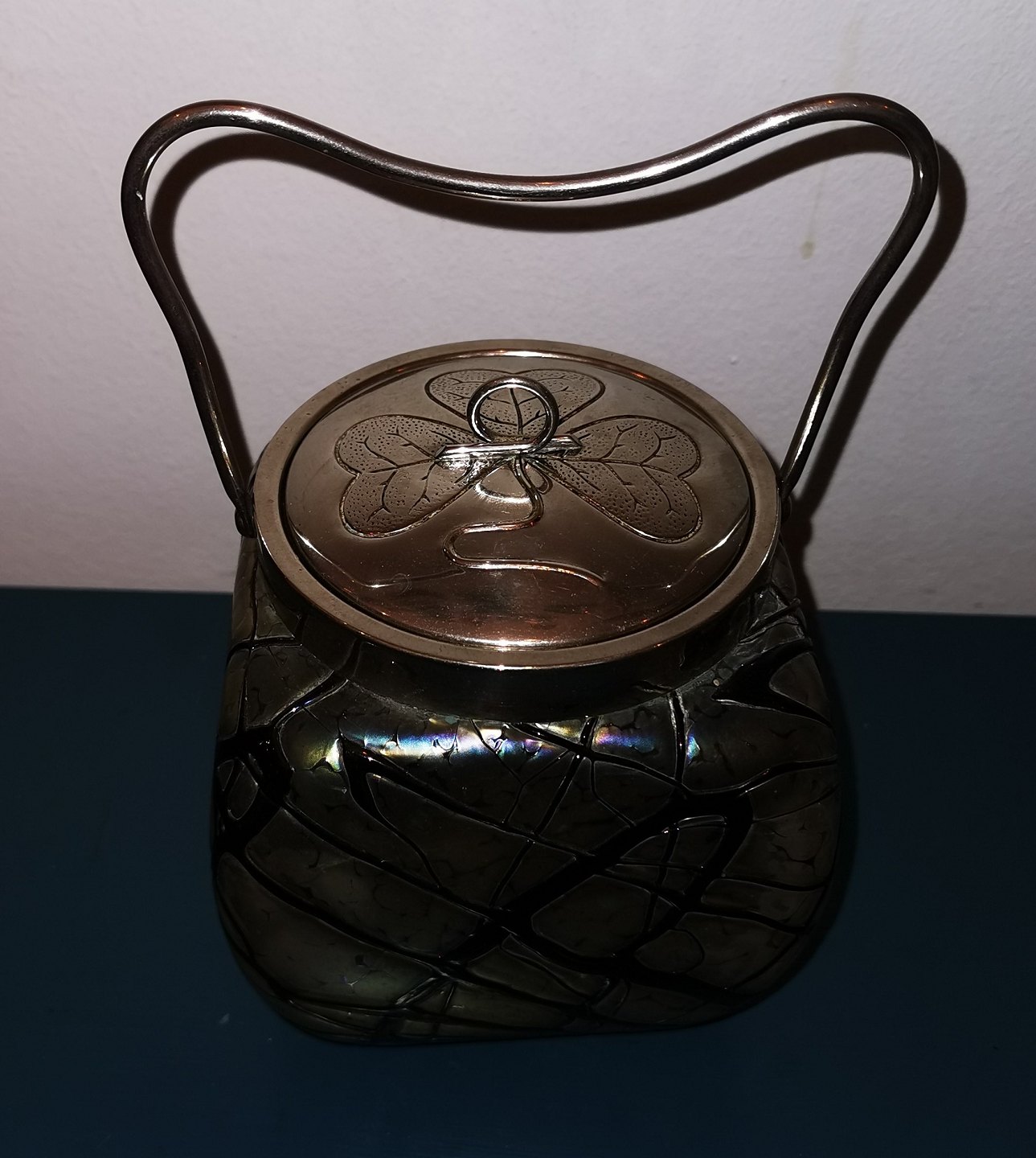 Firesidet Art Nouveau Loetz kiksespand i grønt og sort glas med metal hank og låg med dekoration med en trekløver. Alle dele fremstår i god stand uden skader eller reparationer. Mål: 17 cm høj inclusive låg /6.69 inches)