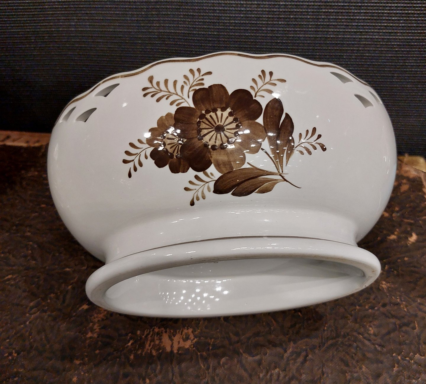 Royal Copenhagen brun Tranquebar fajance skål med gennembrudt dekoration. Fremstår i god stand uden skader eller reparationer. 1. sortering. Modelnummer 45/706. Mål: H. 10½ cm L. 22½ cm B. 18 cm