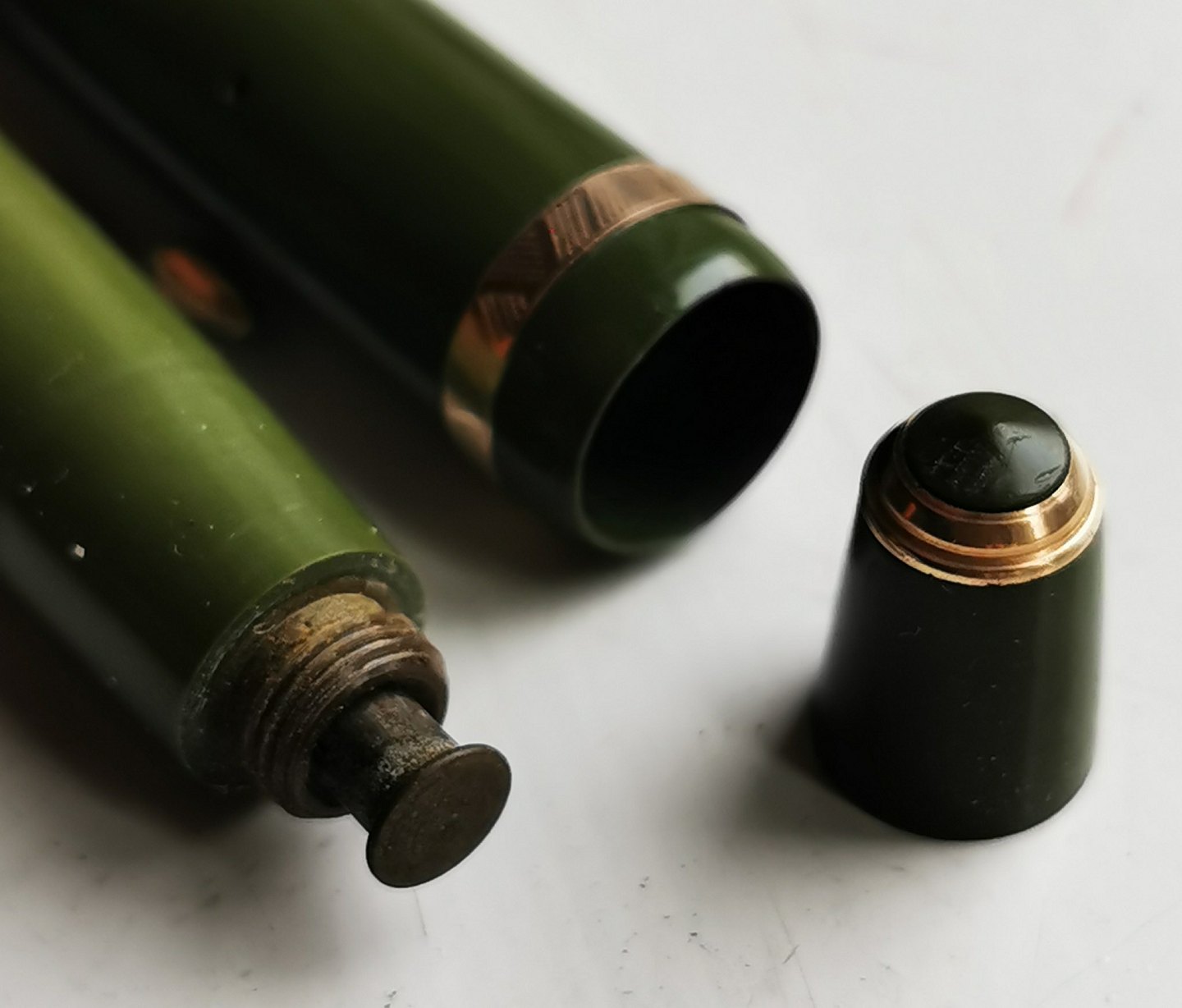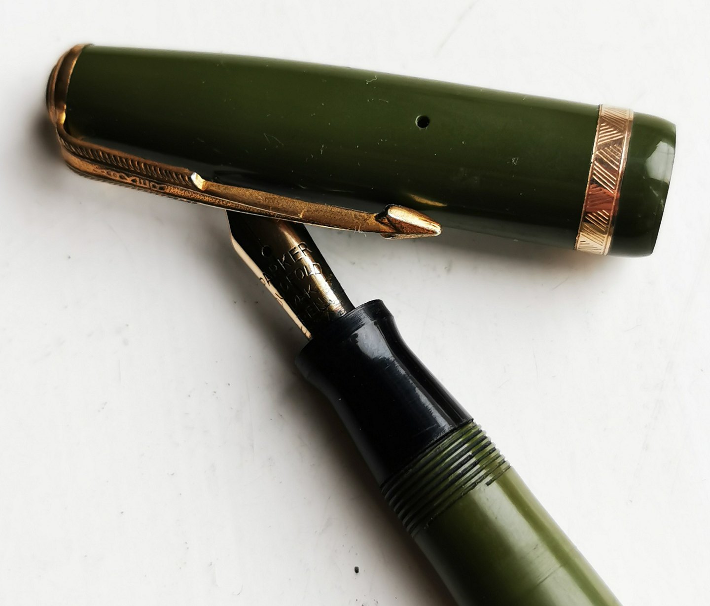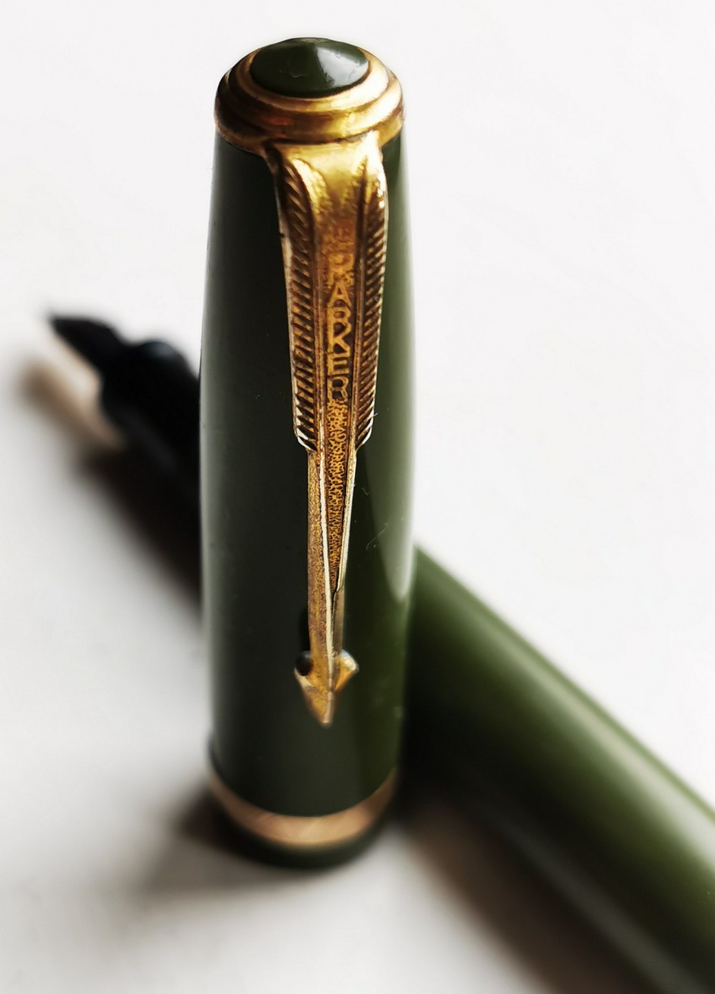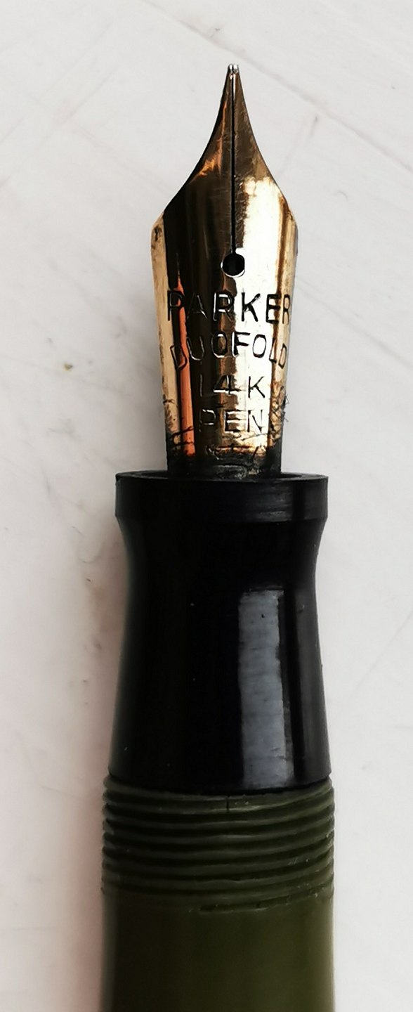 Olivengrøn Parker Duofold Reg. T.M fyldepen fra slutningen af 1940´erne. "Push button" blæk påfylder. Fremstår i god stand. Ingen skader eller reparationer. Alle dele er originale inclusive en 14 karat guld spids. 13½ cm lang (5.31 inches). Virker ikke. Der skal indsættes ny gummisæk hvorefter den fungerer igen. Dette koster ekstra kr. 325,00.