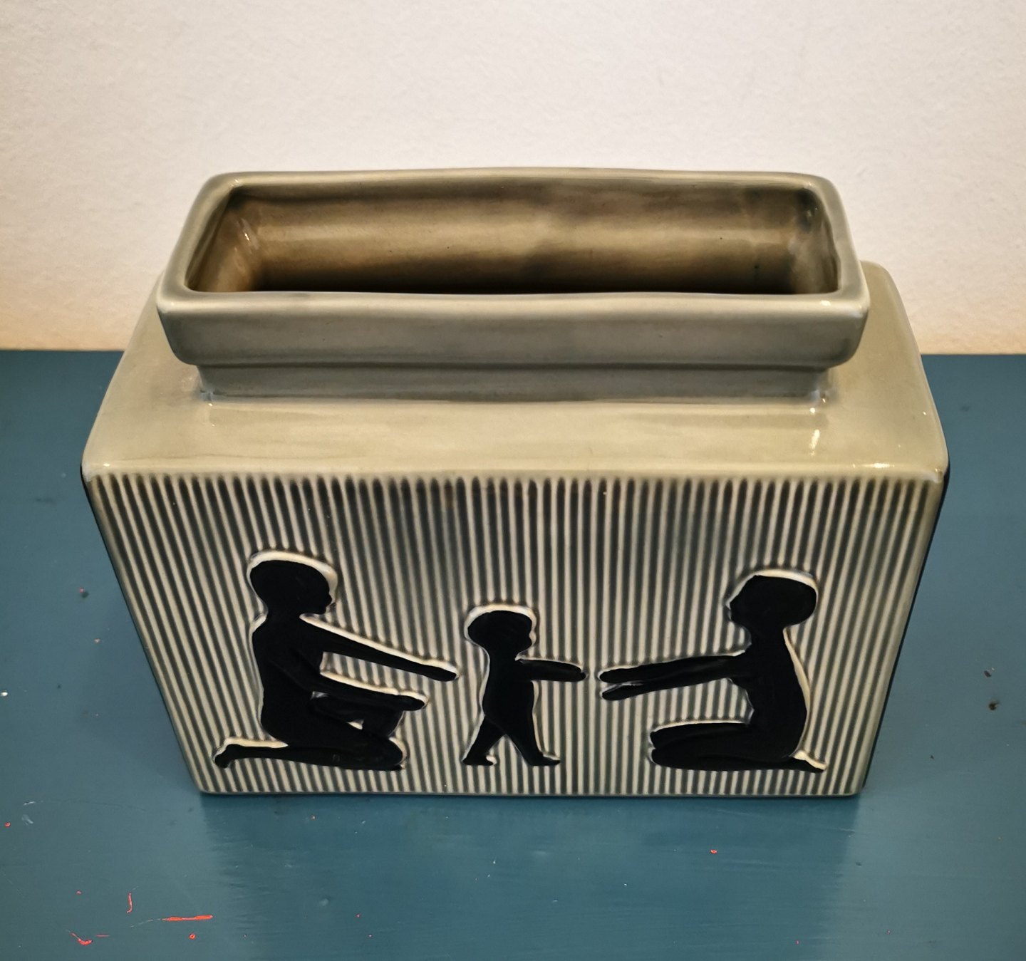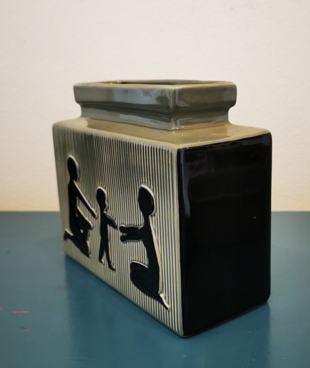 Four-sided "Family" vase in ceramic from the Søholm factory on Bornholm. Motif with child learning to walk. Designed by Svend Aage Holm-Sørensen in the 1950s. Appears in perfect condition. No damage or repairs. Facotory mark and artist signature on the bottom. Measurements: 15½ cm high (6.10 inches) 18 cm long (7.08 inches) and 7½ cm wide (2.95 inches).