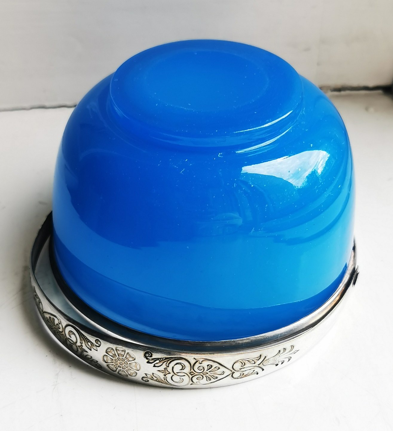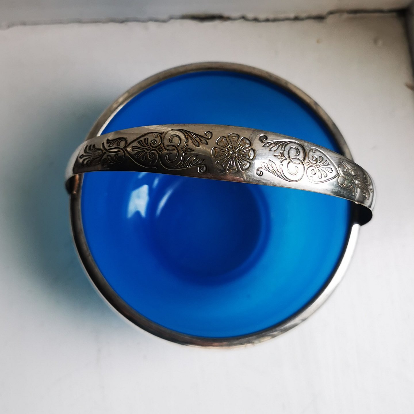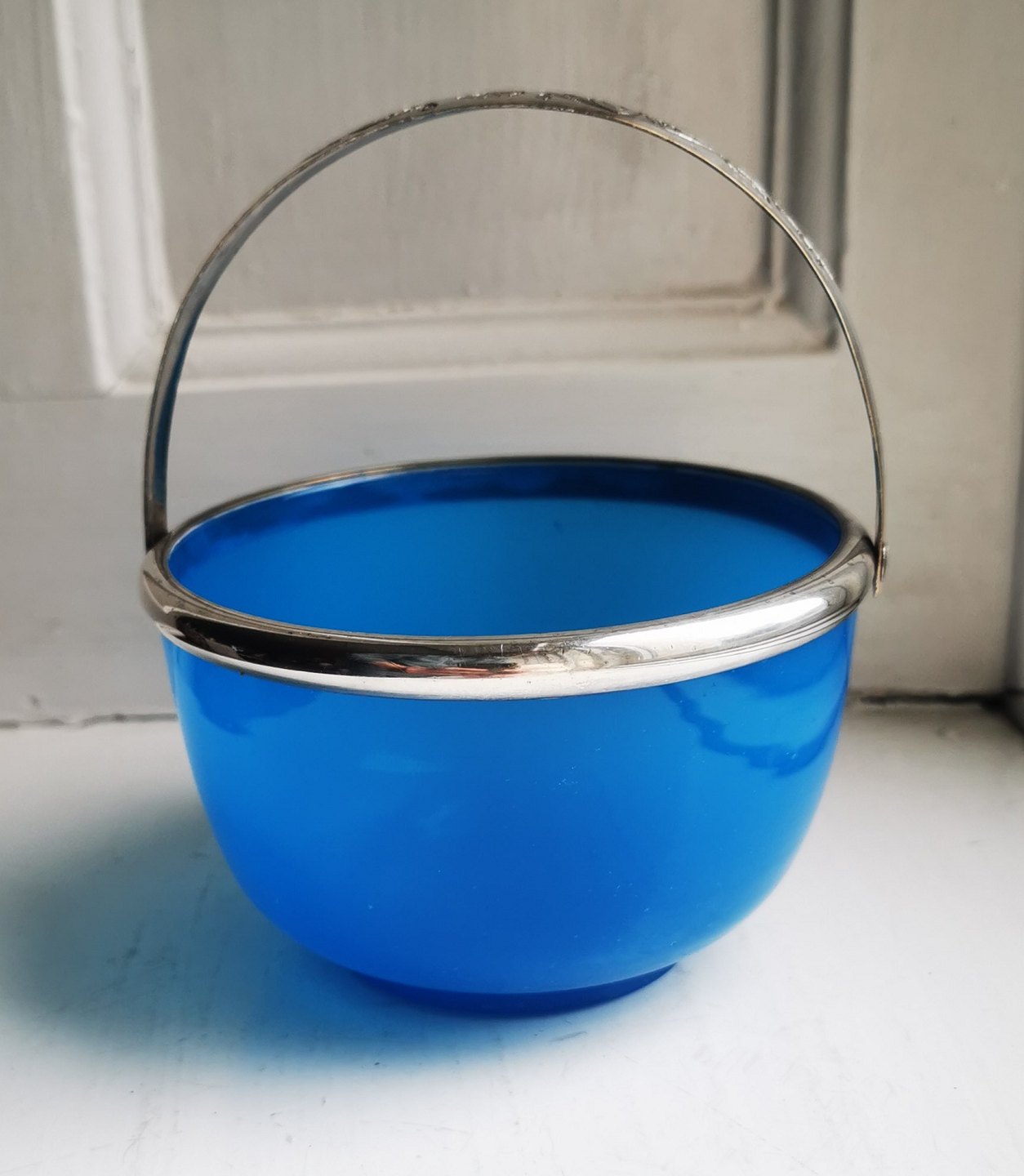 Blå sukkerskål med hank i sølvplet. Både glasskålen og hanken i god stand uden særligt brugsspor. Hanken med fine danske stempler. Fremstillet omkring 1900. Mål: H. 7½ cm (2.95 tommer) Ø. 12 cm (4.72 tommer).