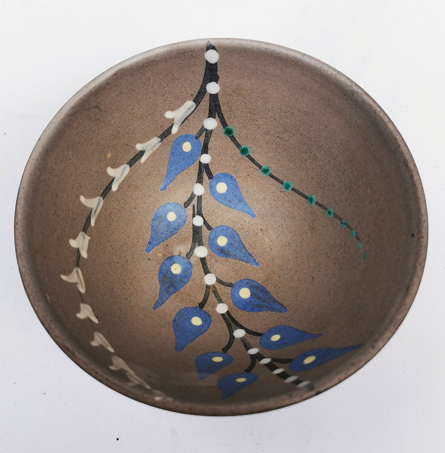Skål i keramik med dekoration af gren med bladværk indenvendigt i skålen. Signeret MELLE DENMARK på undersiden. Fremstår i god stand uden skader eller reparationer. Mål: H. 6½ cm (2.55 tommer) og 13 cm i åbningsdiameter (5.11 tommer).