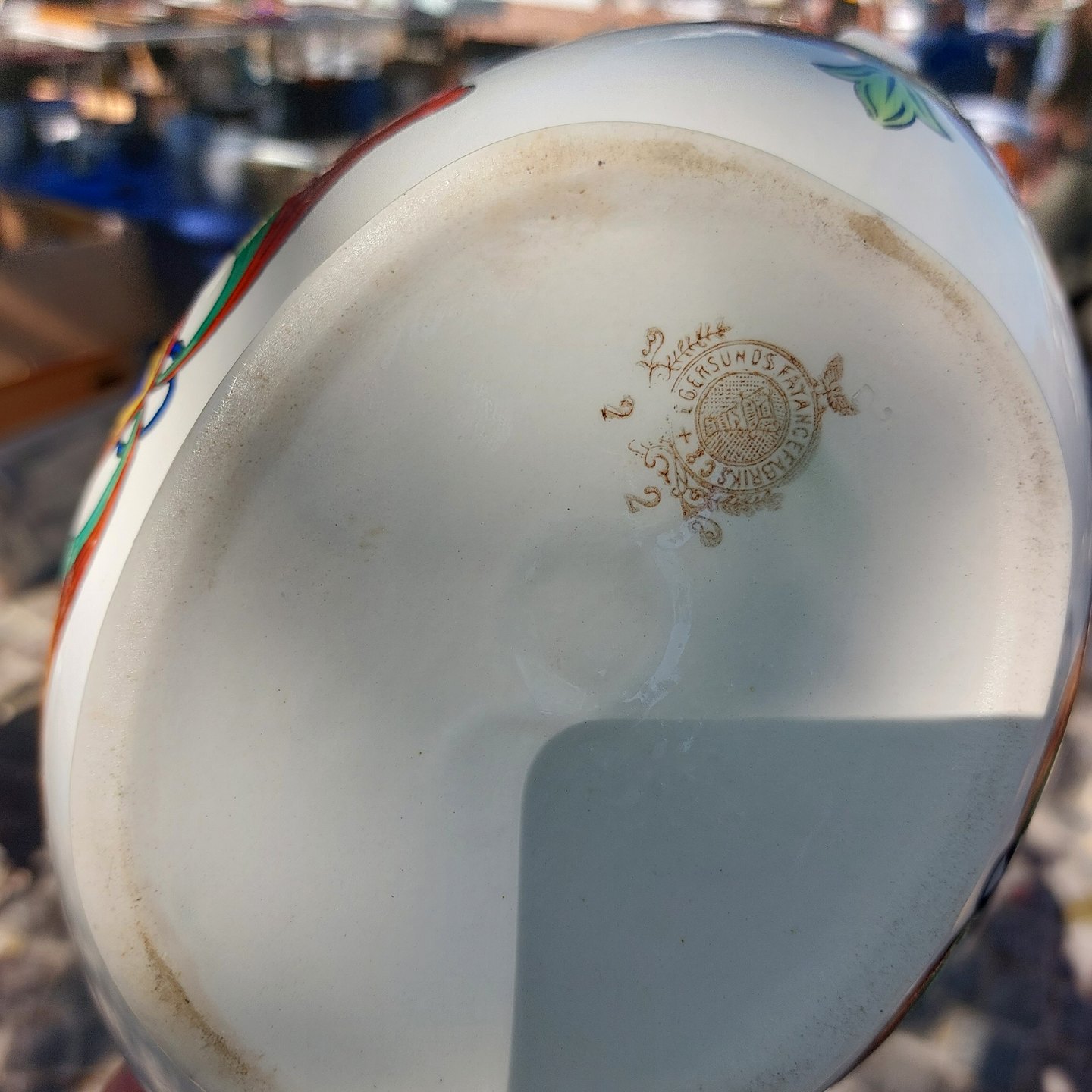 "Ølbolle" eller øl hestehoved drikkeskål fra Egersundfabrikken i Norge. Fremstillet omkring 1940. Hoved og hale som hanke. Bemalet ornamentik på siden. Fabriksmærket på bunden. Fremstår i god stand uden skader eller reparationer. Lignende skåle ses fra en anden norsk fabrik - Porsgrund. Mål: H. 19 cm (7.48 tommer) L. 31 cm (12.20 tommer)