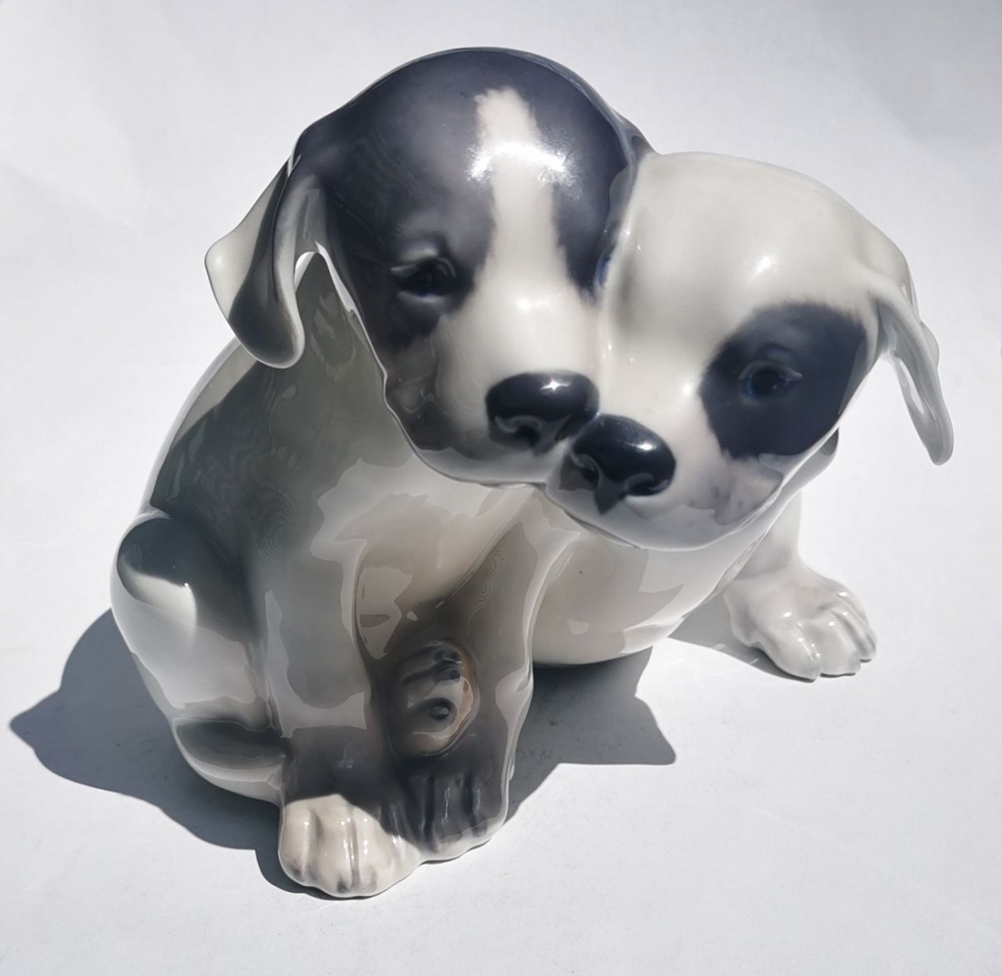 Figur i porcelæn fra Royal Copenhagen. Forestillende to pointer hvalpe. Designet af Erik Nielsen. I god stand. 1. sortering. Fabriksmærket på bunden. Modelnummer 260. Mål: 14½ cm høj (5,70 tommer)