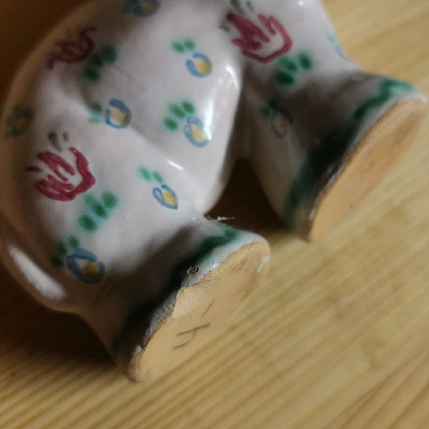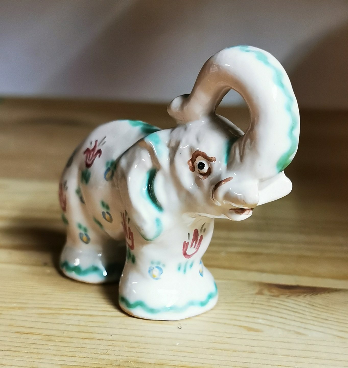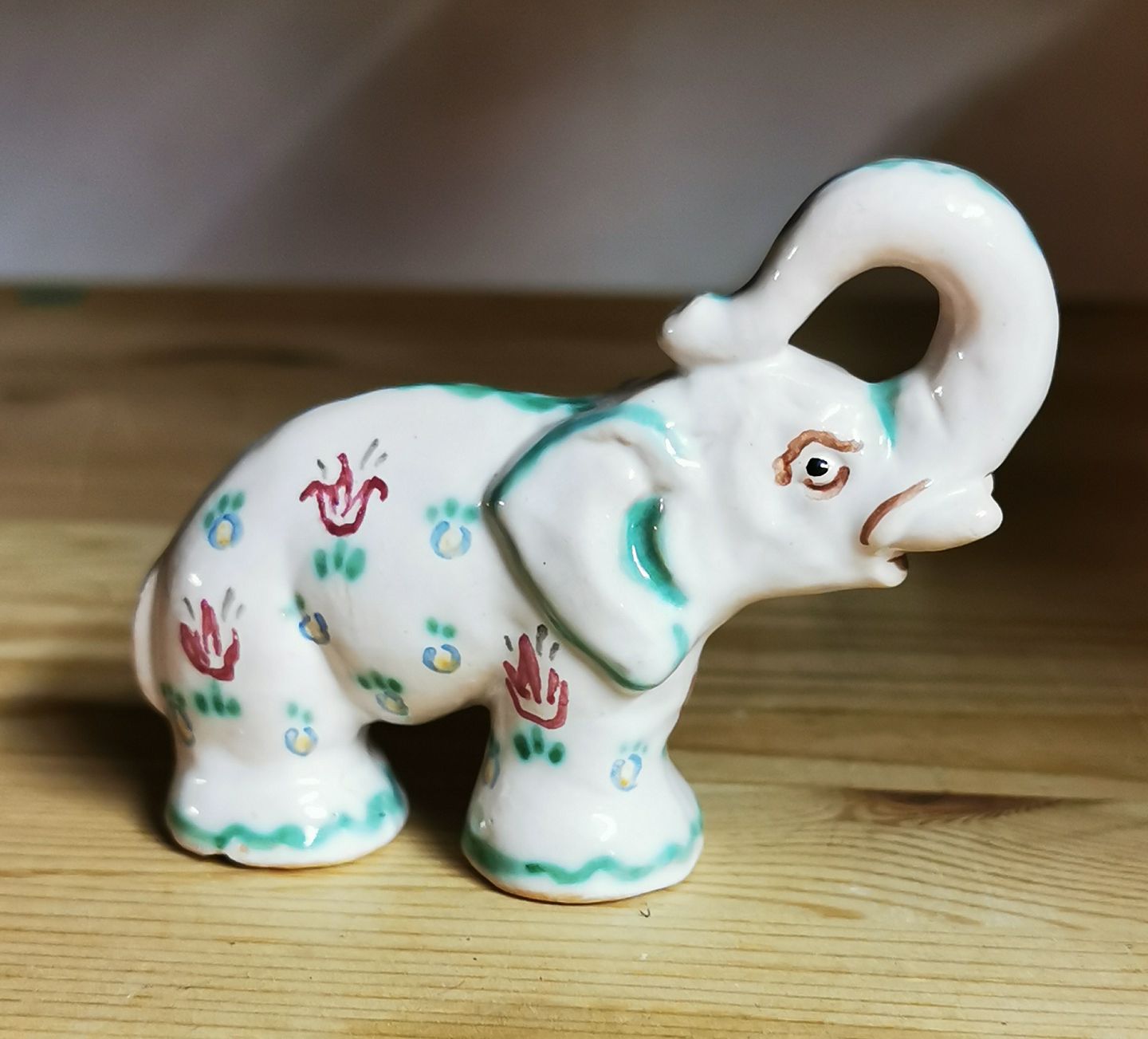 Figur i keramik af elefant fra Lauritz Hjorth, Bornholm. Bemalet med blomster. Har skår på undersiden (se foto). Fabriksmærket på undersiden. Mål: H. 7½ cm L. 9½ cm.