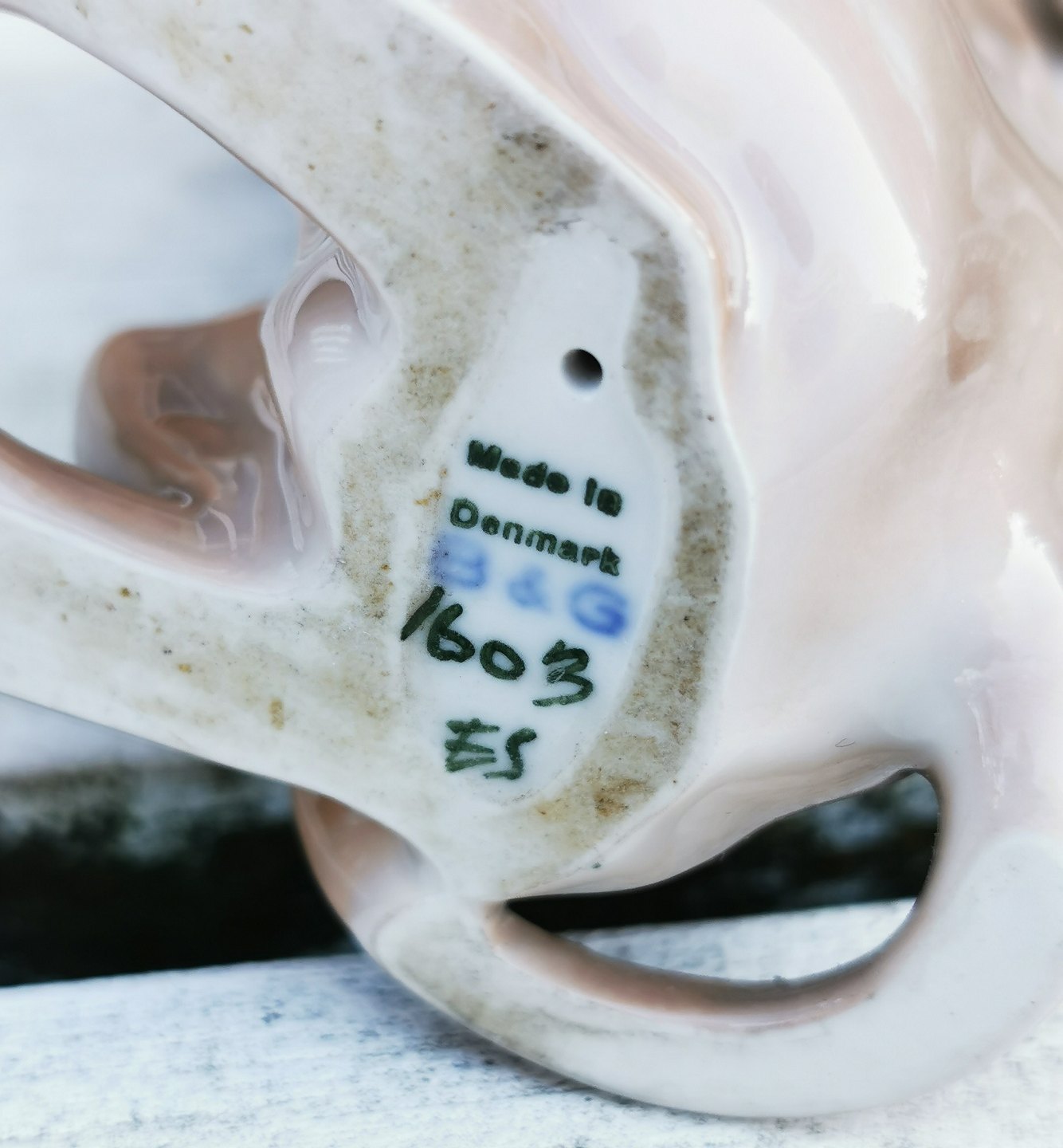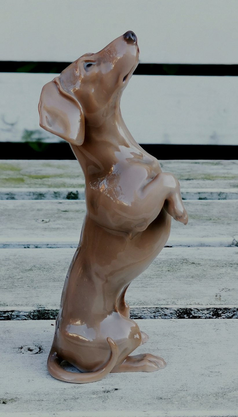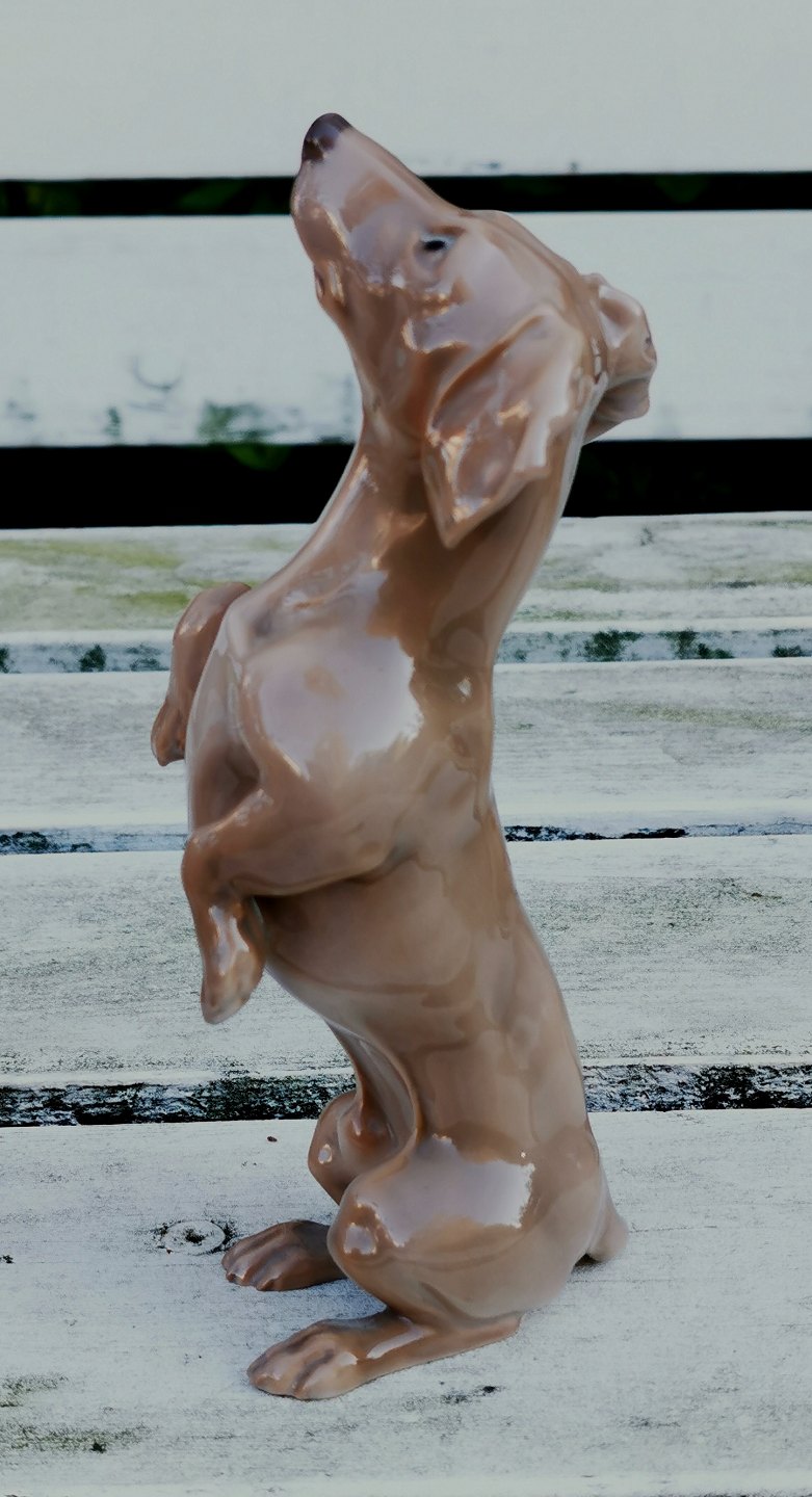Figur i porcelæn af Dahl Jensen for Bing & Grøndahl: "Tiggende gravhund" stående på bagben. Fremstår i perfekt stand. 1. sortering. H. 19 cm. Fabriksmærket på bunden. Modelnummer 1603.