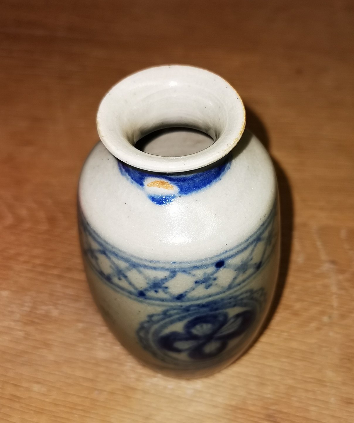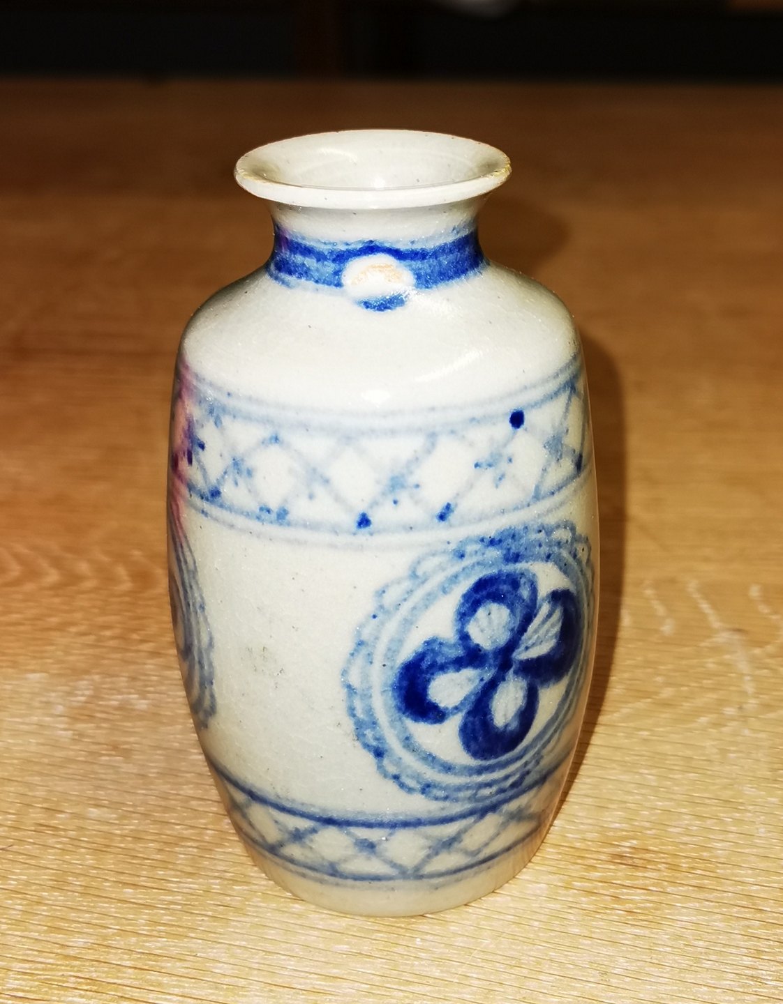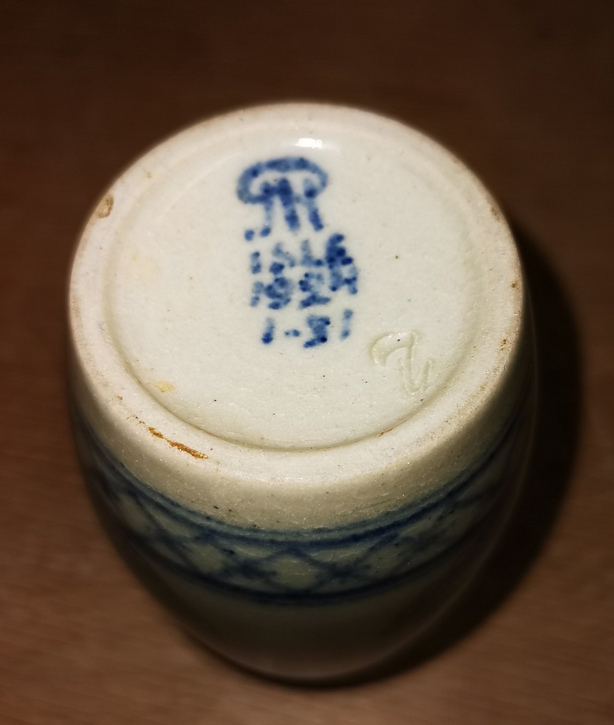 Lille vase i keramik med Blå dekoration. Udført på Patrick Nordstrøm' s eget. Værksted i Islev i 1924. Fremstår i god stand. Signeret af kunstneren på bunden. H. 11 cm