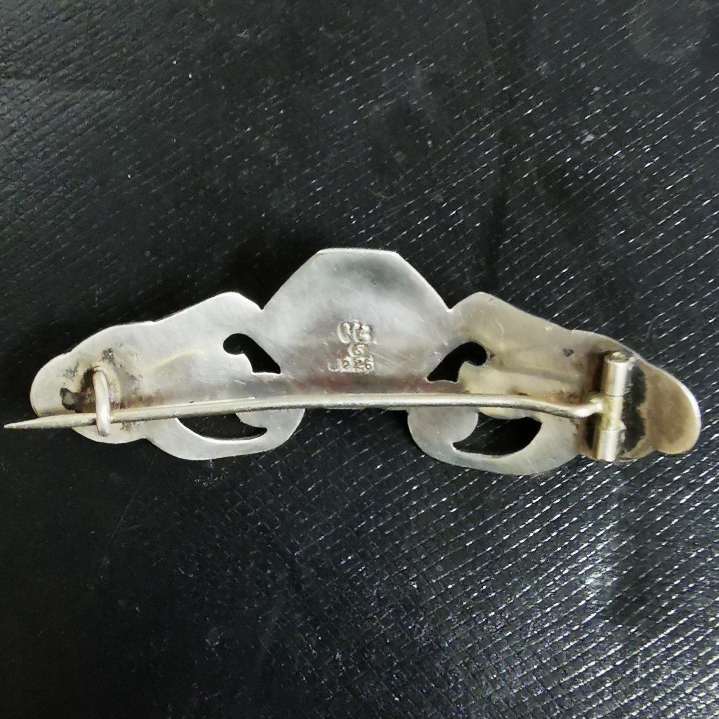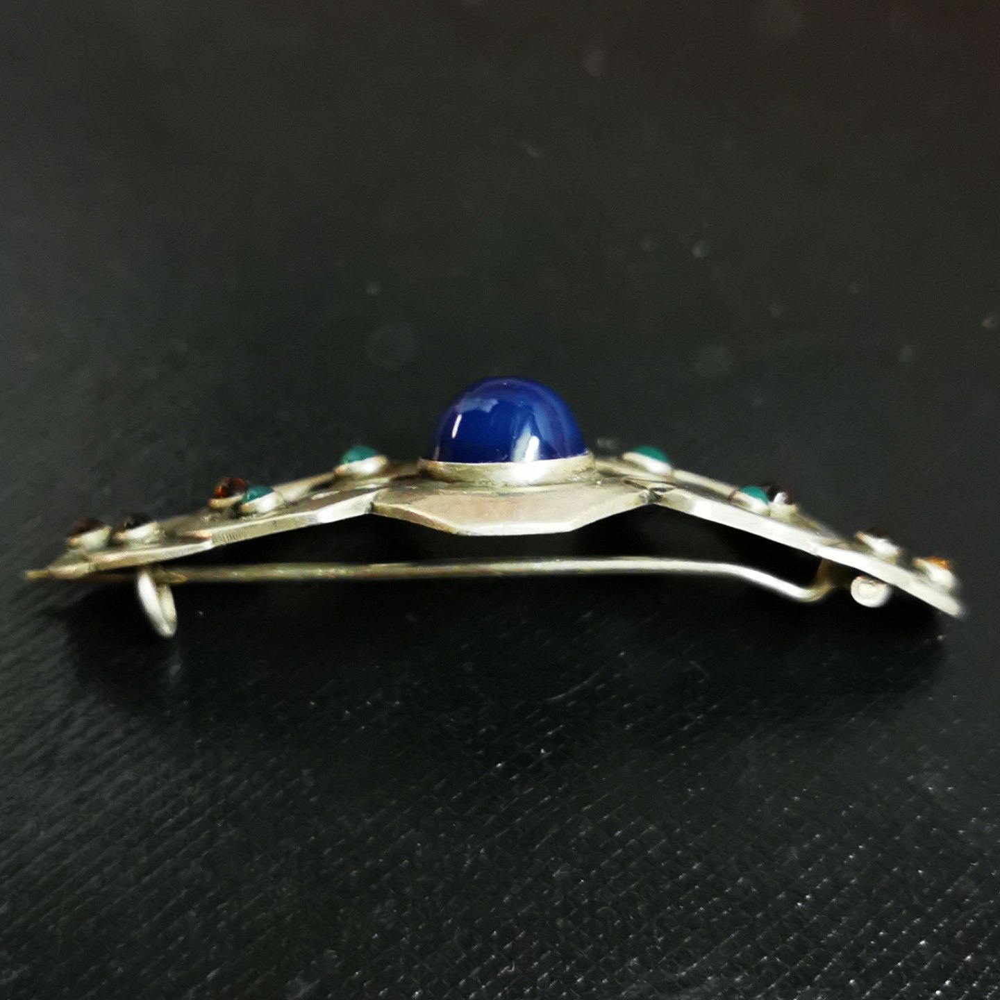 Lille sølv broche i skønvirkestil med blå sten samt mindre små røde og grønne fra Mogens Ballin´s værksted fra ca. 1900. Fremstår i god stand uden skader eller reparationer. Fabriksmærket på bagsiden. Mål: L. 5½ cm
