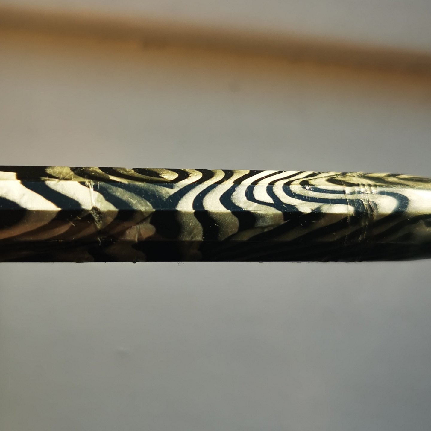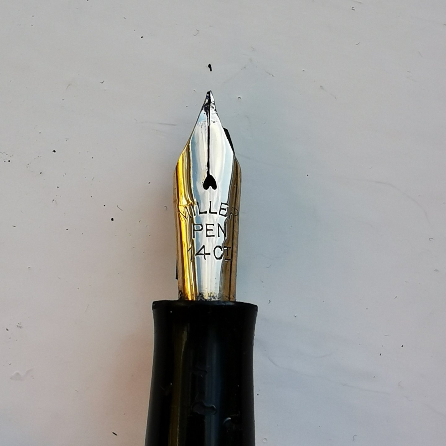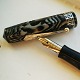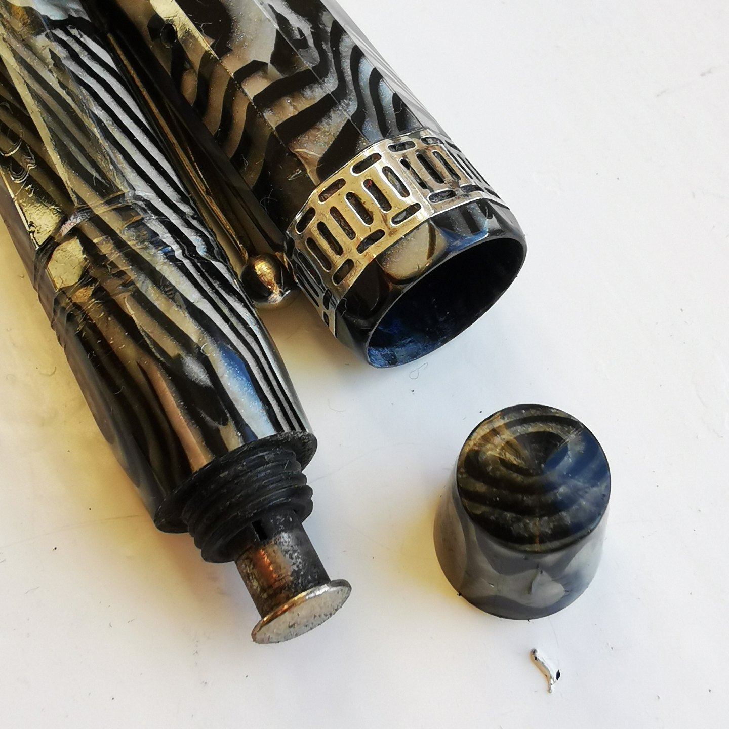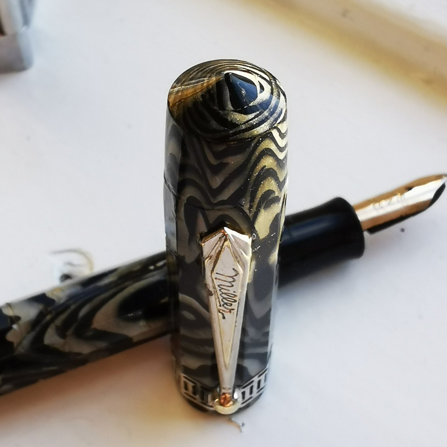 Kantet marmoreret Miller fyldepen. Alle dele originale. Har overflade skader på kroppen (se fotos). Der skal indsættes ny gummisæk før end den kan komme til at skrive igen. L. 12,5 cm.