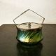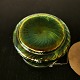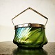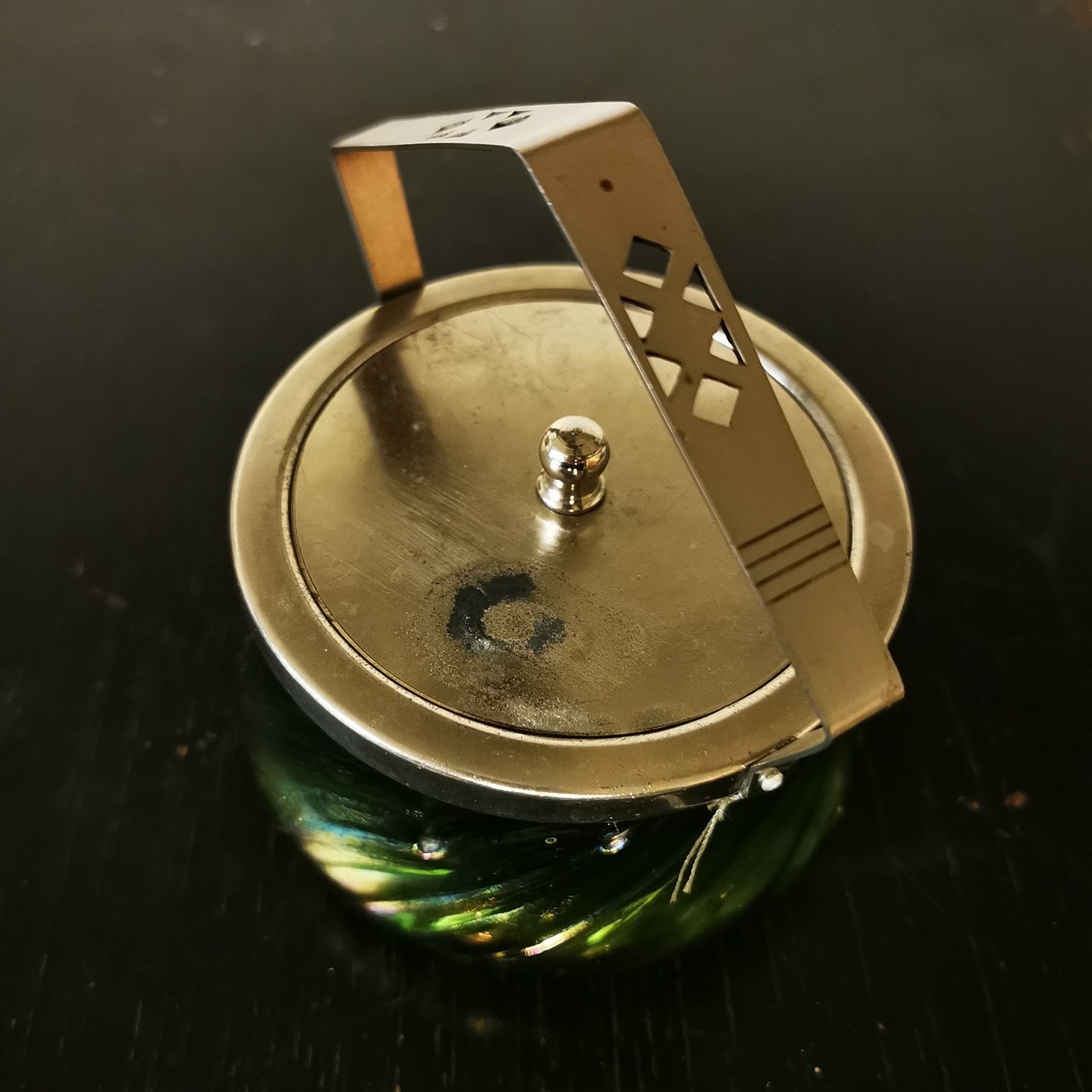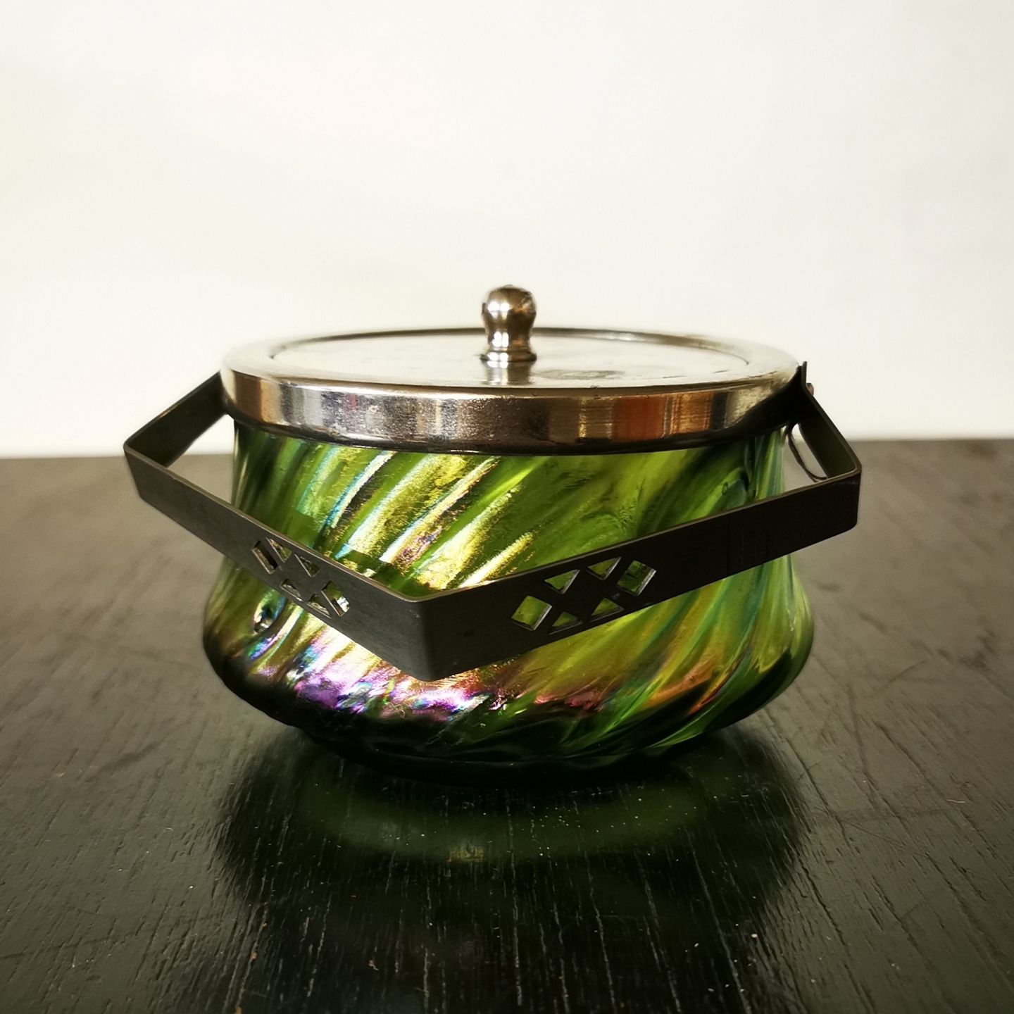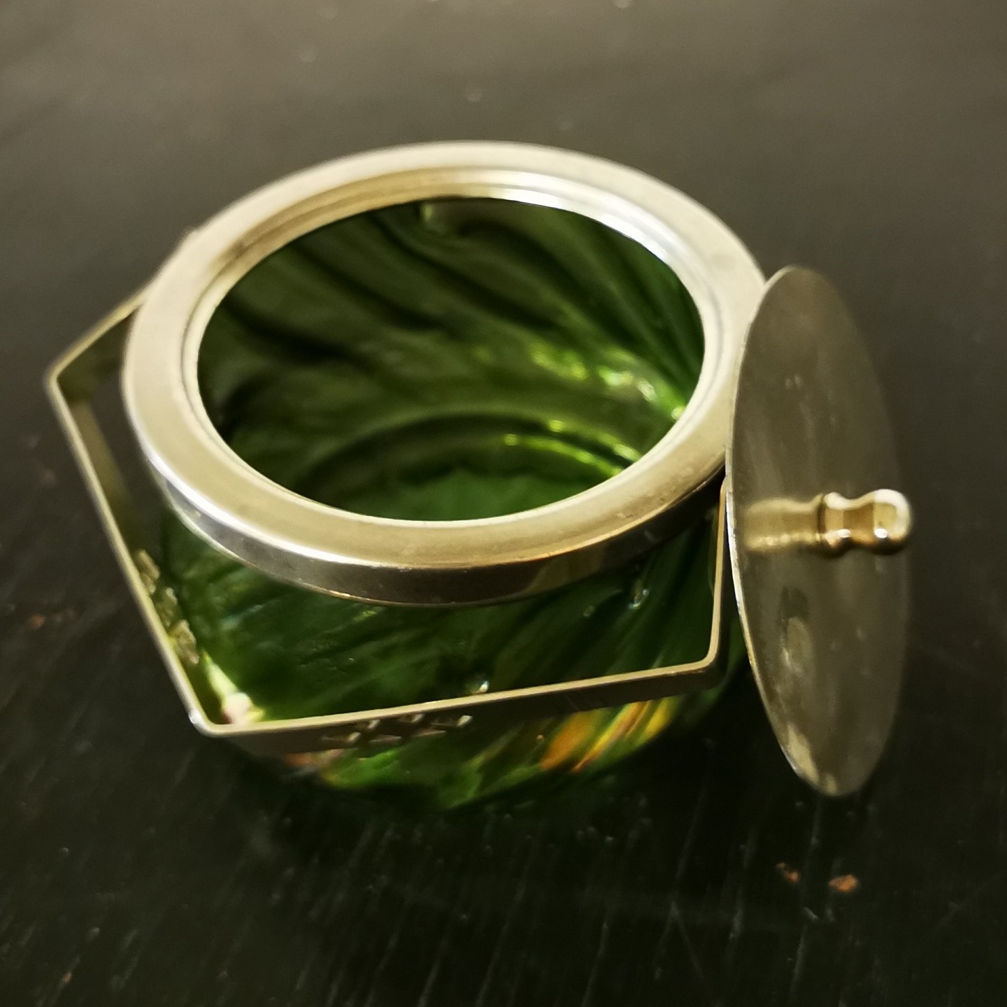 Green glass sugar bowl with metal lid and handle. Presumably manufactured in Bohemia at the beginning of the 20th century. In good condition. Measurements: H. 7 cm (13 cm high with raised handle). Top diameter of 9 cm.