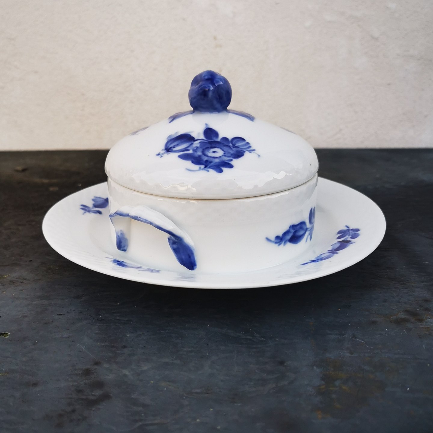 Blå Blomst smørskål i porcelæn fra Royal Copenhagen. I god stand. Ingen skader eller reparationer. 1. Sortering. Fabriksmærket på bunden. Modelnummer 10/ 8076.