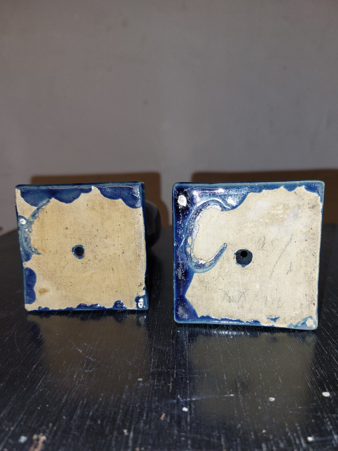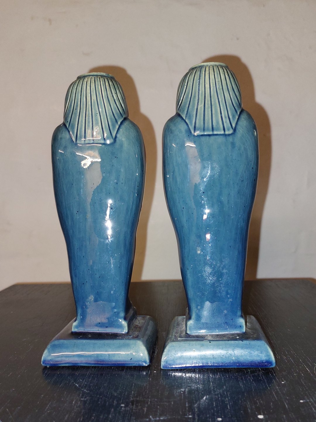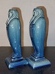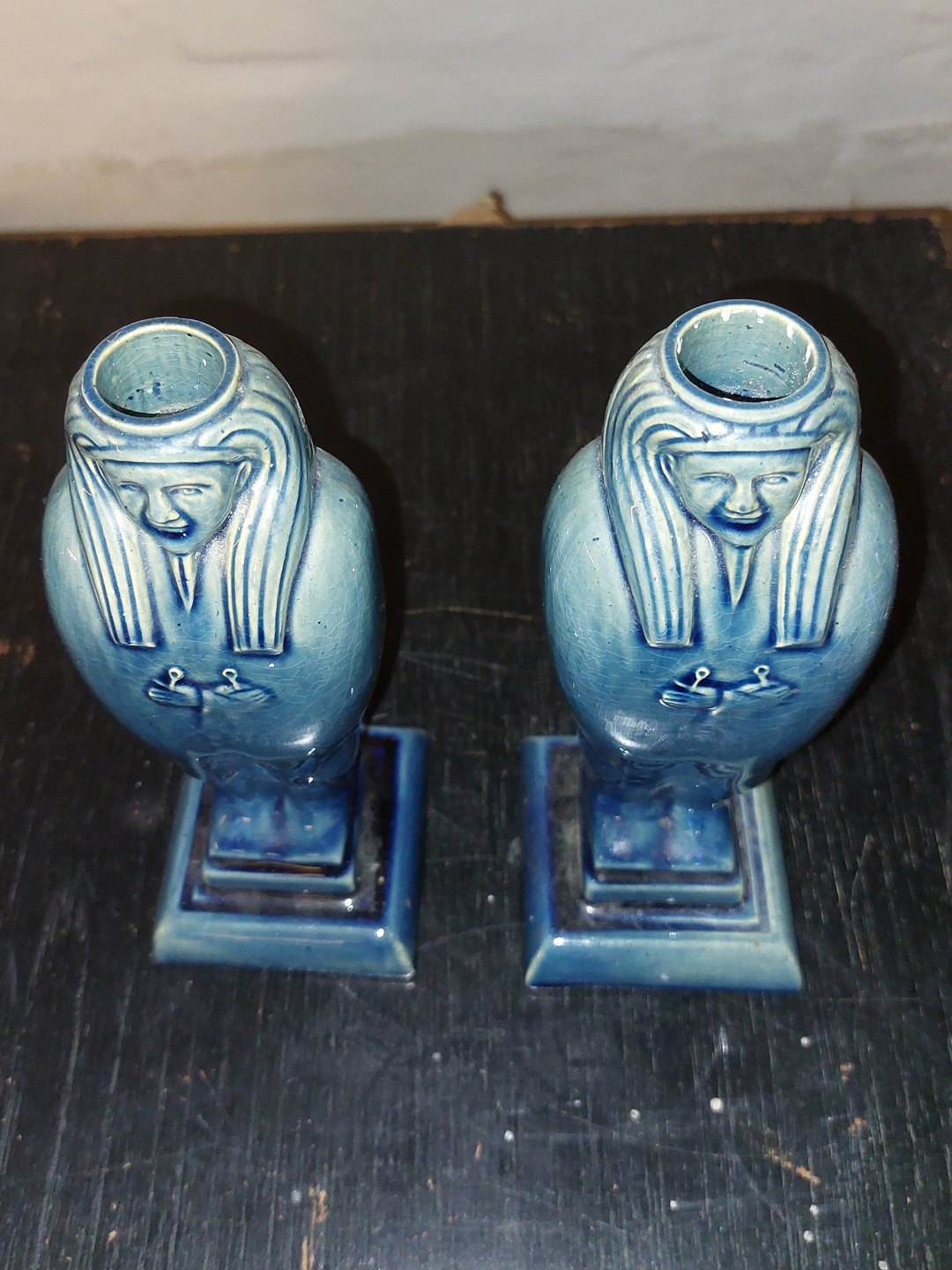 Dansk keramik: Par lysestager i form af to figurer af ægyptiske sarkofag dækket af en blå glasur. Fremstillet i terracotta fra Sonne fabrikken på Bornholm. Fremstillet omkring 1900. Fremstår i god stand uden skader eller reparationer. Lysestagerne er ustemplede, men tilsvarende lysestage ses til salg HER på reutemann.dk i sortbemalet terracotta designet af Cordsen (varenummer: 218870). H. 19 cm.