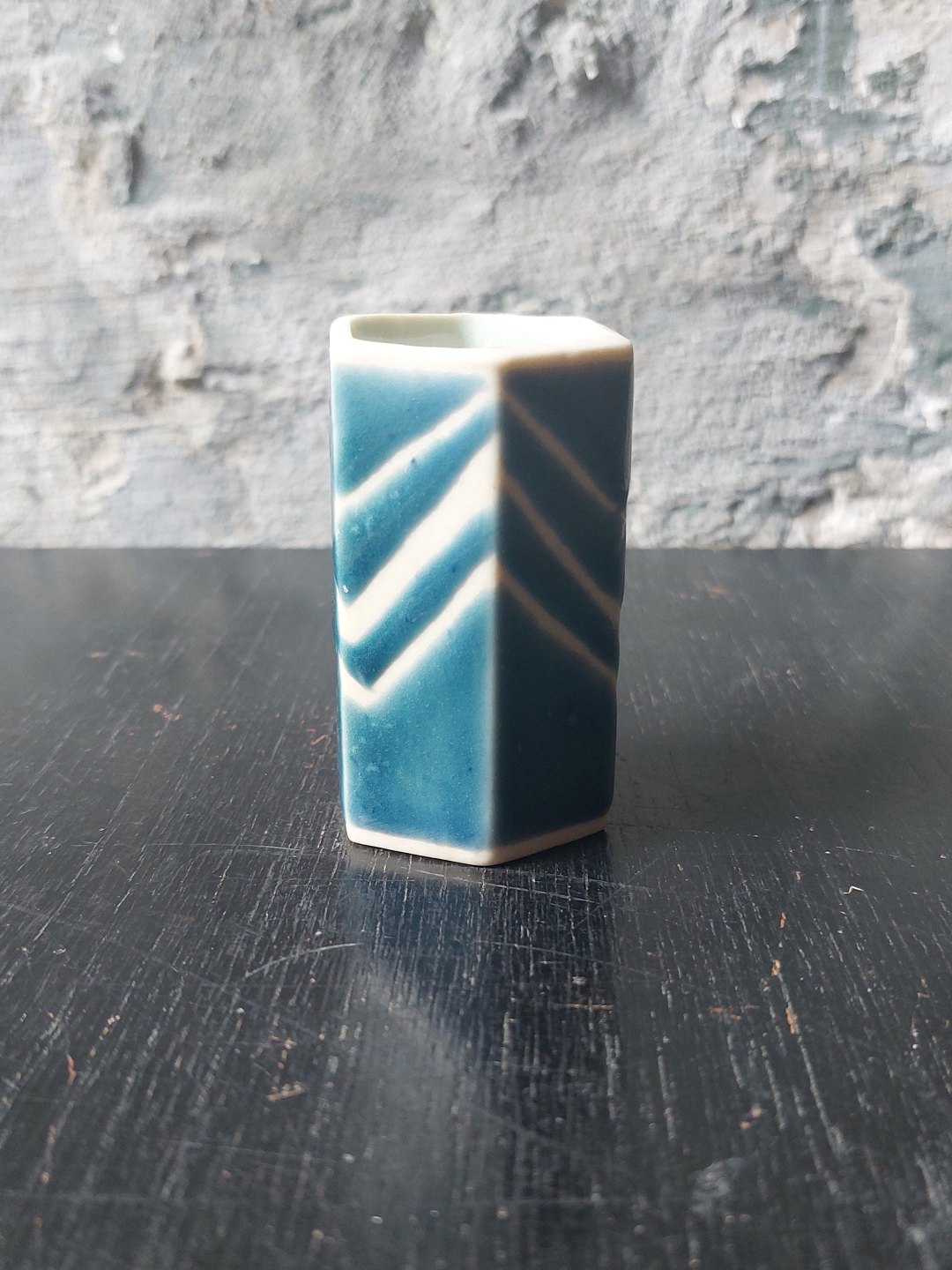 Sekskantet vase I keramik fra Eslau fabrikken i Taastrup. Fremstår I god stand uden skader eller reparationer. Indridset fabriksnavn samt kunstnersignatur. H. 7 cm.