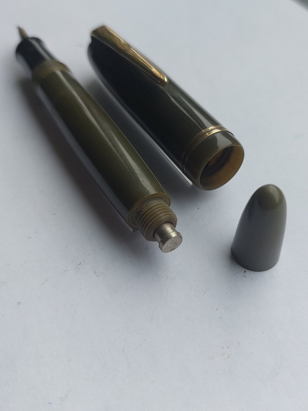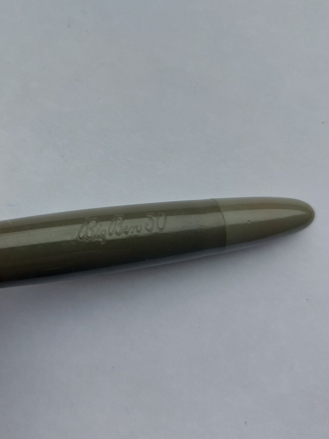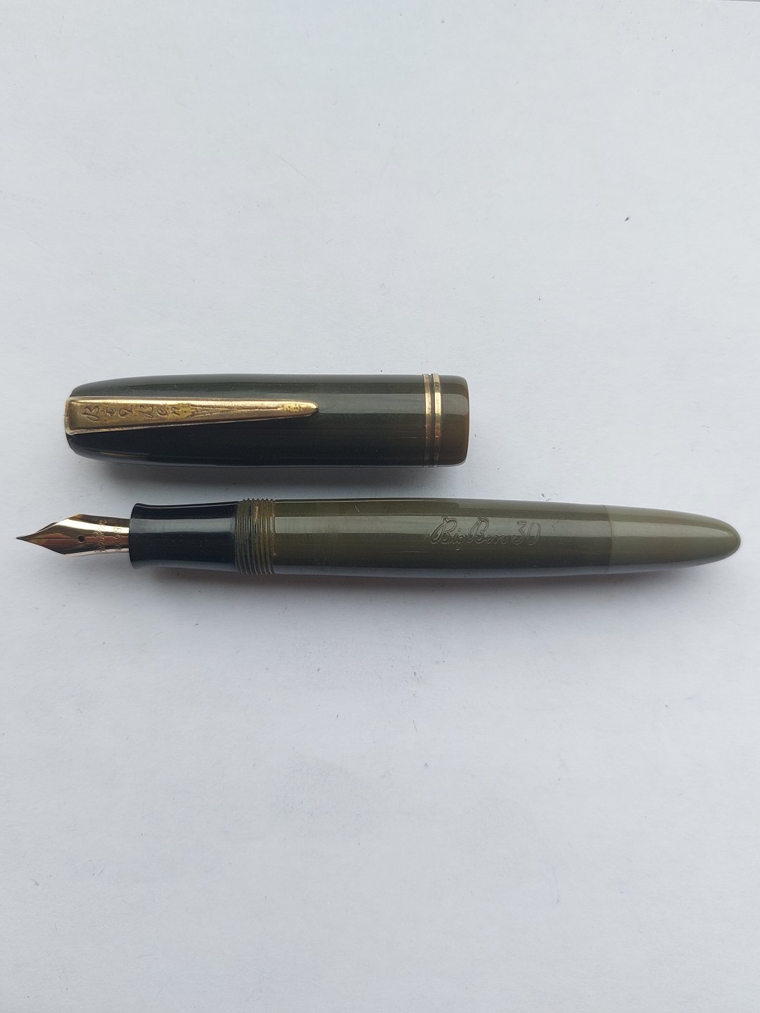 Short olive green Big Ben No. 30 fountain pen. Push button ink refill. Appears in good condition with all original parts. Does not work. Must have a new rubber bag inserted before ink can be refilled and the pen writes again. Length: 12 cm (4.72 inches).