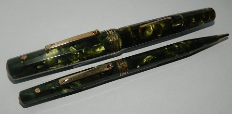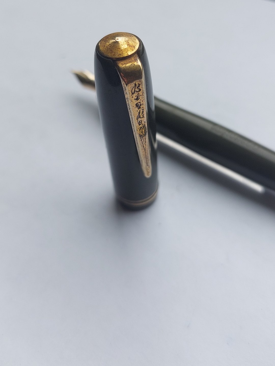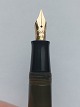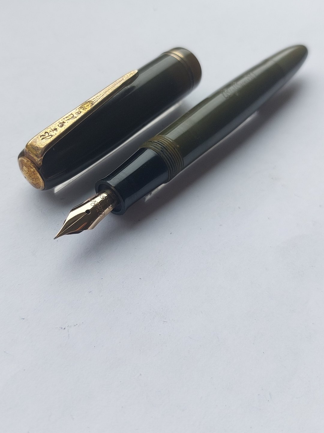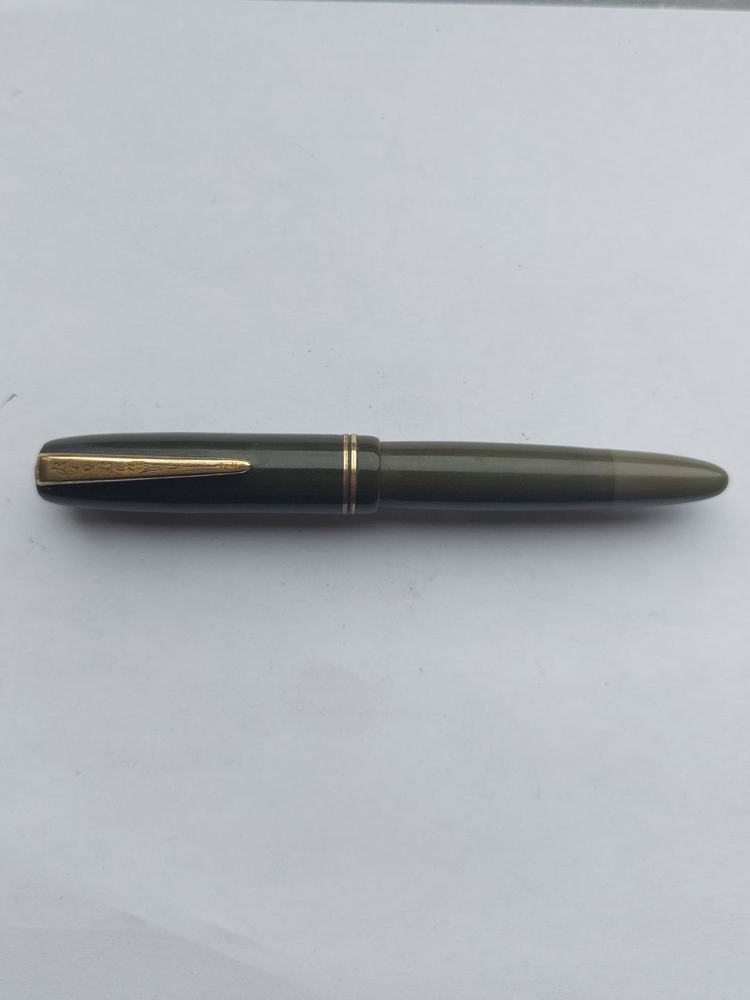 Short olive green Big Ben No. 30 fountain pen. Push button ink refill. Appears in good condition with all original parts. Does not work. Must have a new rubber bag inserted before ink can be refilled and the pen writes again. Length: 12 cm (4.72 inches).