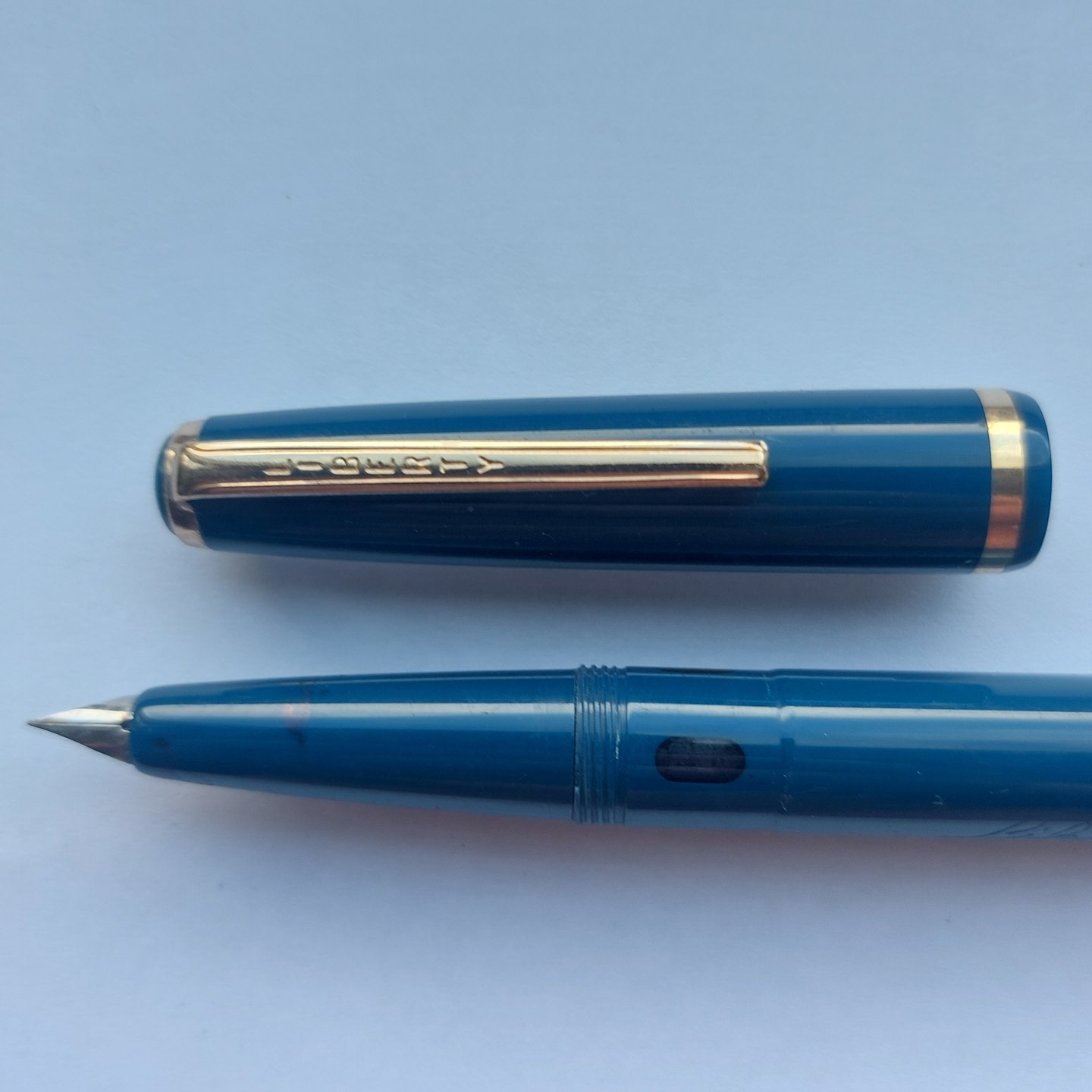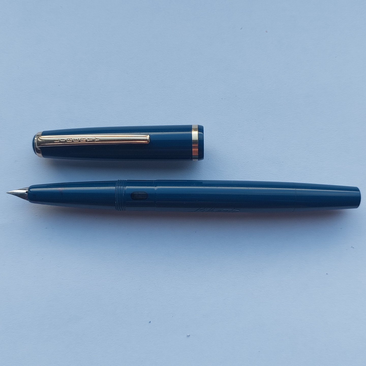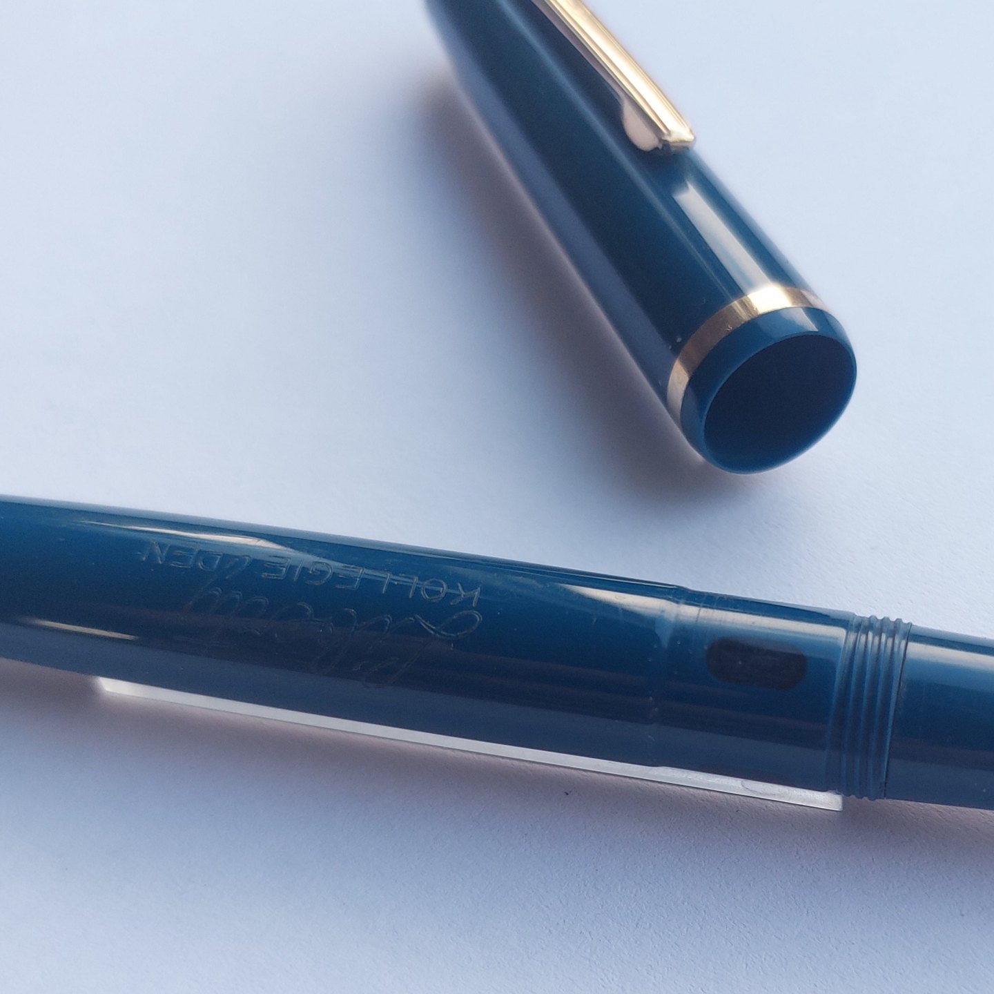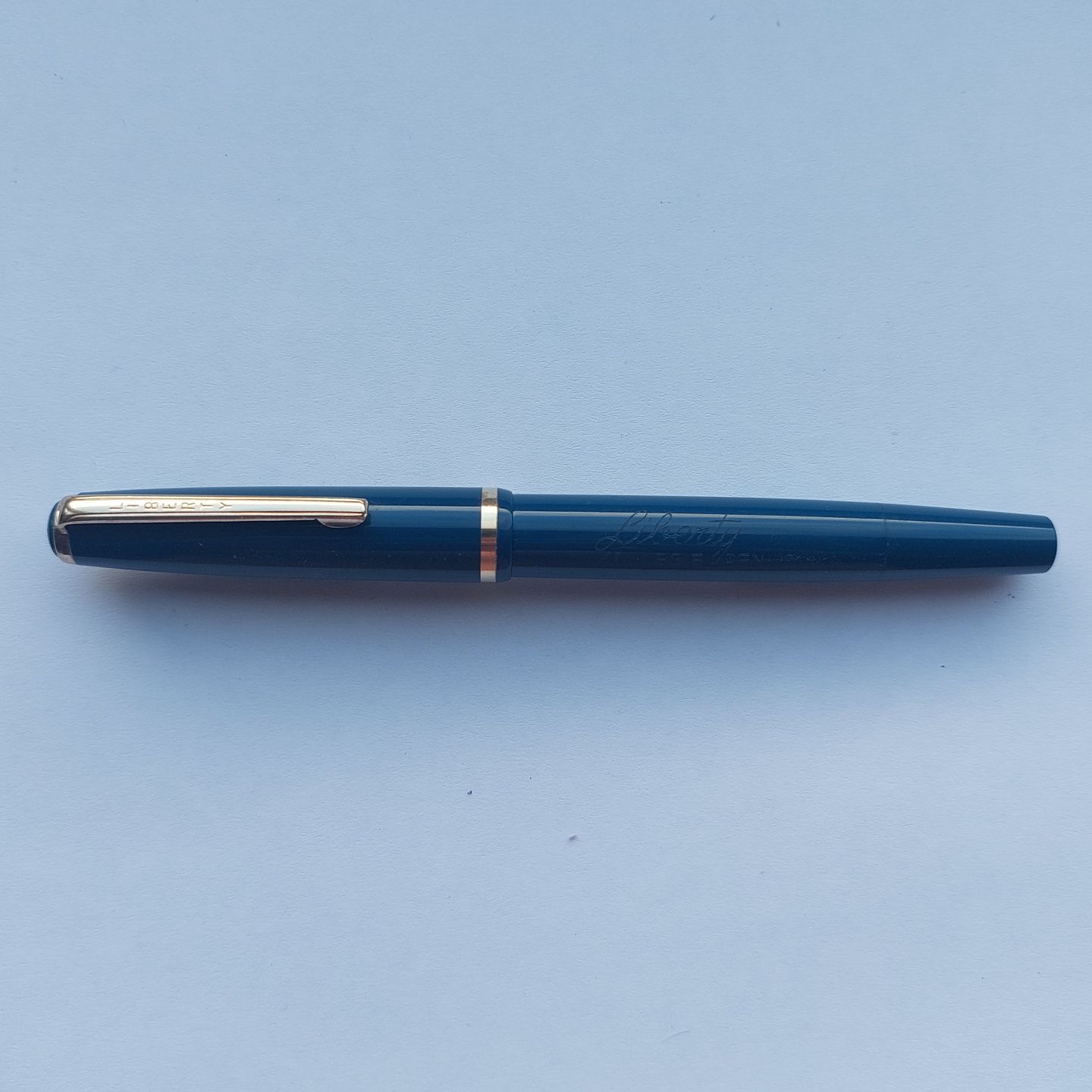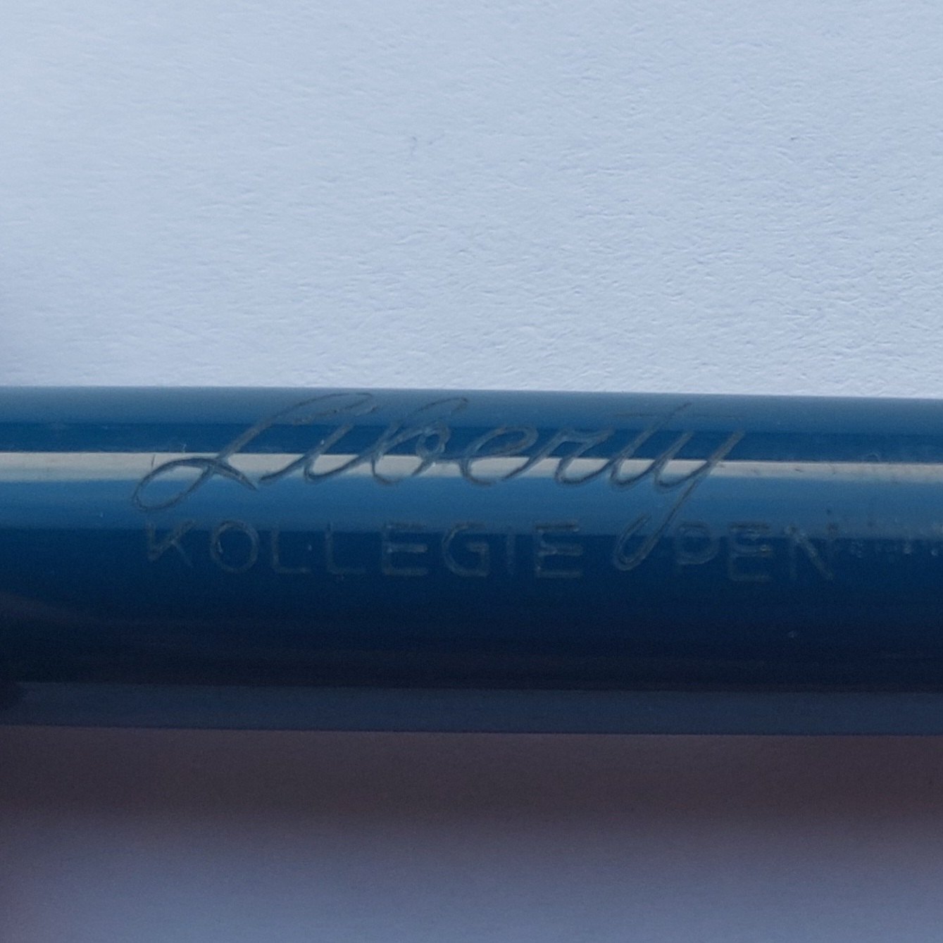 Blue Liberty Kollegie fountain pen with piston ink refill. Appears in very good condition and ready to be used. Manufactured in the 1960s. No damage or repairs. L. 13 cm