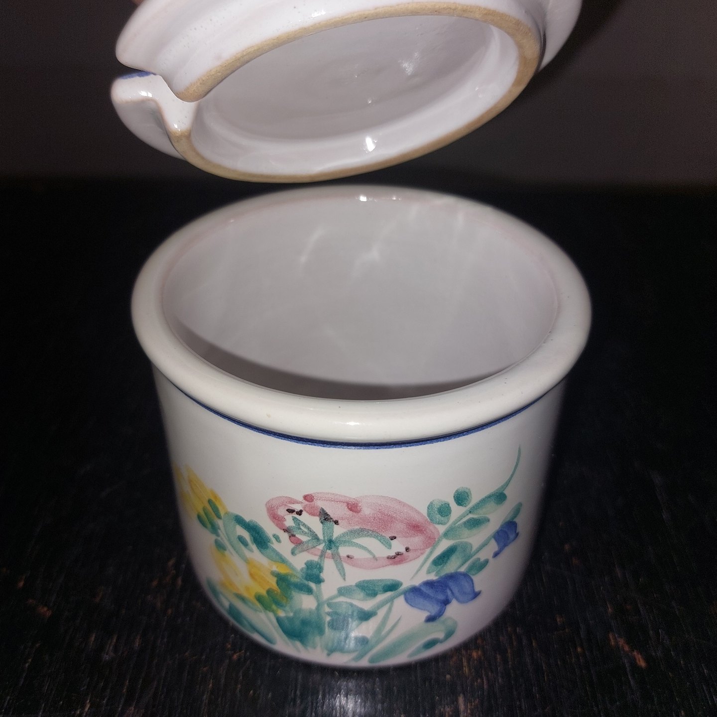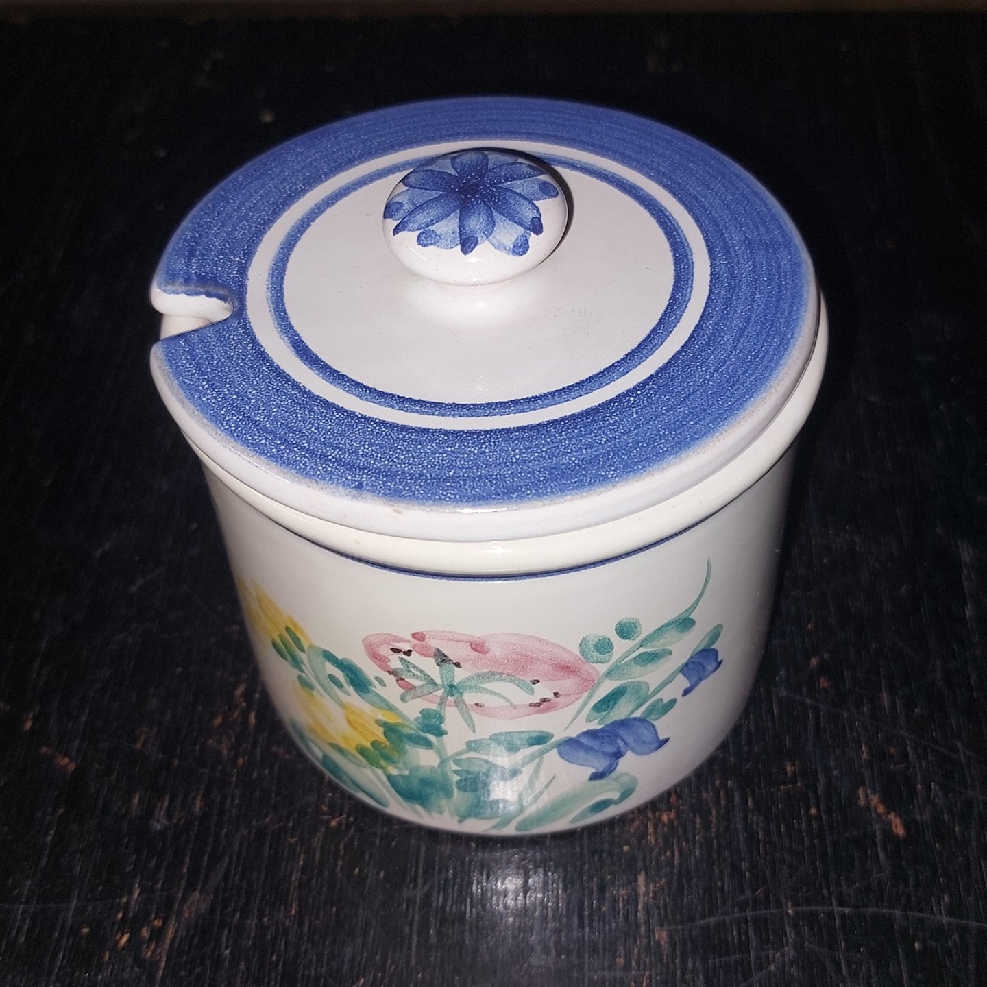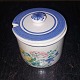 Rund marmeladekrukke i keramik med bemalet blomster på to sider med tilhørende låg. Fremstillet på Lars Syberg keramik værksted omkring 1960. I god stand uden skader eller reparationer. H. 9,5 cm