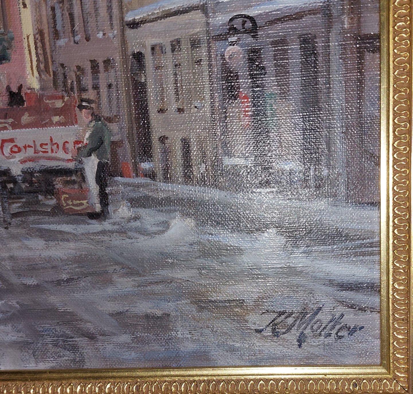 Olie maleri i guldramme. Motiv fra Magstræde i centrum af København. Malet af Kaj Molter (1903-1981). Fremstår i god stand uden skader eller reparationer, på hverken ramme eller lærred. Signeret af kunstneren i nederste venstre hjørne. Mål:.