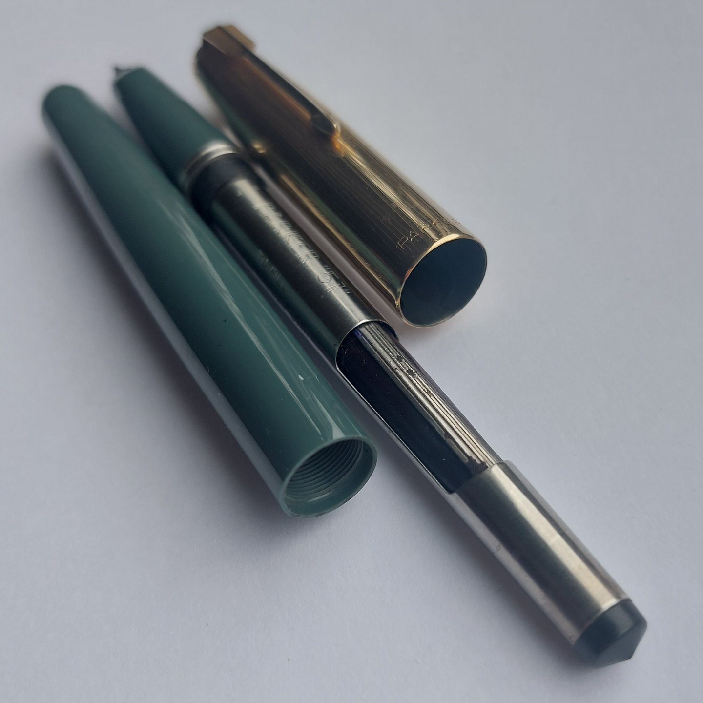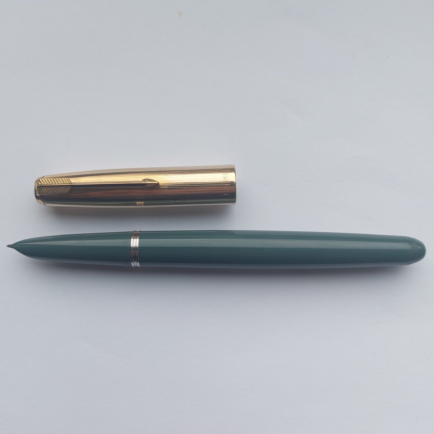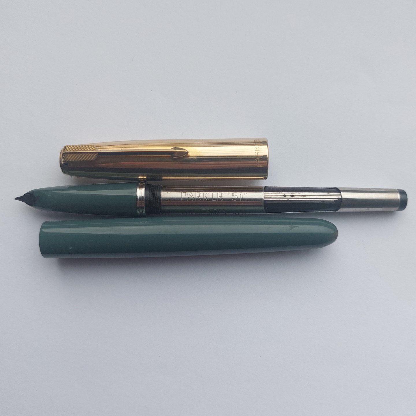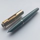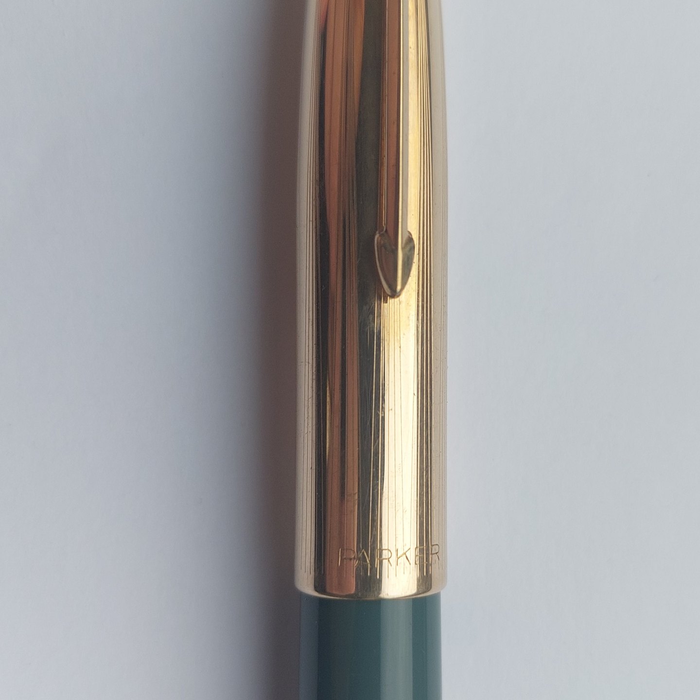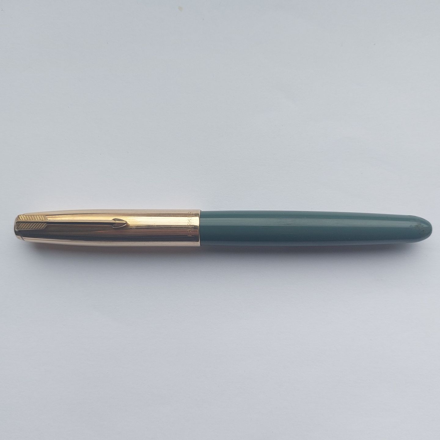 Gray Parker 51 fountain pen with gold double cap with pearl on top. Appears in good and functional condition. No damage or repairs. Made in the USA L. 13.5 cm