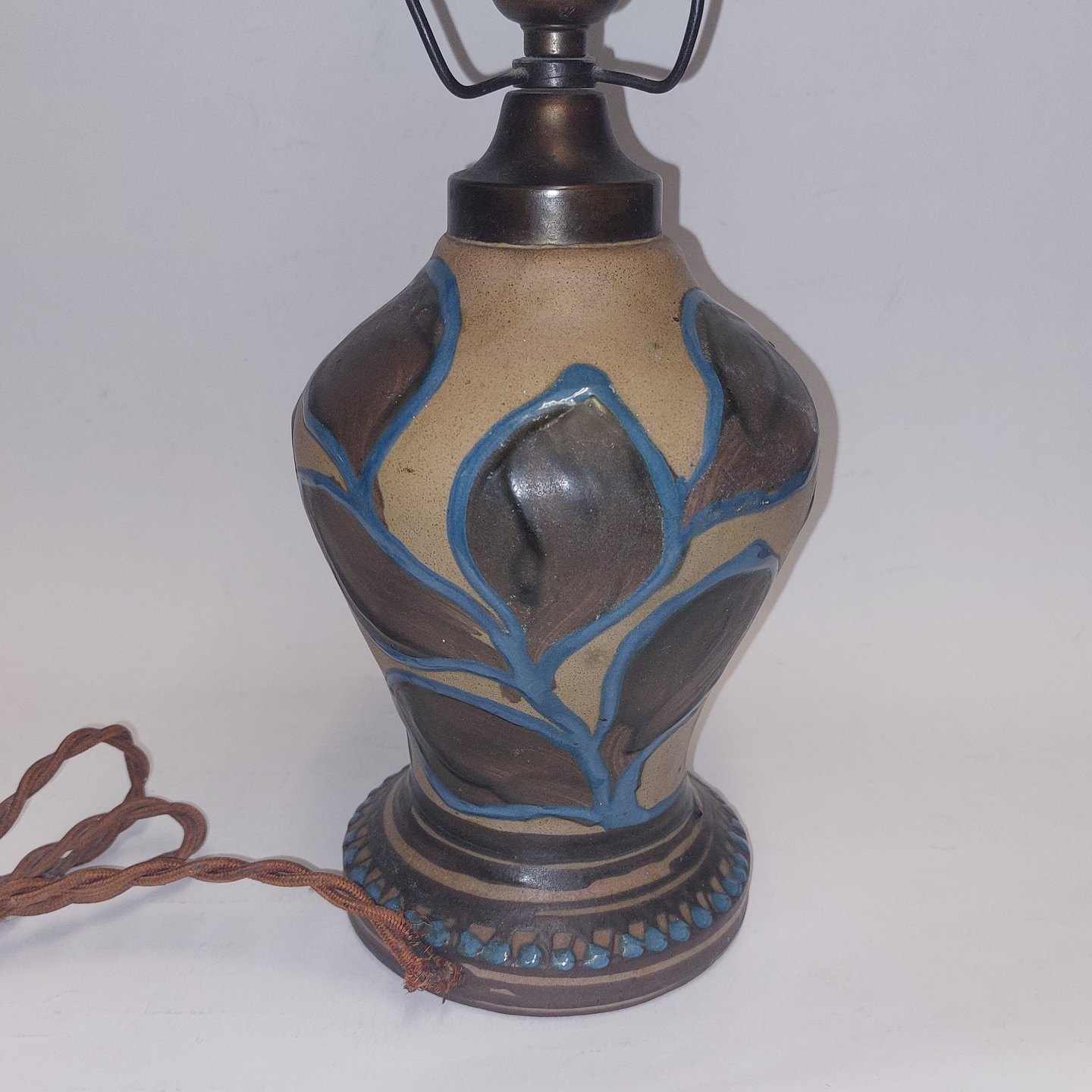 Ceramic table lamp from the Kahler ceramic factory in Næstved. Decorated with painted leaves. Appears in good condition with no damage or repairs. Factory mark on the underside. 20 and 45 cm high, respectively, including mounting. NEED NEW WIRING