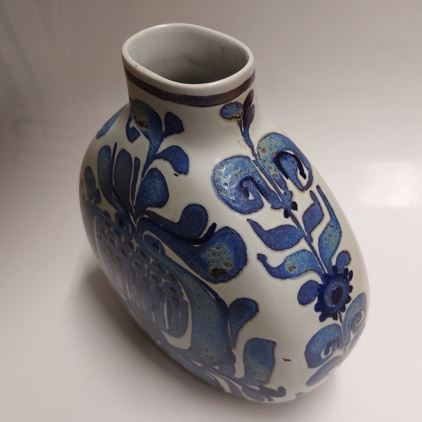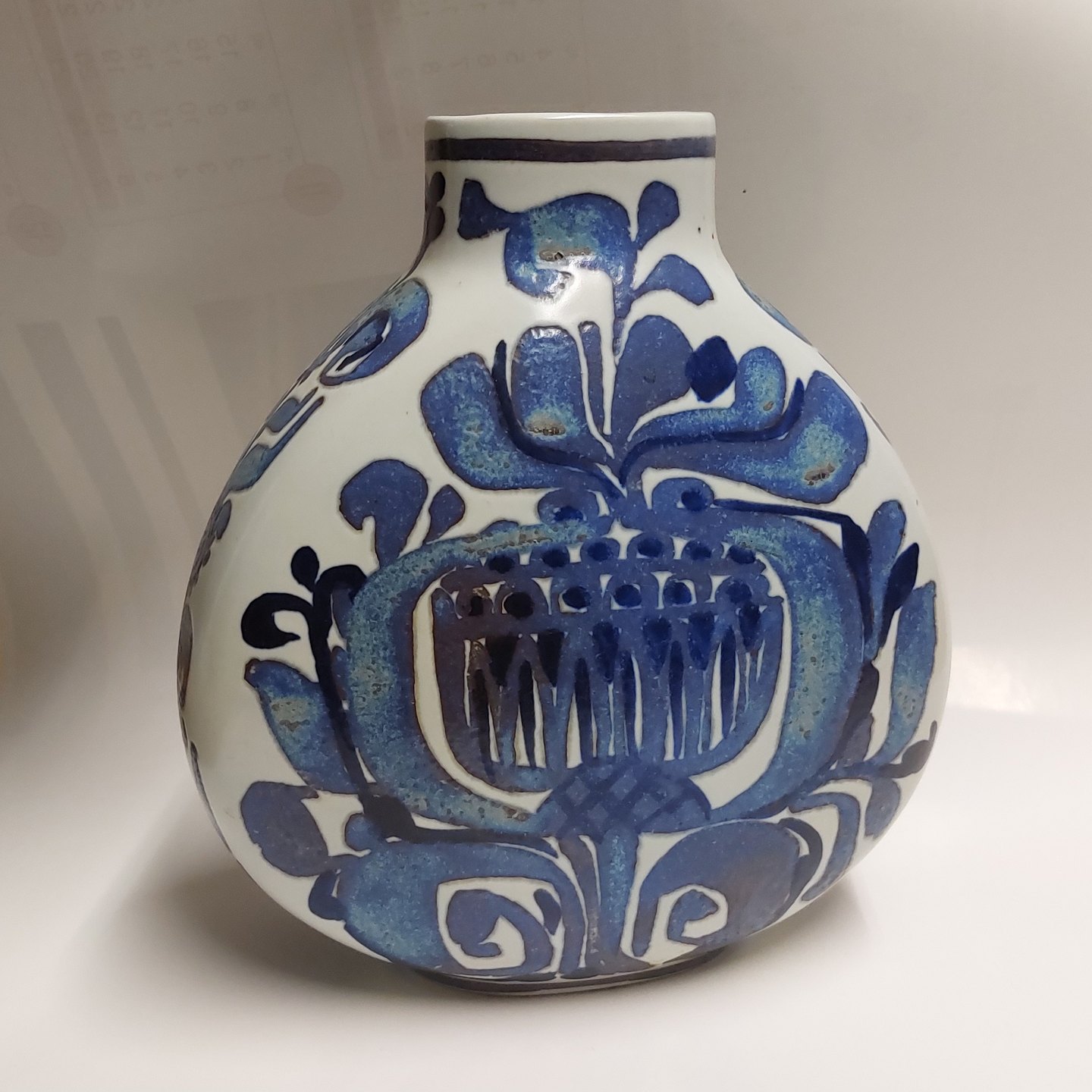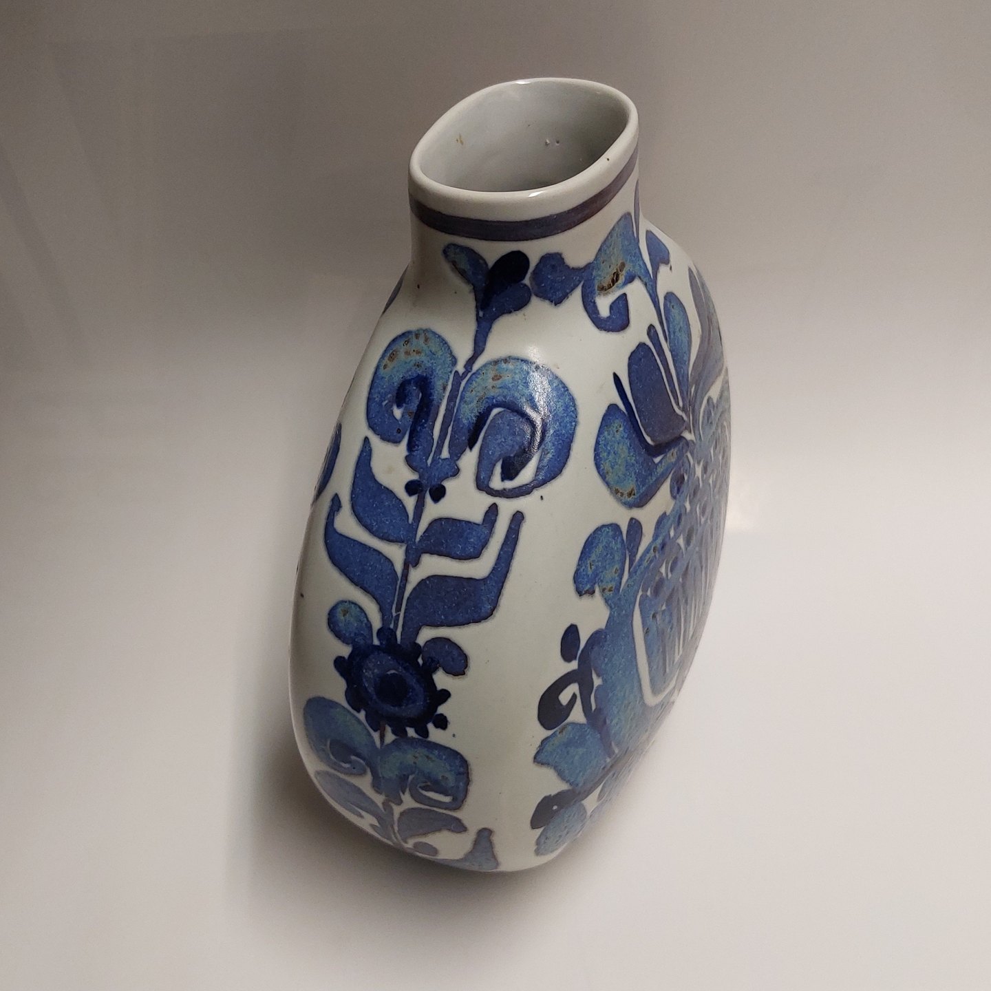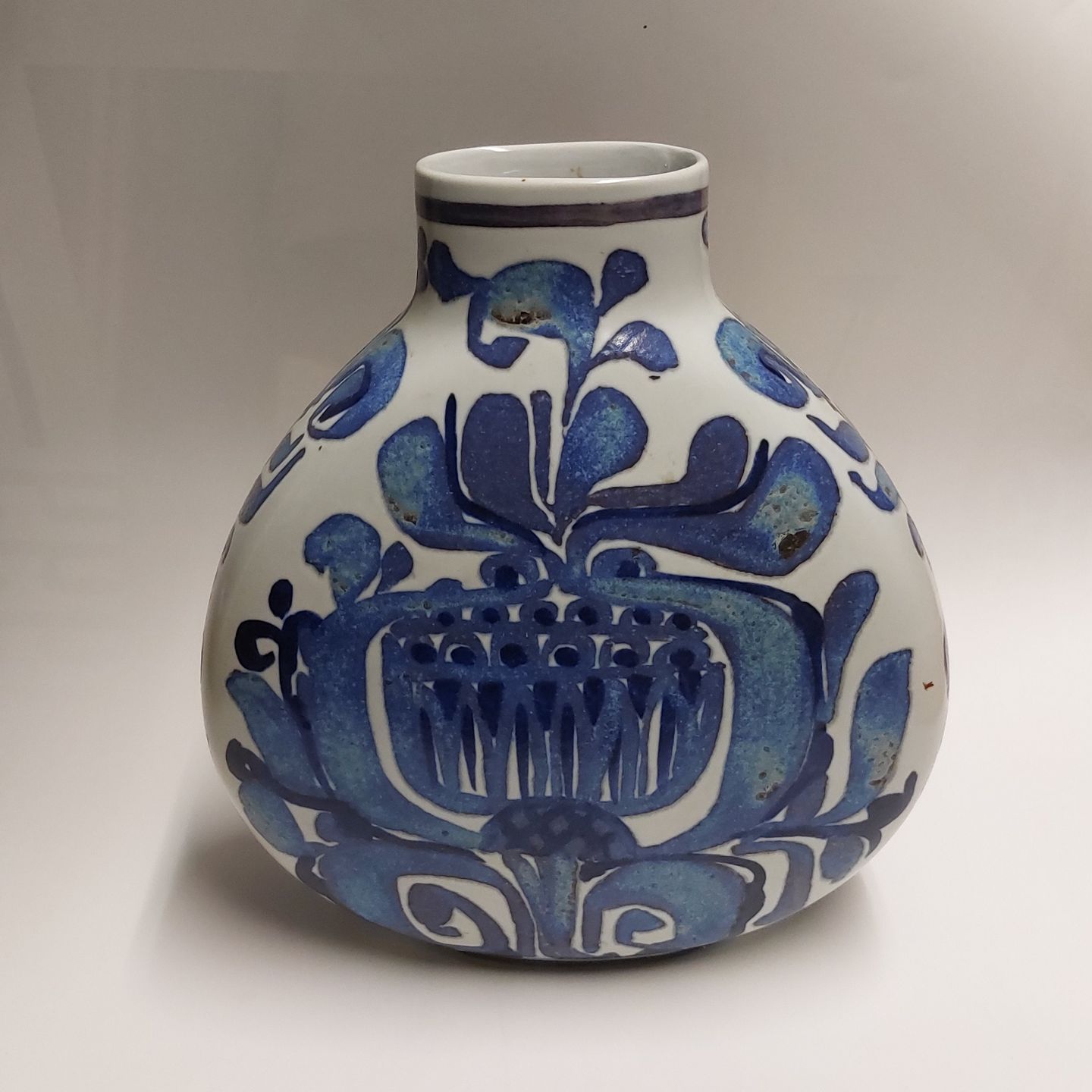 Baca fajance vase med blå dekoration. Designet af Cari Kristensen for Royal Copenhagen. Dekoreret nr. 427 / 3114. Fremstår I god stand uden skader eller reparationer. 1. Sortering. Mål: H. 21 cm B. 19 cm