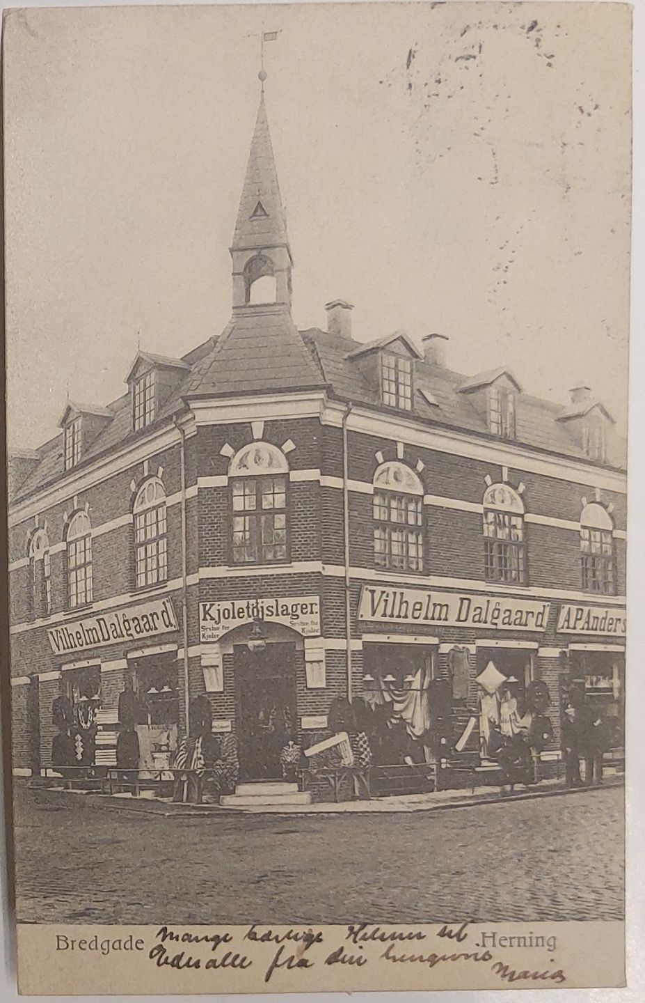 Postkort: Motiv med butiksfacade I Bredgade i Herning. Annulleret SKANDERBORG i 1907. I god stand.