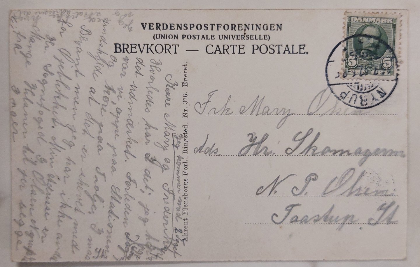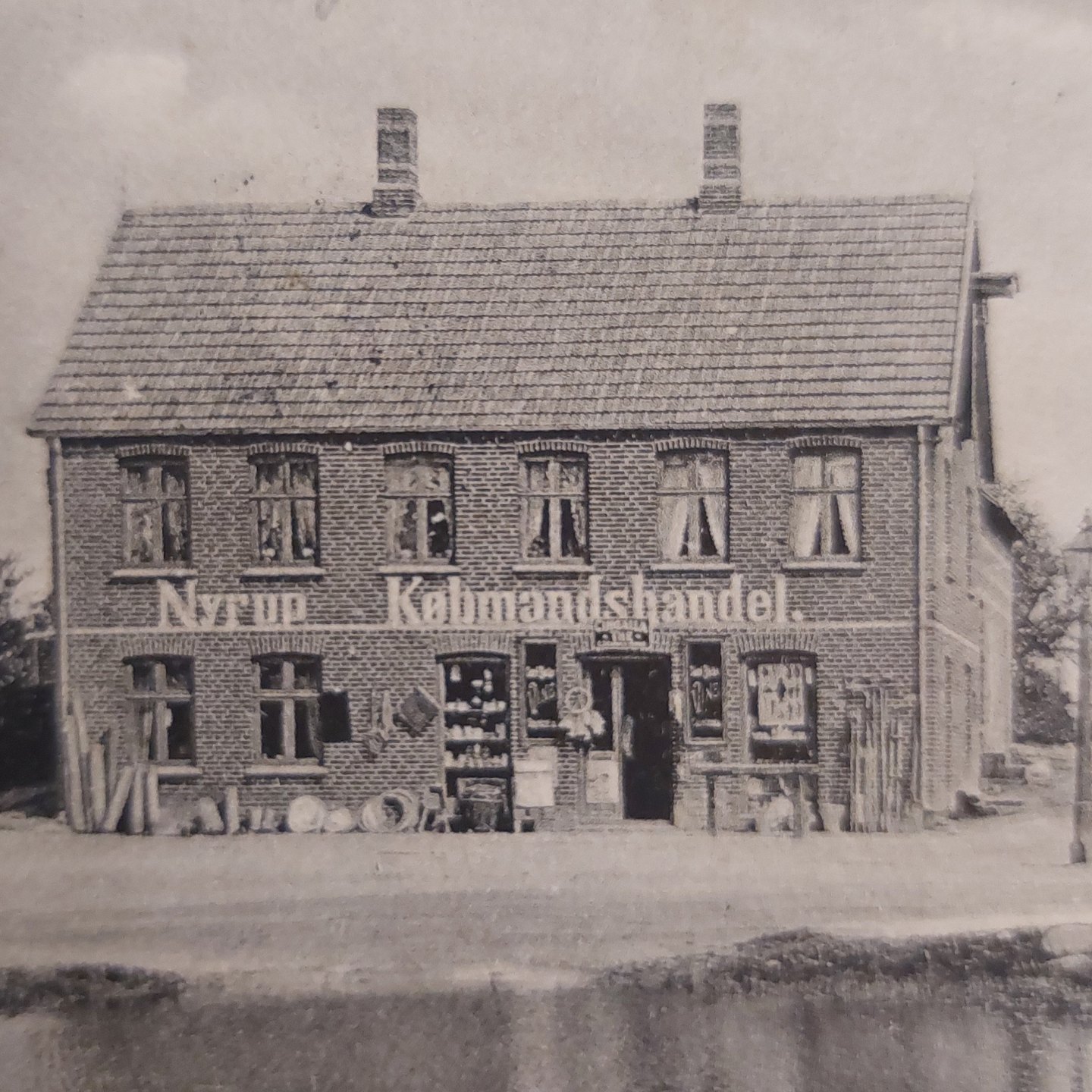Postkort: Motiv med Købmandshandlen i Nyrup. Annulleret NYRUP I 1912. I god stand