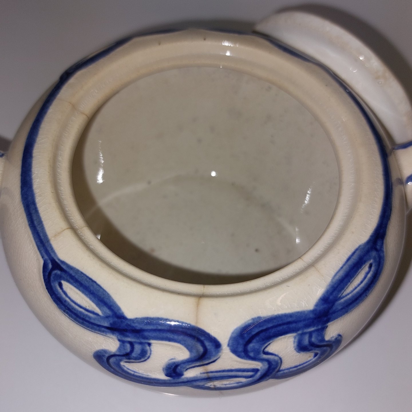 Villeroy & Boch:.Blå Olga sukkerskål med låg. Flere små "hår-revner" ved skålen åbning øverst. Det ene håndtag har et lille skår (se foto). Fabriksmærket på bunden. Mål: H. 10,5 cm Fra øre til Øre 16 cm